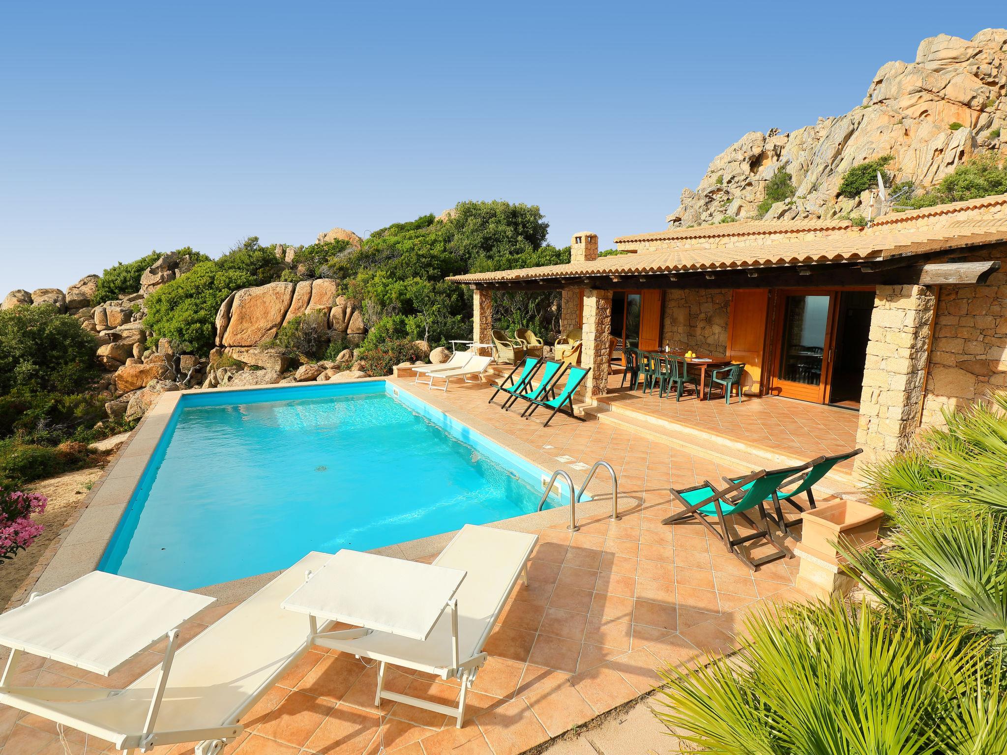 Large, comfortable villa "Petra Rossa". In the hamlet Costa Paradiso, in a quiet, sunny position on top of a hill, 4 km from the sea, in a cul-de-sac. Private: property 3'400 m2, swimming pool (5 x 10 m, depth 150 cm, seasonal availability: 01.May. - 17.Oct.). Motor access (via unmade road). Parking. Grocery 2.5 km, supermarket 2.5 km, restaurant 2.5 km, bus stop 6 km, sandy beach "Li Cossi" 5 km. Nearby attractions: Isola Rossa 18 km, Vignola mare 18 km, Aquafantasy 16 km, Santa Teresa 38 m, Alghero 107 m. Please note: car recommended. Animals in the neighbourhood.
