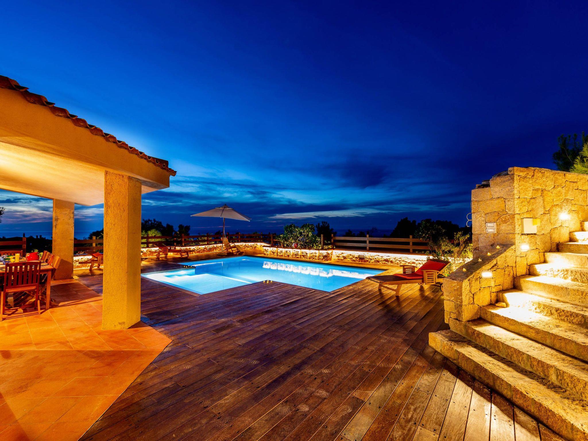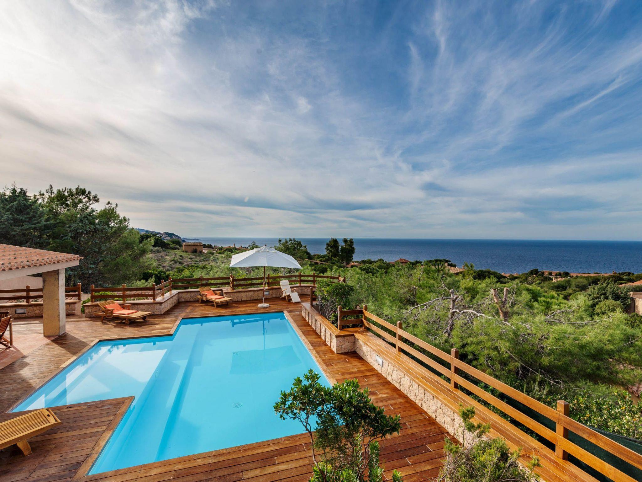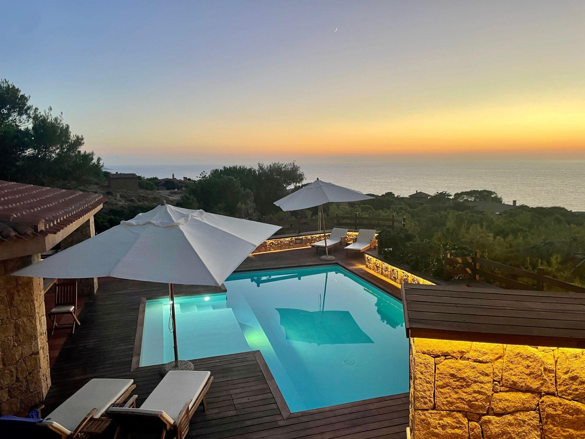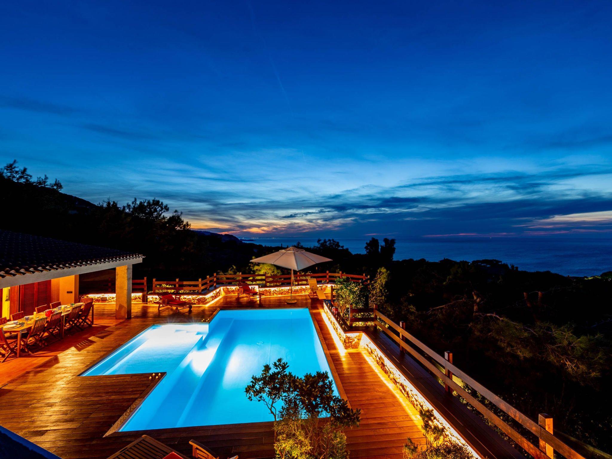 The villa enjoys a fantastic outdoor area with a private sea-view pool and wellness waterfall