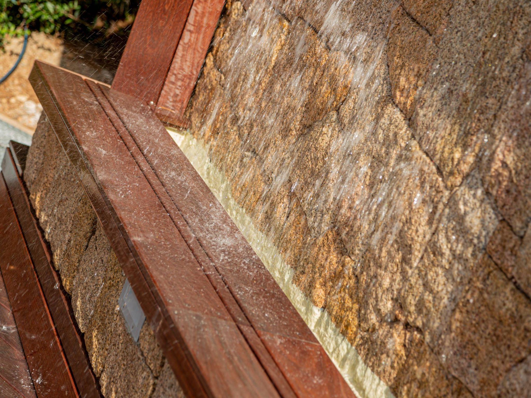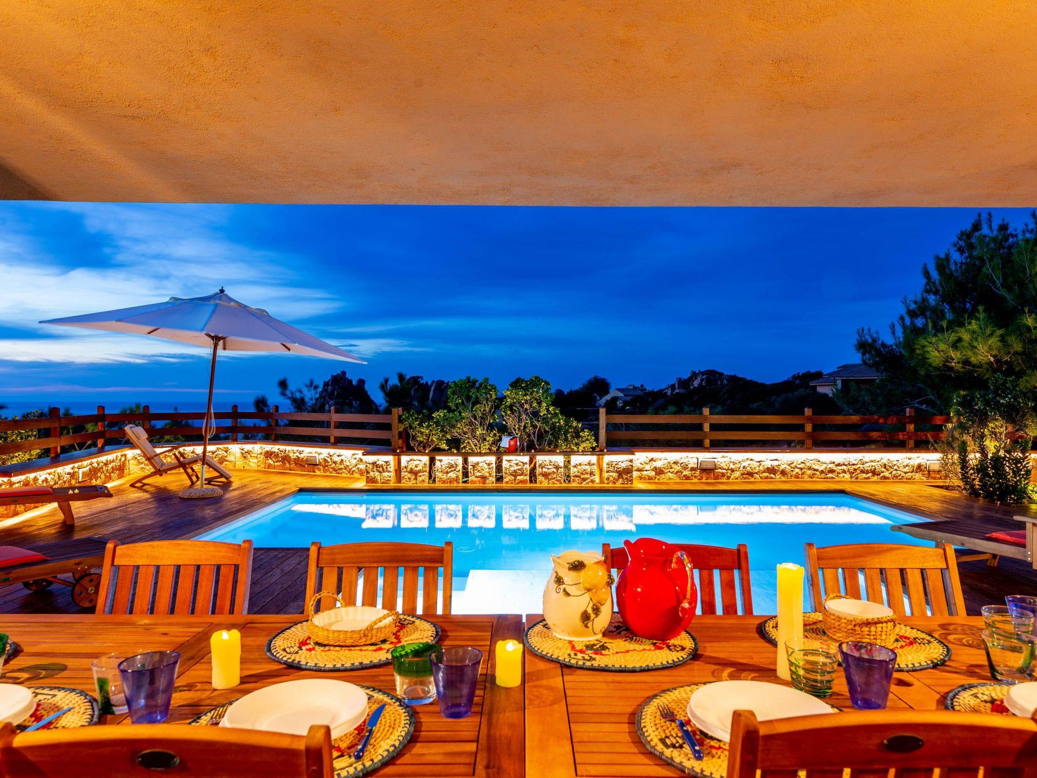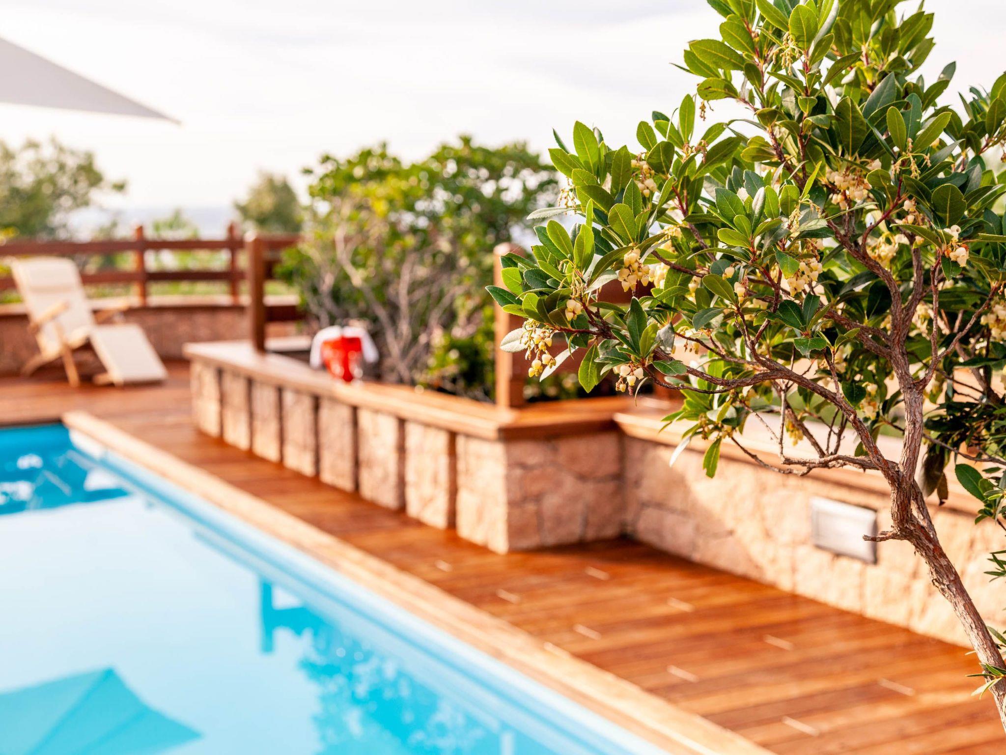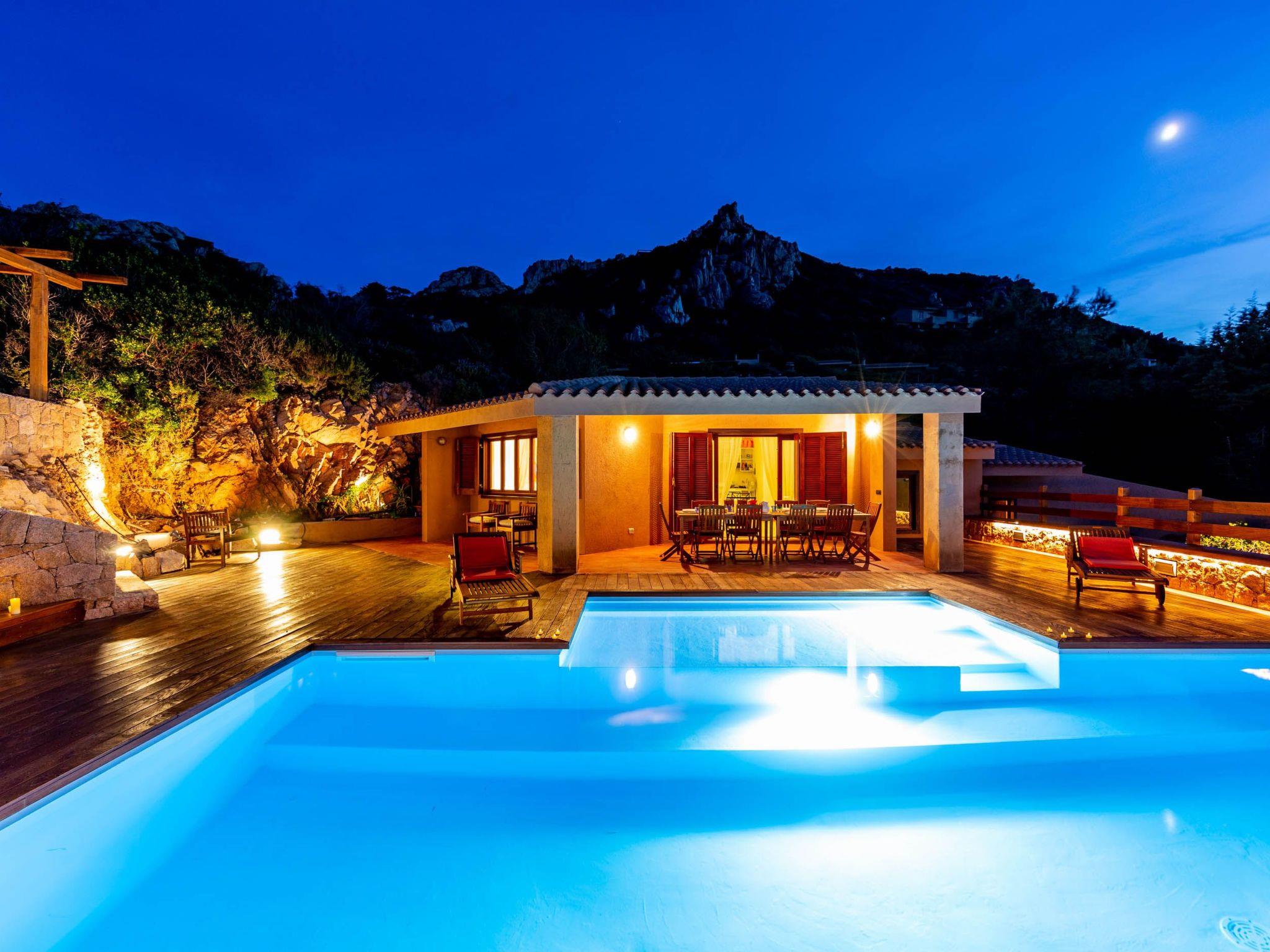 The villa enjoys a fantastic outdoor area with a private sea-view pool and wellness waterfall