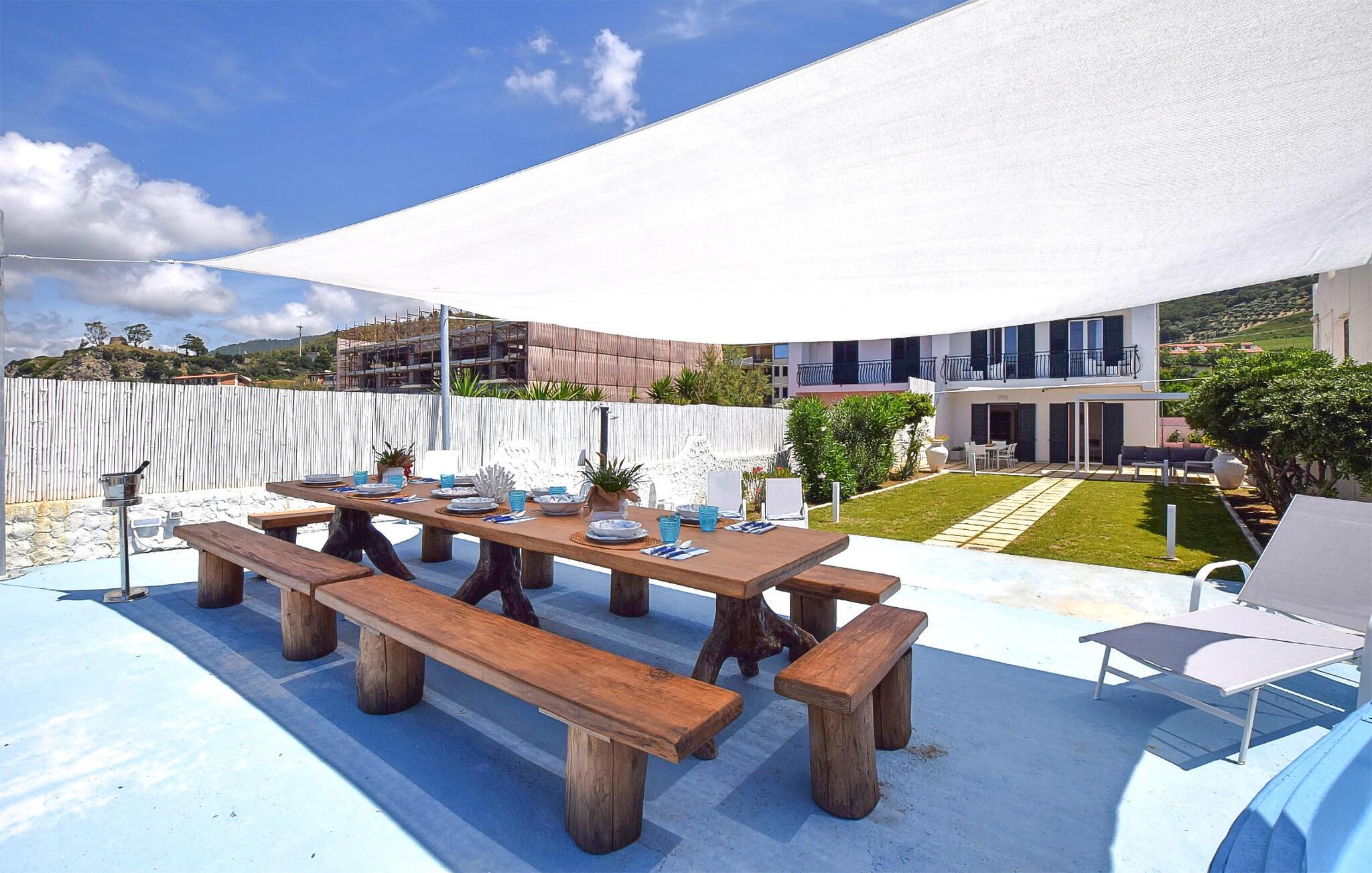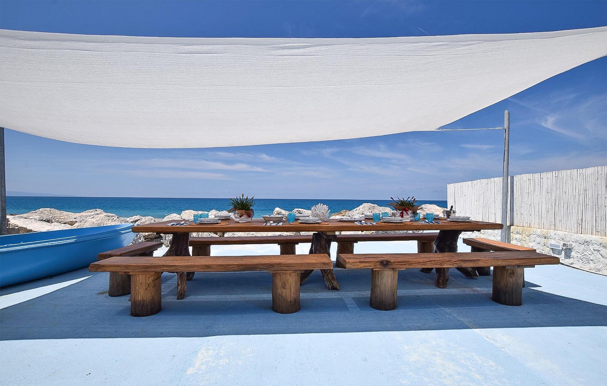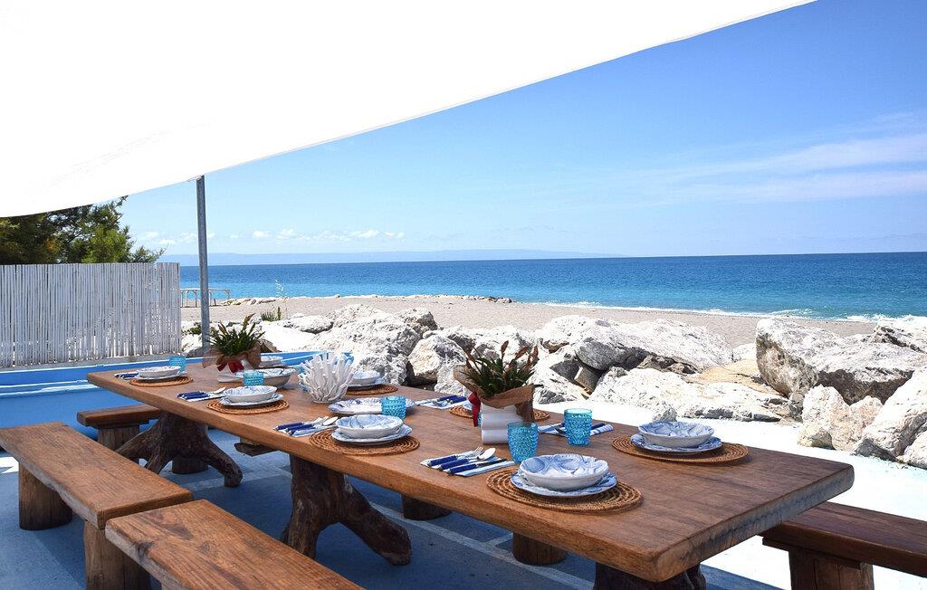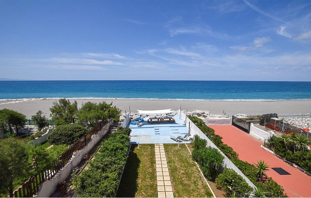 Nyd en dejlig ferie i dette fortryllende feriehus ved stranden. I kan næppe være tættere på stranden end i denne rummelige og komfortable villa – Det Tyrrhenske Hav ligger lige for jeres fødder. Det lyse og smagfuldt indrettede interiør byder på masser af plads til venner eller familie – glæd jer til sjov madlavning med venner, hyggelige måltider og hyggelige aftener foran fjernsynet. Jeres have grænser op til stranden – så I kan forfriske jer i havet og vende tilbage til jeres skyggefulde område under teltet for kølige drinks og stemningsfulde måltider. Om aftenen kan I tænde grillen og lytte til den blide lyd af bølgerne med vin og stearinlys. Gå en tur gennem den charmerende gamle bydel i Pizzo og prøv den berømte Tartufo-is, besøg det imponerende Castello Murat, eller tag en bådtur langs den maleriske kyst i Tropea med dens turkisblå bugter. Vandr gennem naturparken Serre og nyd regionale specialiteter i en hyggelig trattoria.