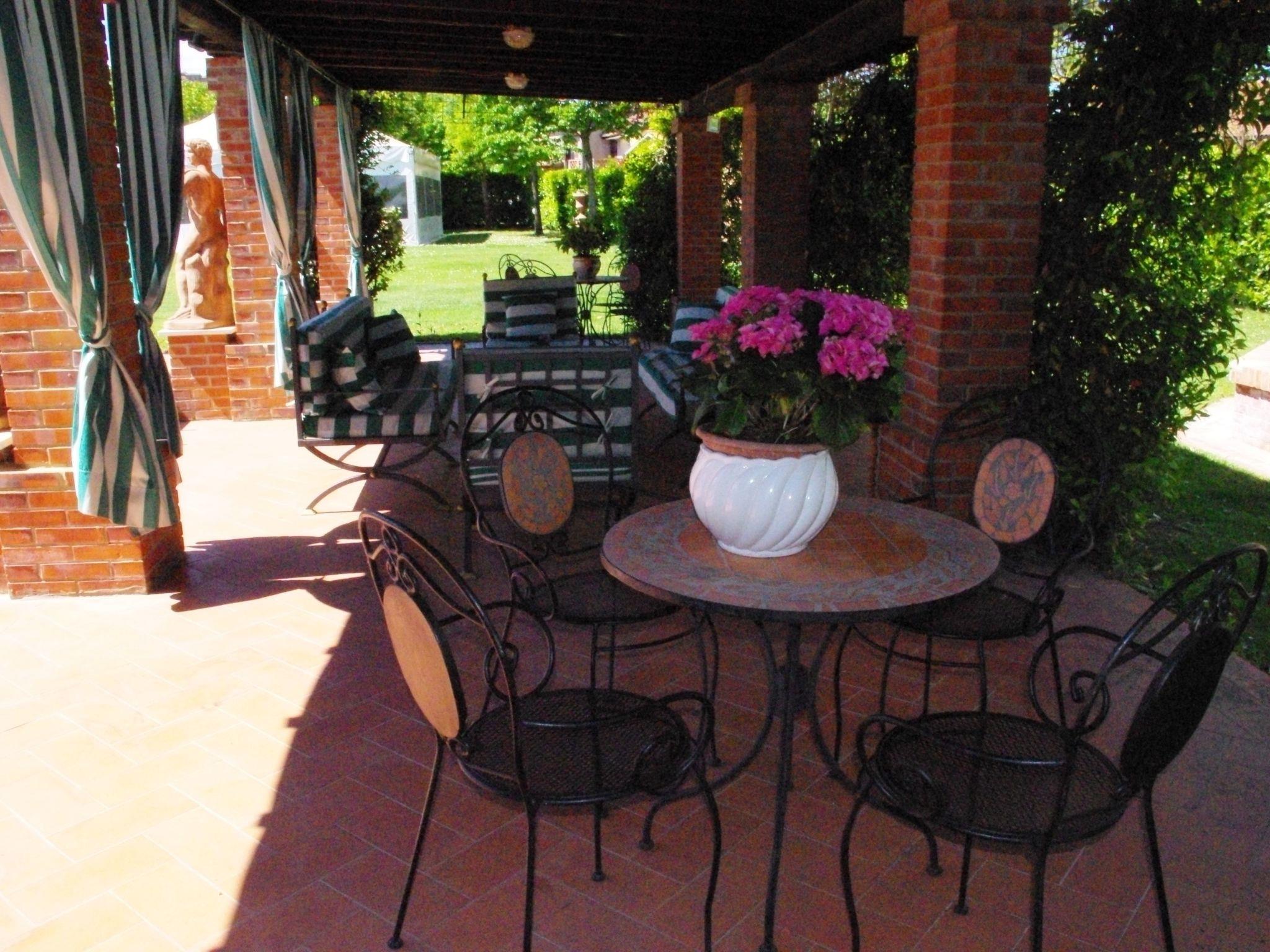 The villa has 4 spacious and comfortable bedrooms, which can accommodate up to 10-12 people. On the living area there is a large living room with sofas, satellite TV, elegant seating, a large fireplace with seating at the sides and a table for 12 persons. On the ground floor there is also a large fully equipped kitchen with a table for 12 persons. Next to the kitchen there is a covered veranda used in the summer for dining in a cool and comfortable place with a large table and chairs for 26 persons. There are 6 bathrooms, one on each floor of the villa and 3 external bathrooms in the dependence.