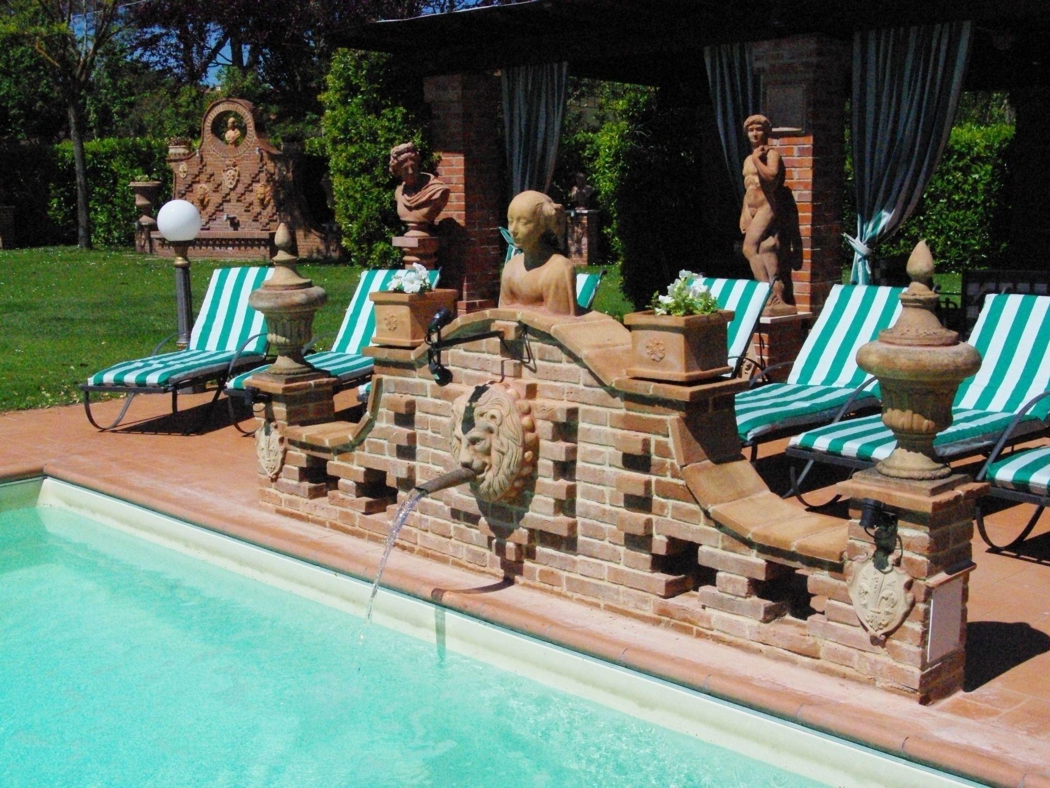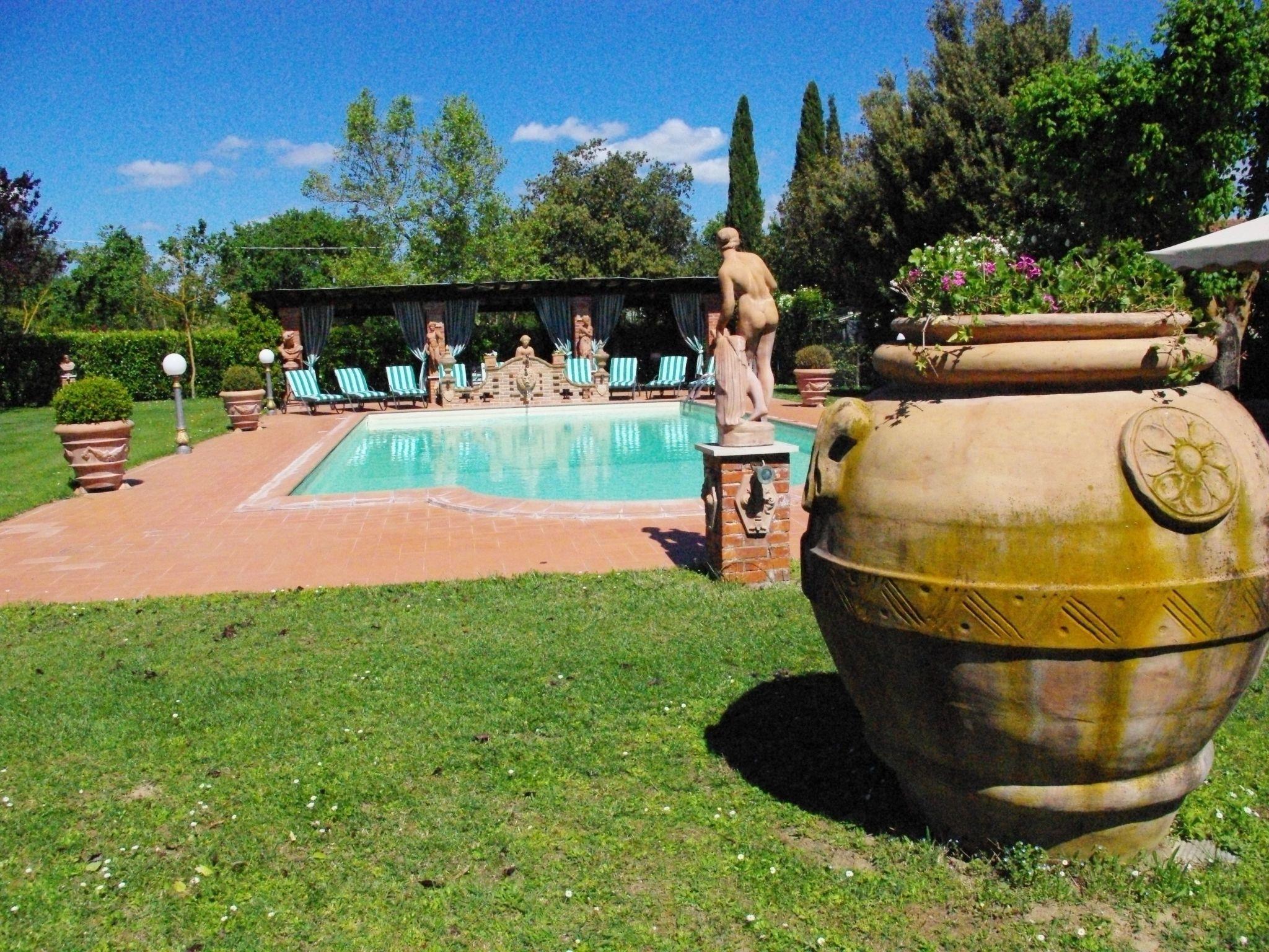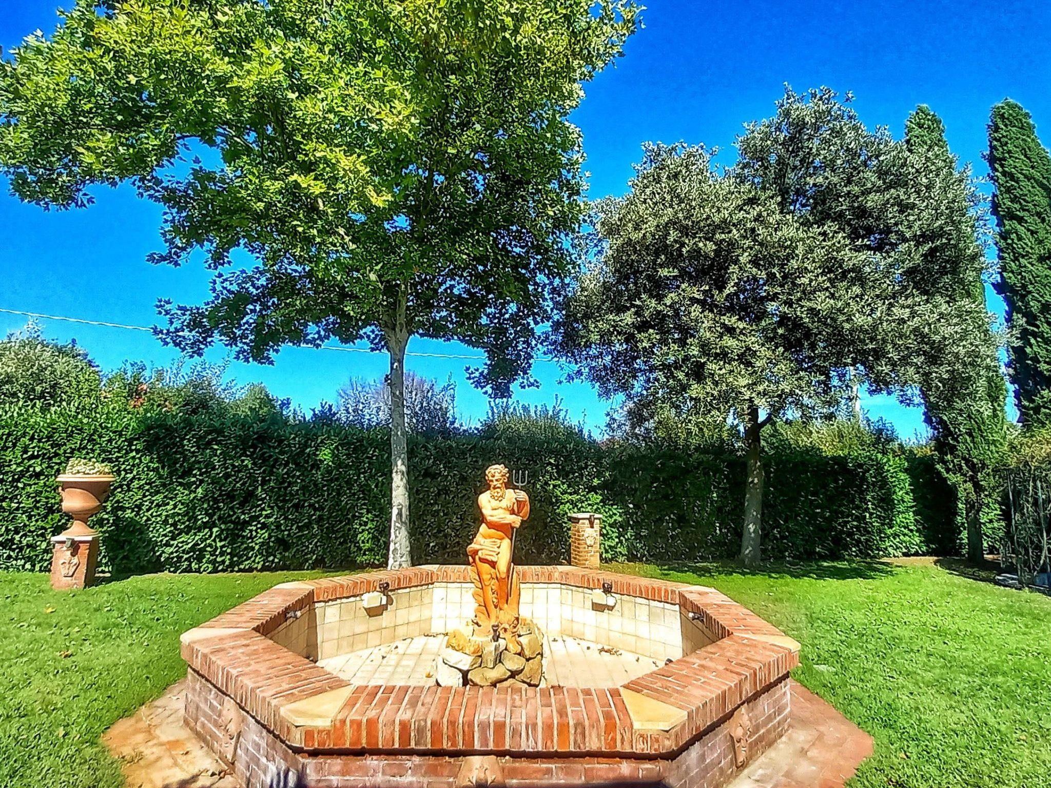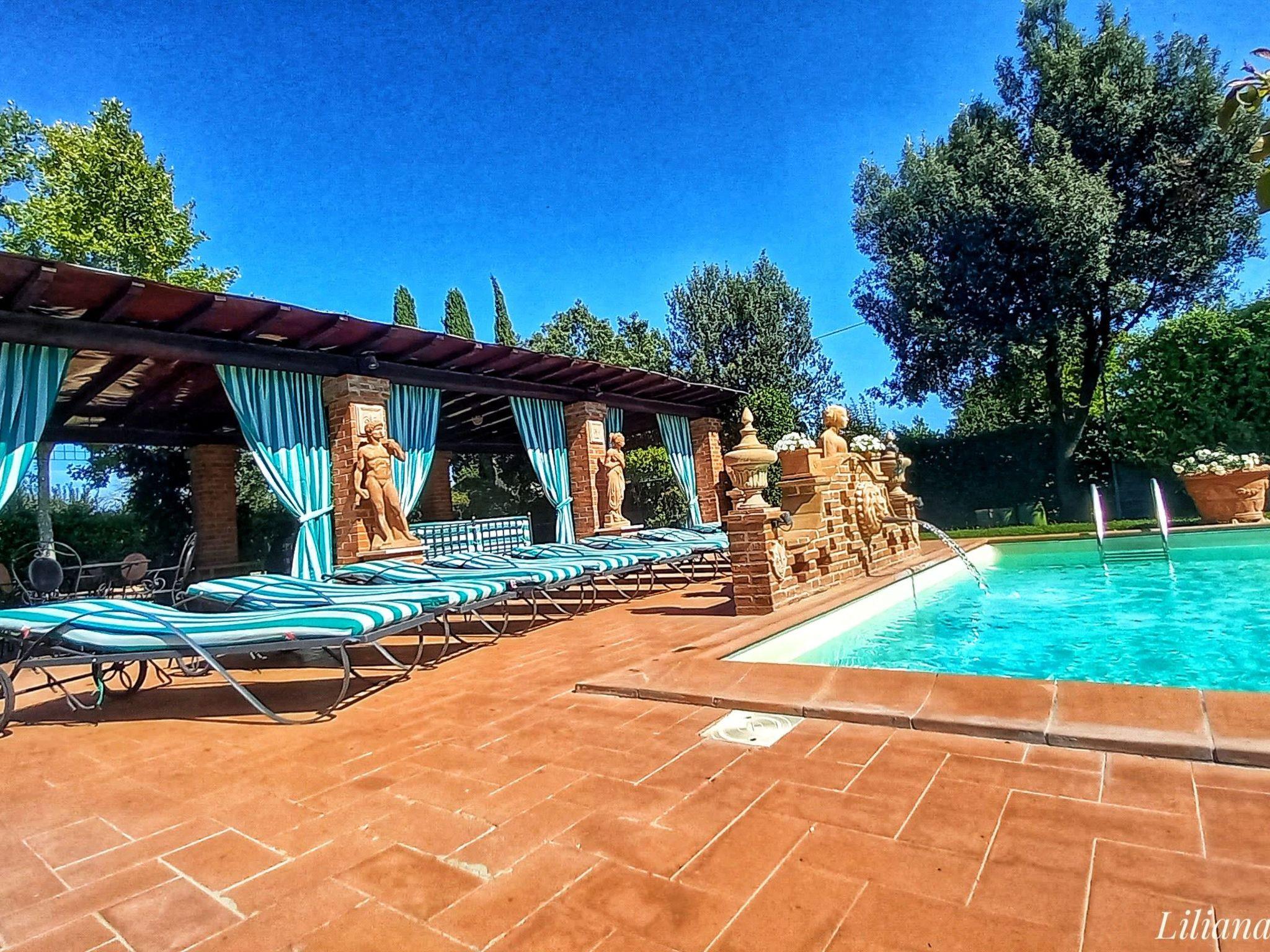 This fabulous villa in the province of Arezzo invites guests to relax and unwind in the nature of the Tuscan countryside, characterised by green hills, golden sunshine, sublime wine and unique cuisine. Guests can request transfers to and from the airport, guided tours, meals, cooking classes and other activities, such as fishing, golf, horse riding, mountain biking and much more. The villa was built in 1921, and has undergone some renovations and extensions over the years in order to offer all modern comforts. Just outside the villa is the beautiful swimming pool surrounded by classic Italian gardens and sculptures. There are also two barbecue spots, a 6-seater Jacuzzi and an 8-seater Finnish sauna next to the pool that can be enjoyed by guests exclusively throughout the year. There are also numerous gazebos and sun loungers. There is also a large octagonal fountain and another gazebo with table and chairs. The property also offers a table tennis table, table football or table football, fitness equipment, 7 mountain bikes for adults and 4 mountain bikes for children to be used freely by guests, and a children's playground area. The villa is divided into two large three-bedroom flats with a 26-centimetre vertical solid brick partition wall. One of them is occupied by the owner, who has his own driveway gate and independent door to ensure maximum privacy for guests, who have exclusive use of the entire garden, swimming pool, sauna and whirlpool bath.