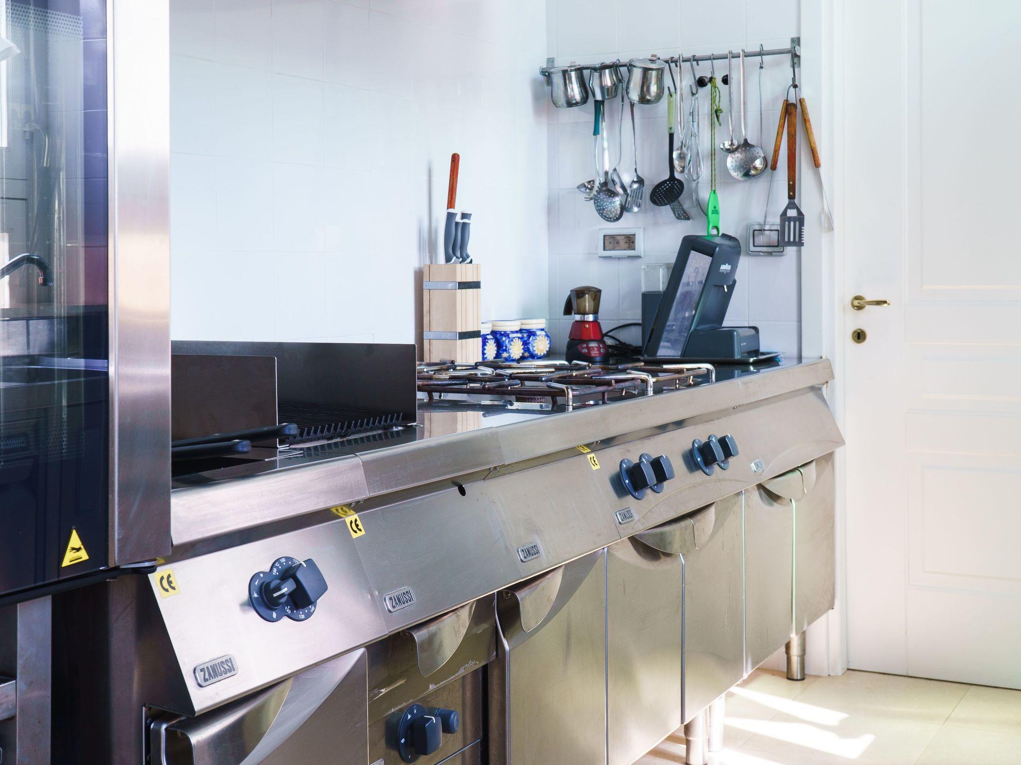 The villa has a living area of 450 square metres on two floors. It consists of five bedrooms with en-suite bathrooms, an industrial kitchen, a large living room with sofas and a bar area, a TV area with a fireplace, a winter garden, a desk area and a large dining room. There are also two service bathrooms.