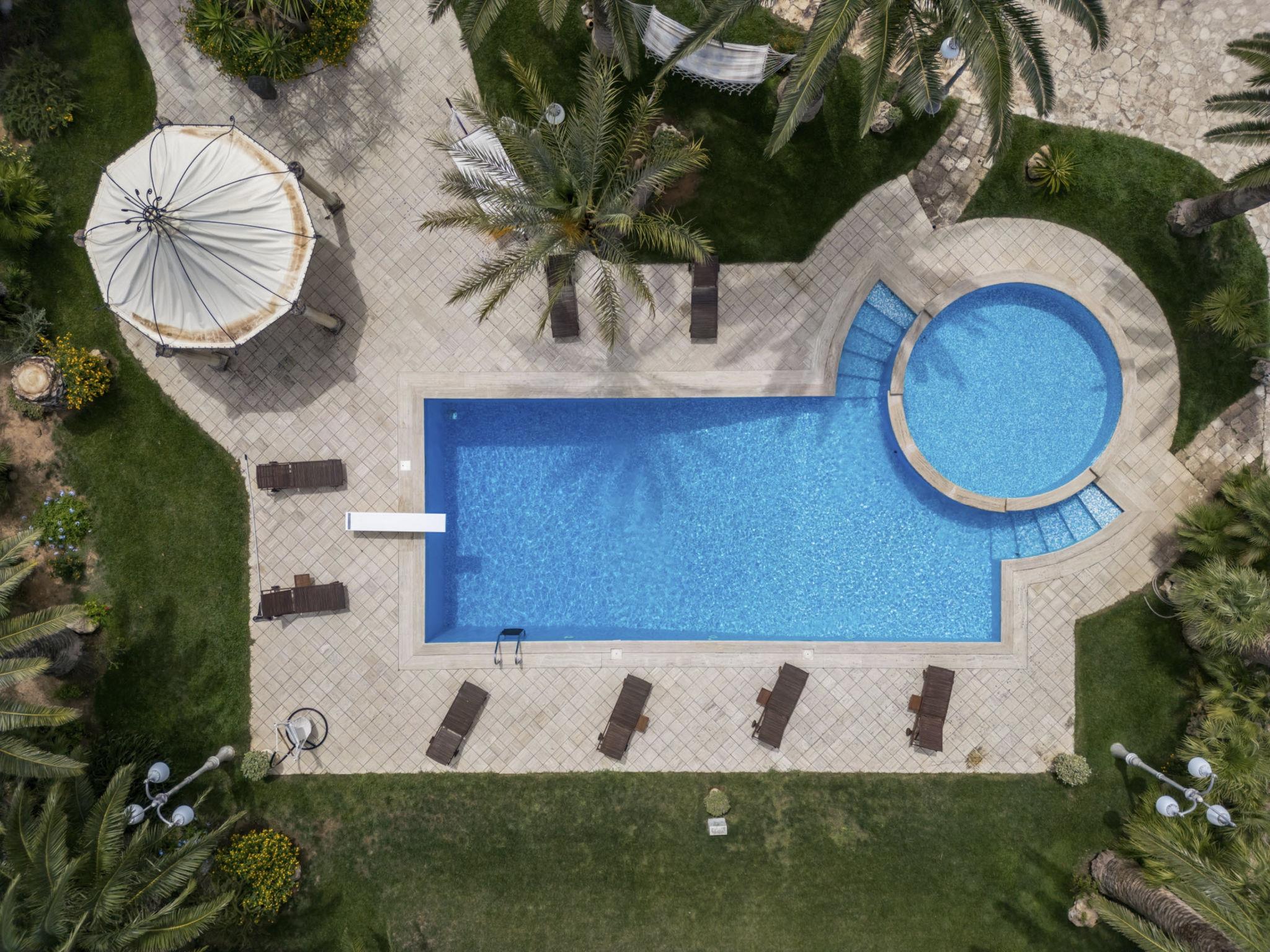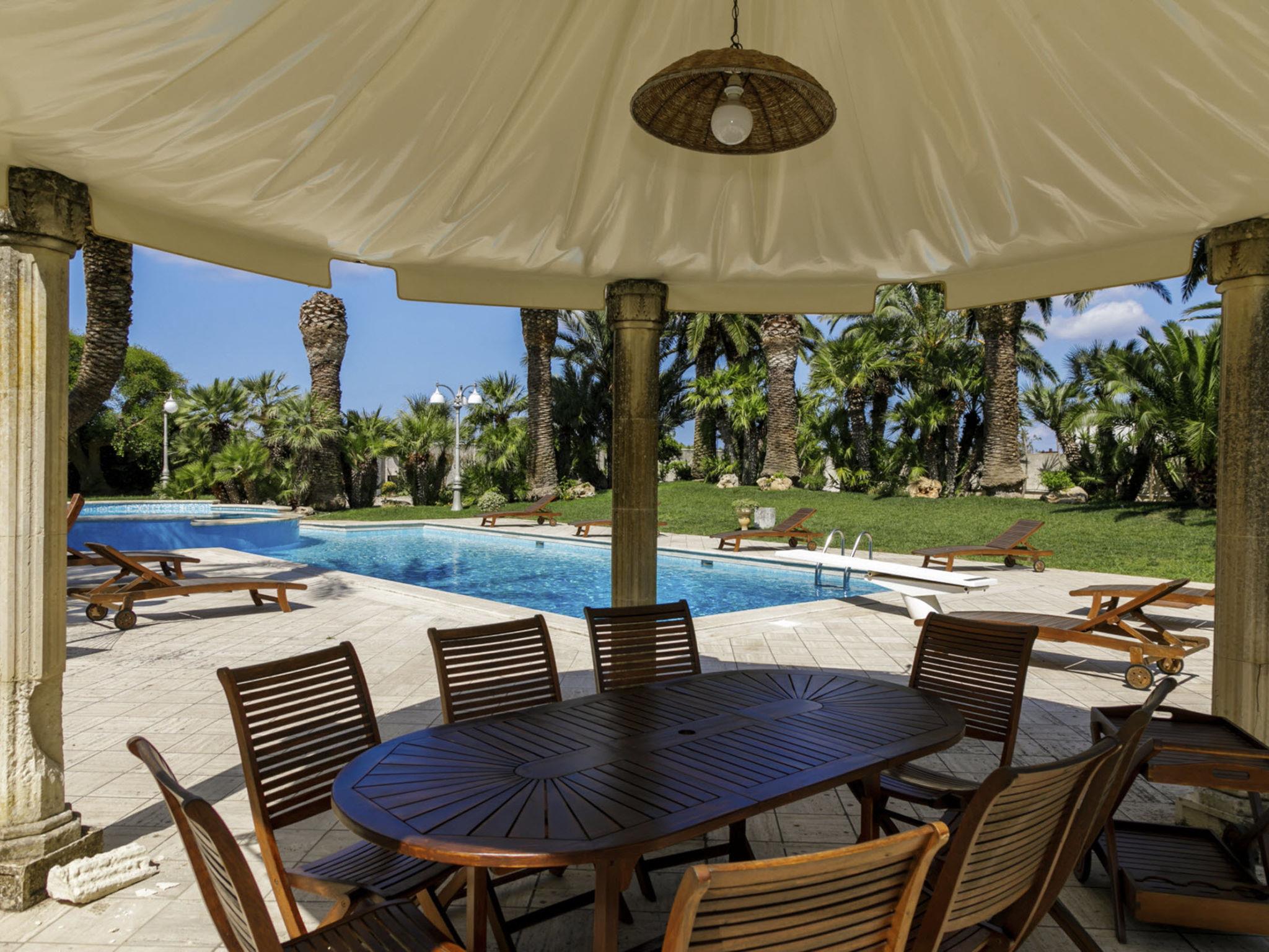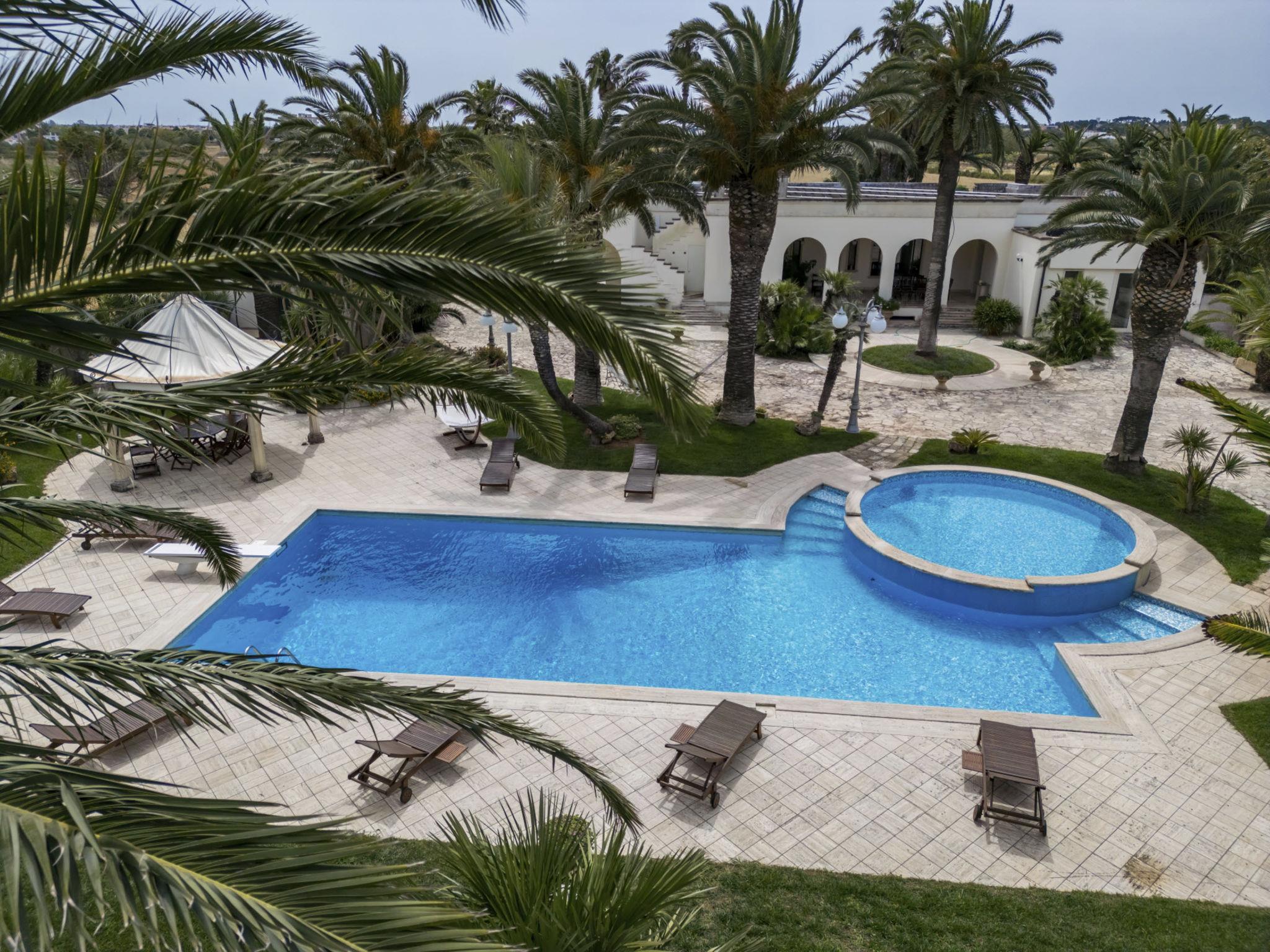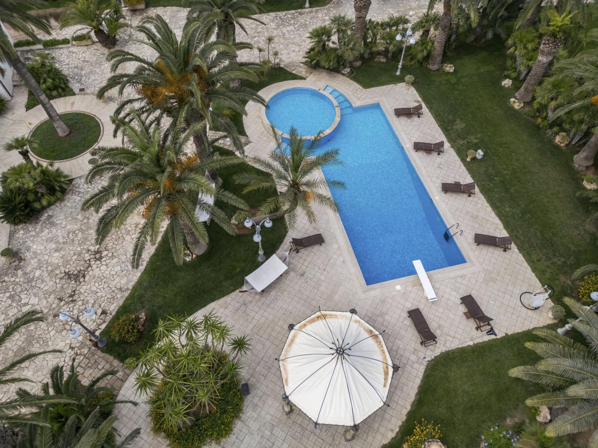 Luxurious, historical villa "Incoronata", surrounded by trees and fields. 1 km from the centre of Nardò-Città del Barocco Leccese, 15 km from the centre of Gallipoli, 24 km from the centre of Lecce, in a quiet, sunny position, 3 km from the sea, 3 km from the beach, in the countryside. Private: property (fenced), large, beautiful, well-kept garden 6'000 m2 (fenced) with flowers and trees, lawn for sunbathing, swimming pool with privacy (6 x 14 m, depth 90 - 270 cm, seasonal availability: 01.Apr. - 31.Oct.). Shower/WC in the pool area, paddling pool, outdoor shower, pergola, garden furniture, barbecue, pool maintenance by the owner/gardener. Linen change (suppl. charge extra). Towel change (suppl. charge extra). Parking on the premises. Shop, supermarket 700 m, restaurant 3 km, bar, bakery, bus stop 700 m, railway station "Nardò" 3 km, sandy beach "Santa Caterina" 3 km, rocky beach "Porto Selvaggio" 3 km. Tennis, sports centre 400 m. Nearby attractions: Melpignano- Città della Taranta 40 km, Otranto 60 km, Santa Maria di Leuca- Punta Sud Puglia 60 km, Alberobello 143 km, Polignano a Mare 149 km, Matera 162 m. Hiking paths: Parco Naturale Porto Selvaggio 25 km, Parco Naturale Terra delle Gravine 119 km, Grotte carsiche di Castellana 155 km. Please note: car recommended. In the basement of the villa is a separate, unoccupied apartment. The children's pool is 90 cm deep.