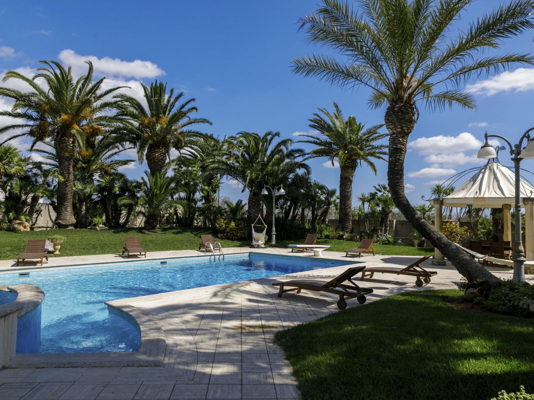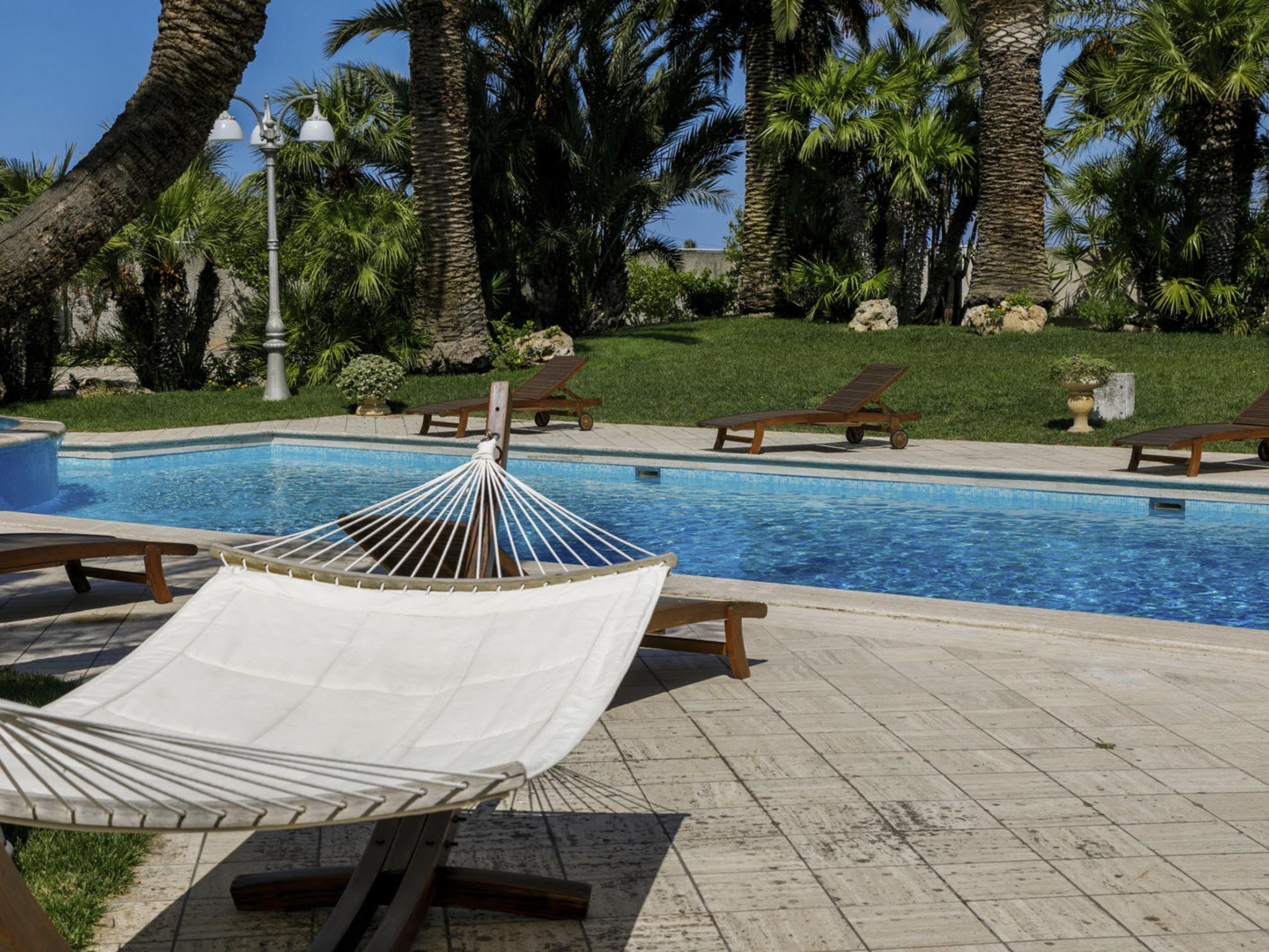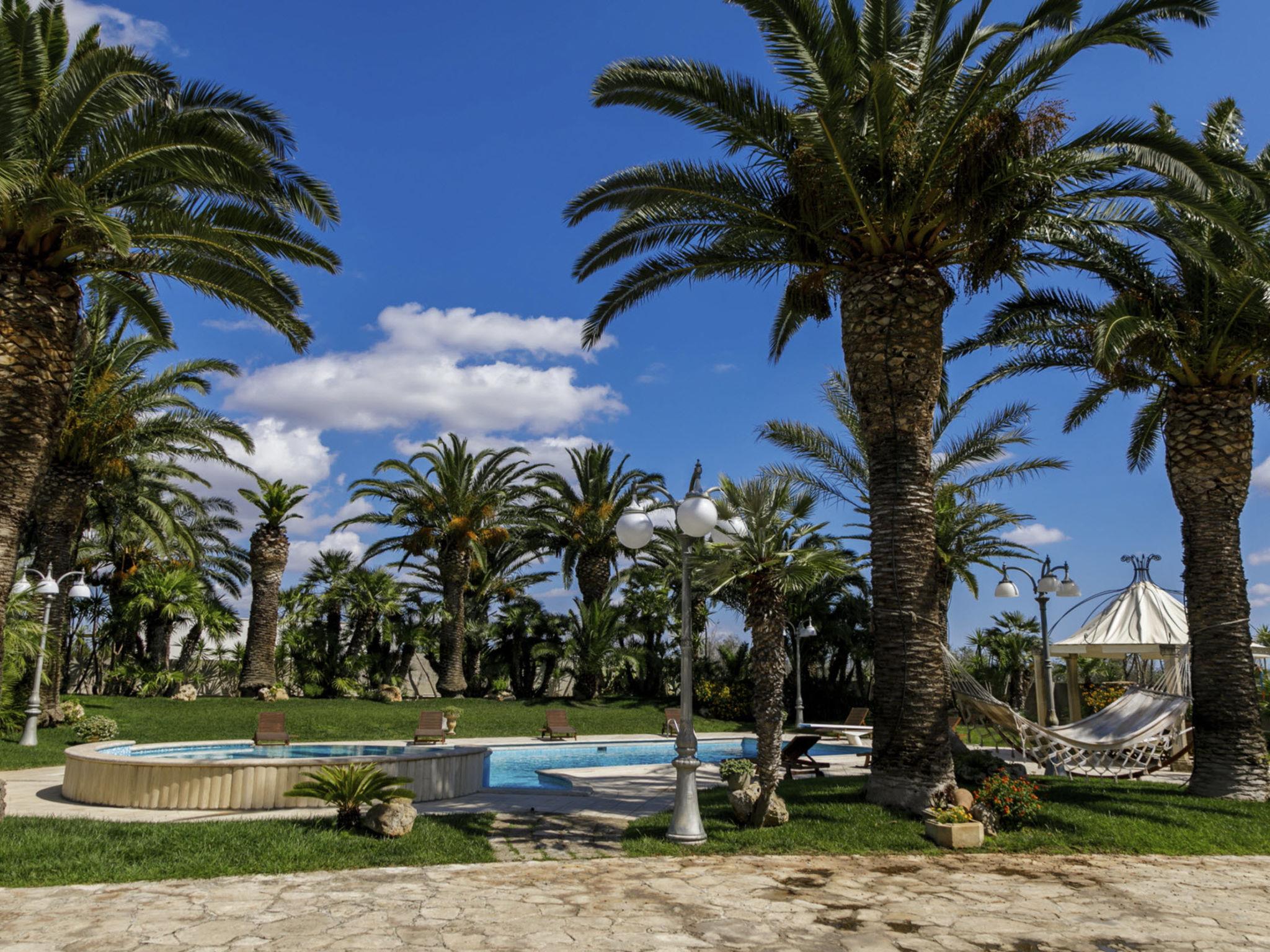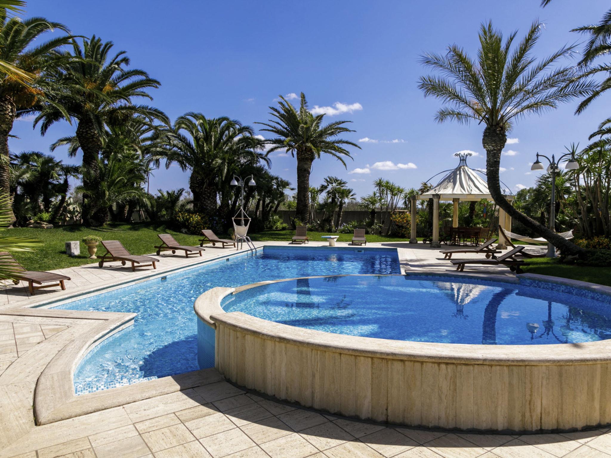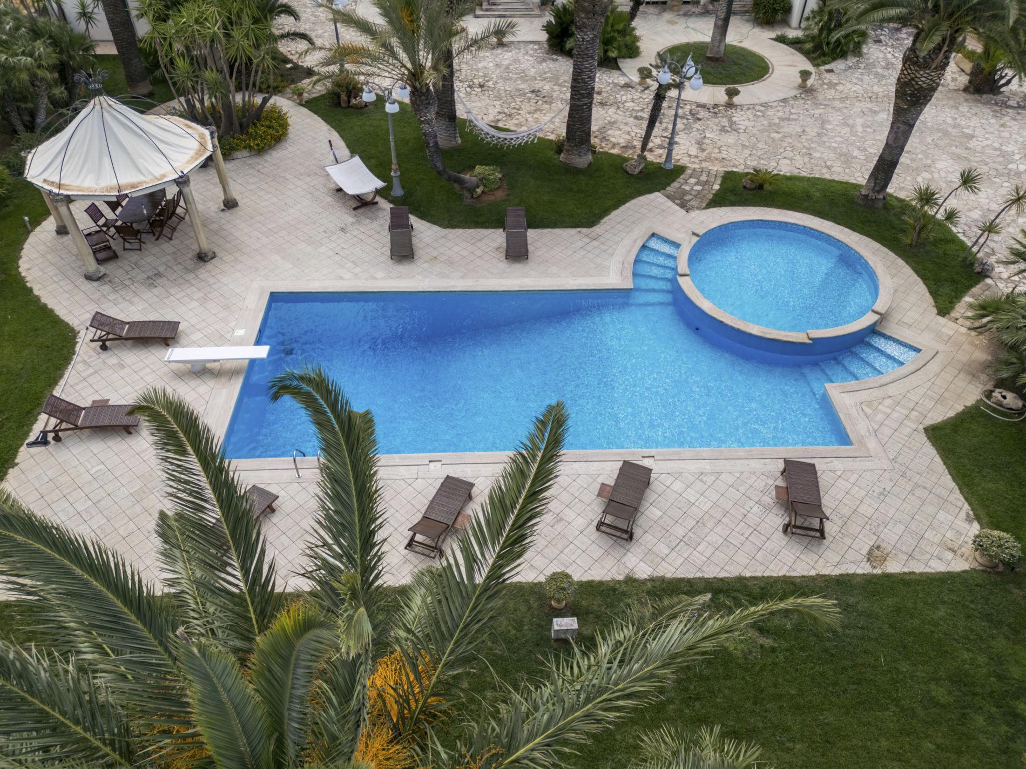 Luxurious, historical villa "Incoronata", surrounded by trees and fields. 1 km from the centre of Nardò-Città del Barocco Leccese, 15 km from the centre of Gallipoli, 24 km from the centre of Lecce, in a quiet, sunny position, 3 km from the sea, 3 km from the beach, in the countryside. Private: property (fenced), large, beautiful, well-kept garden 6'000 m2 (fenced) with flowers and trees, lawn for sunbathing, swimming pool with privacy (6 x 14 m, depth 90 - 270 cm, seasonal availability: 01.Apr. - 31.Oct.). Shower/WC in the pool area, paddling pool, outdoor shower, pergola, garden furniture, barbecue, pool maintenance by the owner/gardener. Linen change (suppl. charge extra). Towel change (suppl. charge extra). Parking on the premises. Shop, supermarket 700 m, restaurant 3 km, bar, bakery, bus stop 700 m, railway station "Nardò" 3 km, sandy beach "Santa Caterina" 3 km, rocky beach "Porto Selvaggio" 3 km. Tennis, sports centre 400 m. Nearby attractions: Melpignano- Città della Taranta 40 km, Otranto 60 km, Santa Maria di Leuca- Punta Sud Puglia 60 km, Alberobello 143 km, Polignano a Mare 149 km, Matera 162 m. Hiking paths: Parco Naturale Porto Selvaggio 25 km, Parco Naturale Terra delle Gravine 119 km, Grotte carsiche di Castellana 155 km. Please note: car recommended. In the basement of the villa is a separate, unoccupied apartment. The children's pool is 90 cm deep.