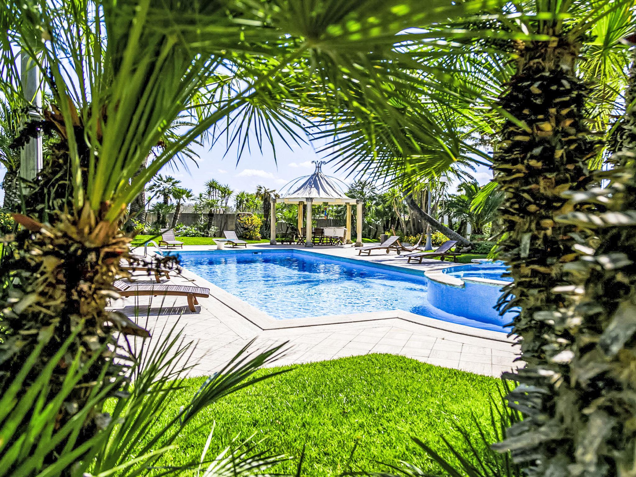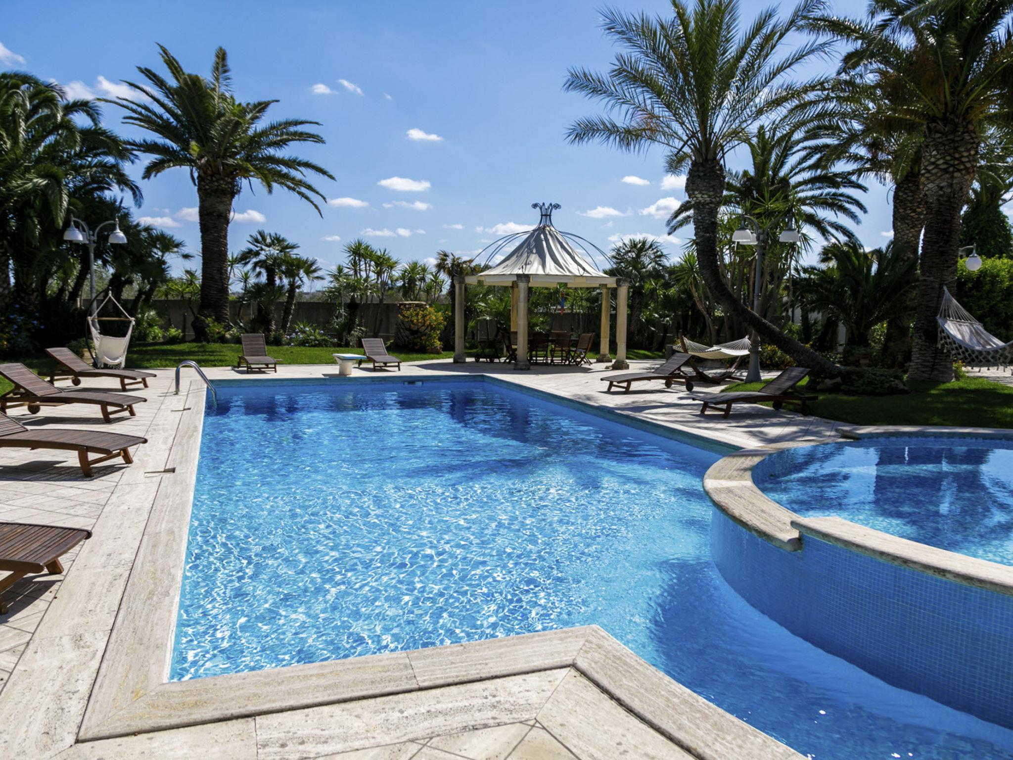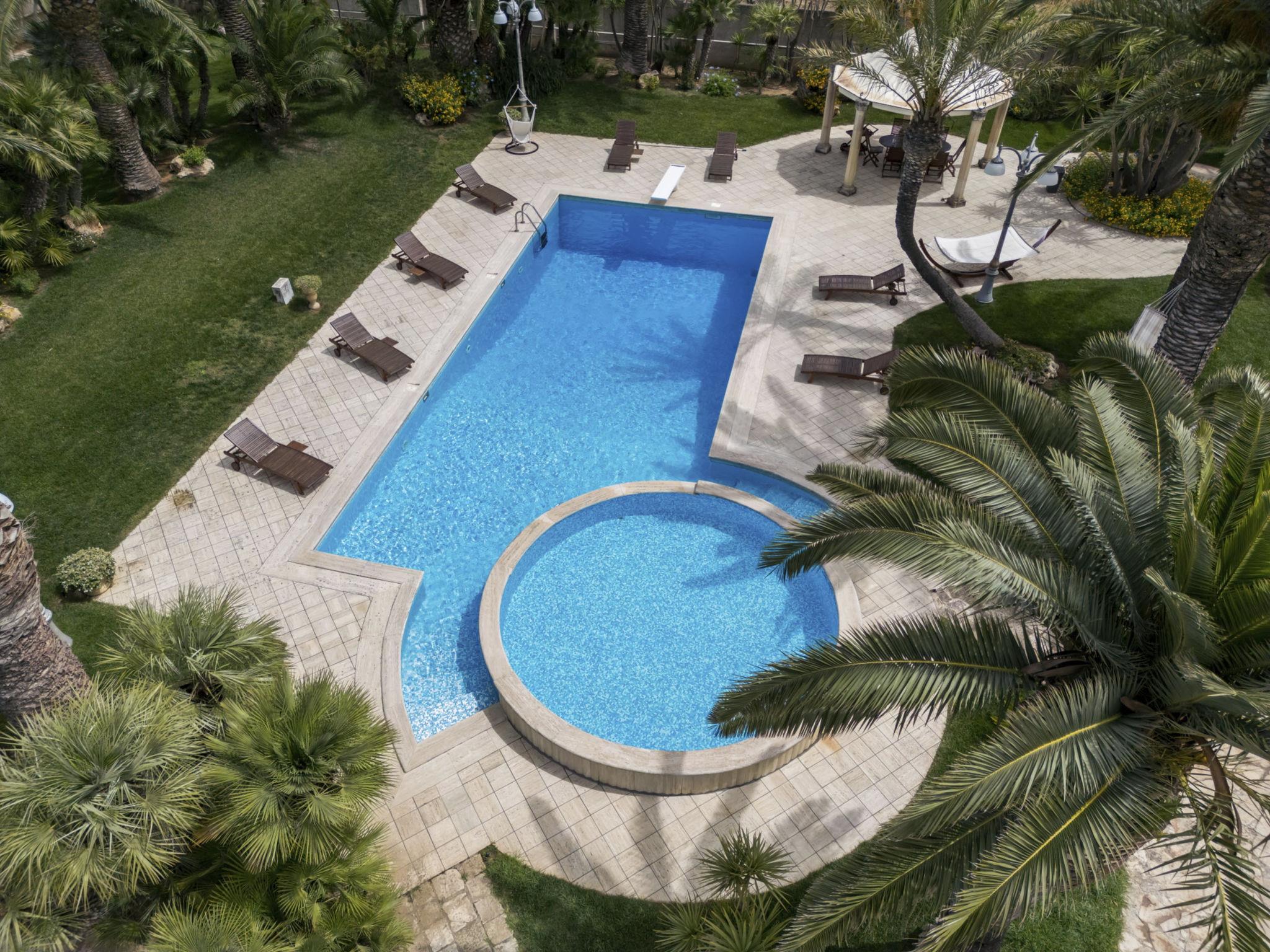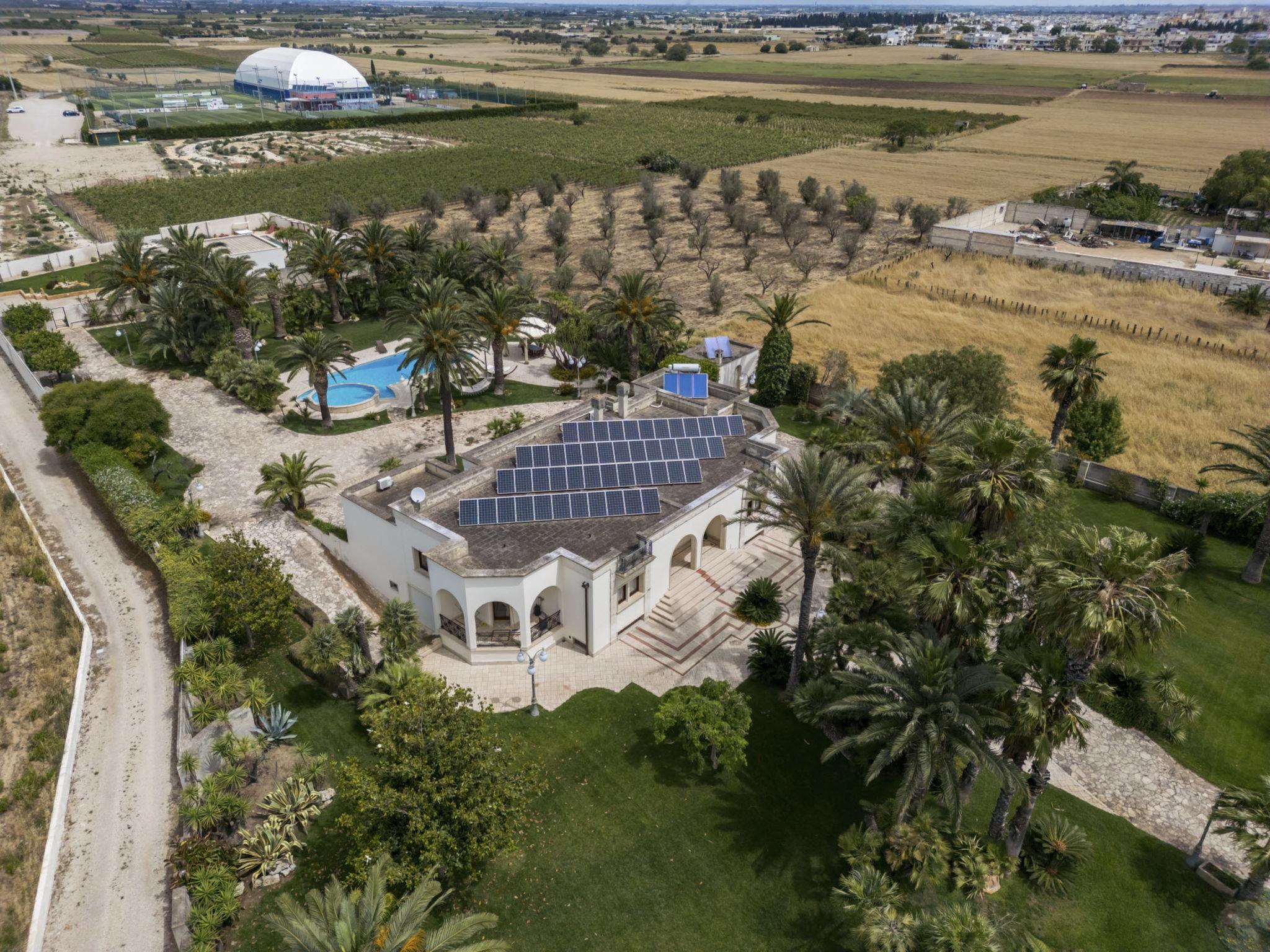 Luxurious, historical villa "Incoronata", surrounded by trees and fields. 1 km from the centre of Nardò-Città del Barocco Leccese, 15 km from the centre of Gallipoli, 24 km from the centre of Lecce, in a quiet, sunny position, 3 km from the sea, 3 km from the beach, in the countryside. Private: property (fenced), large, beautiful, well-kept garden 6'000 m2 (fenced) with flowers and trees, lawn for sunbathing, swimming pool with privacy (6 x 14 m, depth 90 - 270 cm, seasonal availability: 01.Apr. - 31.Oct.). Shower/WC in the pool area, paddling pool, outdoor shower, pergola, garden furniture, barbecue, pool maintenance by the owner/gardener. Linen change (suppl. charge extra). Towel change (suppl. charge extra). Parking on the premises. Shop, supermarket 700 m, restaurant 3 km, bar, bakery, bus stop 700 m, railway station "Nardò" 3 km, sandy beach "Santa Caterina" 3 km, rocky beach "Porto Selvaggio" 3 km. Tennis, sports centre 400 m. Nearby attractions: Melpignano- Città della Taranta 40 km, Otranto 60 km, Santa Maria di Leuca- Punta Sud Puglia 60 km, Alberobello 143 km, Polignano a Mare 149 km, Matera 162 m. Hiking paths: Parco Naturale Porto Selvaggio 25 km, Parco Naturale Terra delle Gravine 119 km, Grotte carsiche di Castellana 155 km. Please note: car recommended. In the basement of the villa is a separate, unoccupied apartment. The children's pool is 90 cm deep.
