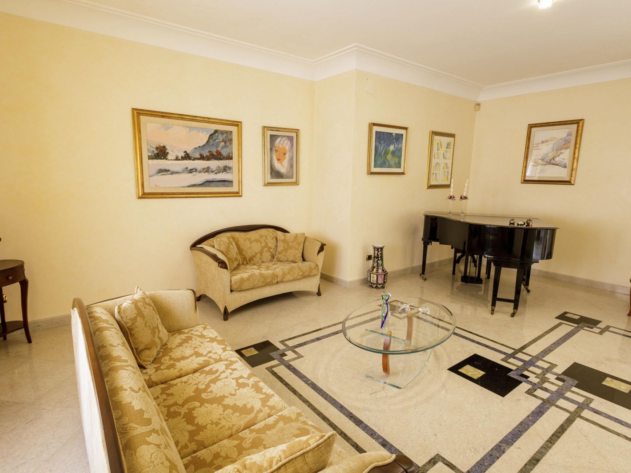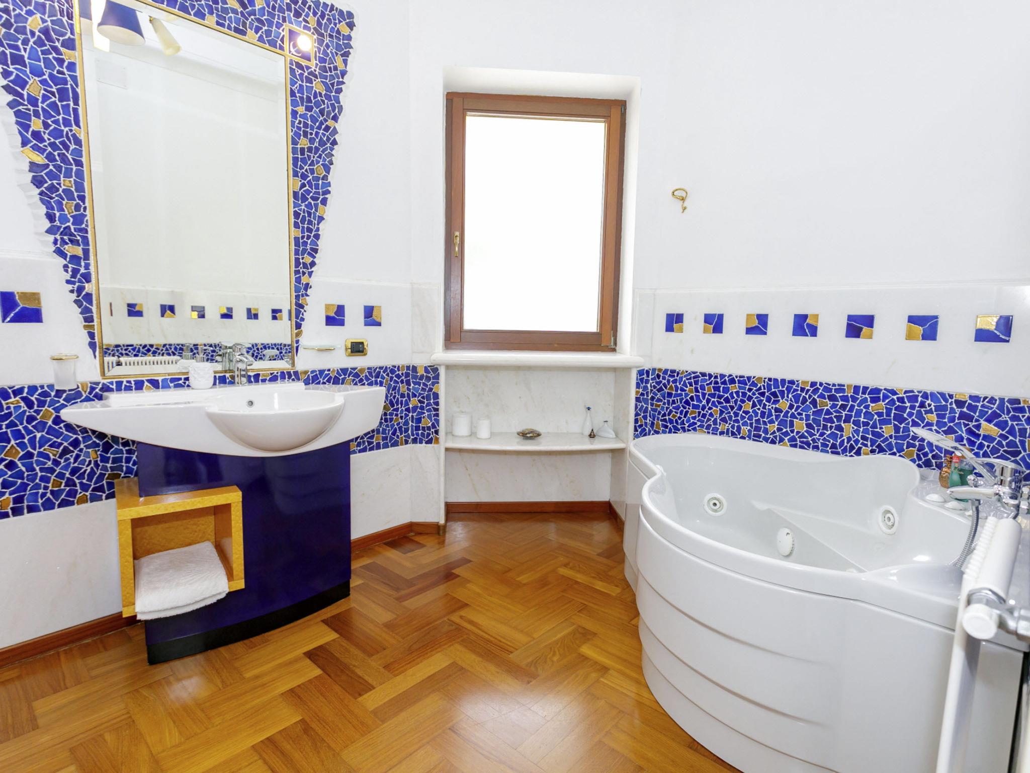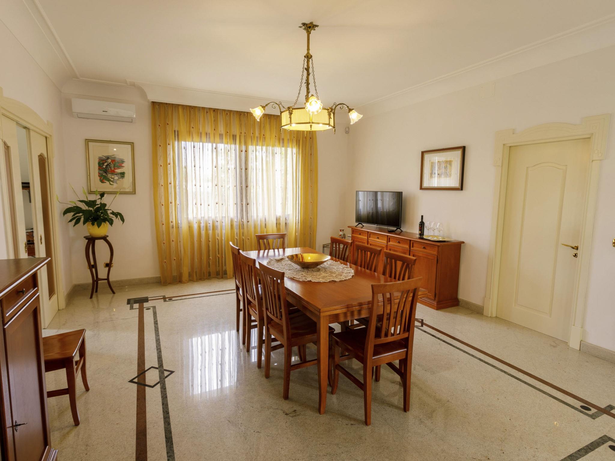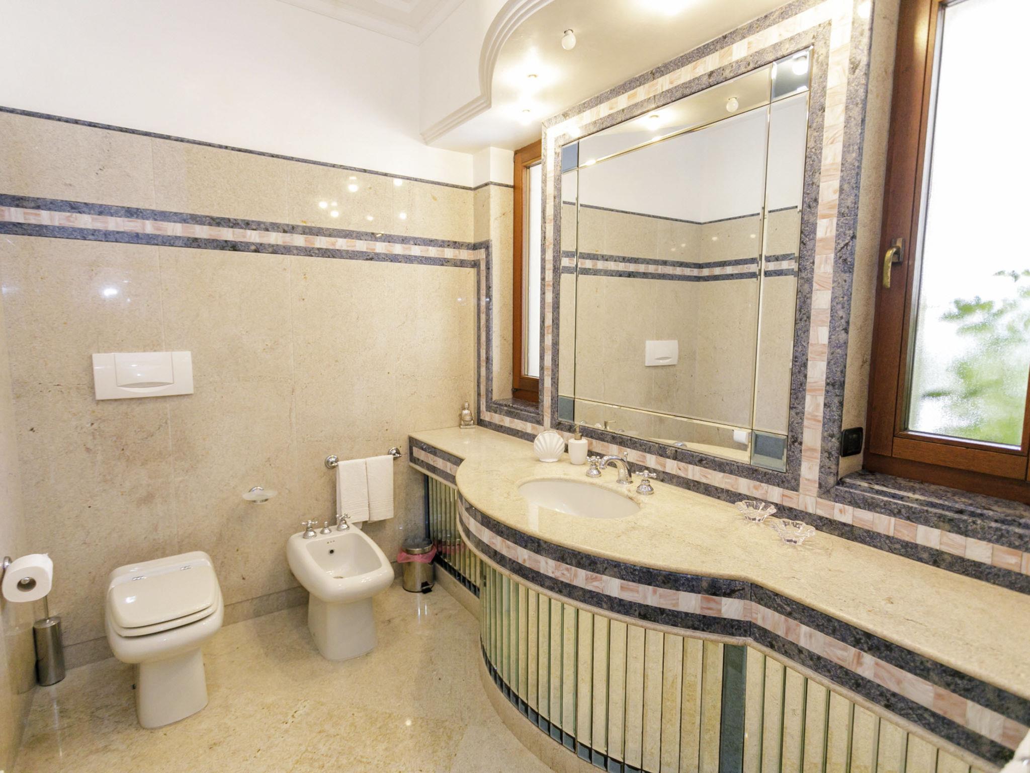 6-room villa 240 m2, on the ground floor. Very stylish and cosy furnishings: entrance hall. Lounge. Dining room with international TV channels, air conditioning and forced-air heating. Exit to the terrace. 1 double bedroom with Dressing room with shower/bidet/WC, international TV channels, air conditioning and forced-air heating. 1 double bedroom with international TV channels, air conditioning and forced-air heating. 1 double bedroom with 1 bed, air conditioning and forced-air heating. 1 double bedroom with 1 bed, air conditioning and forced-air heating. Exit to the garden. Kitchen 12 m2 (mini-oven, dishwasher, Gas stove, 4 gas rings, toaster, kettle, microwave, electric coffee machine). Exit to the terrace. Bath/bidet/WC, shower/bidet/WC, hydro massage bath. Heating, air-conditioning, forced-air heating. Heating available only from 01.11. to 31.03, Heating not available in all rooms. Parquet floors. Large terrace 40 m2, roofed, 2 terraces 10 m2, roofed, patio, large garden, porch 35 m2. Terrace furniture, barbecue, deck chairs (10). View of the swimming pool and the garden. Facilities: washing machine, safe, iron, children's high chair, baby cot for up to 2 year olds, hair dryer. Internet (WiFi, free). Parking (6 cars). Please note: suitable for families. Maximum 1 small pet/ dog allowed. Smoke alarm, fire extinguisher. The villa must be left at 9 am on departure day, in case of arrival of new guests on the same day . IT075052C200037368
