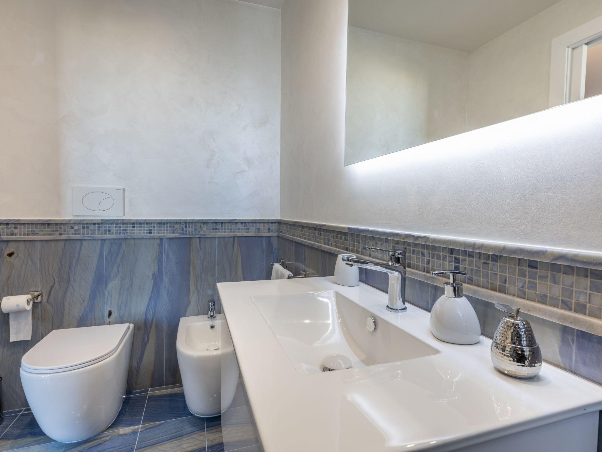 3-room villa 120 m2. Bright, modern and luxurious furnishings: living/dining room with panoramic window with 1 double sofabed (140 cm), TV, air conditioning and forced-air heating. Exit to the garden, to the swimming pool. 2 double bedrooms, each room with shower/bidet/WC, air conditioning and forced-air heating. Exit to the garden, to the swimming pool. Kitchenette (oven, dishwasher, Gas stove, 4 gas rings, toaster, kettle, microwave, electric coffee machine). Heating, air-conditioning, forced-air heating. Heating available only from 01.11. to 31.03. 3 terraces 13 m2 partly covered, patio 9 m2, roofed. Terrace furniture, barbecue, deck chairs (6). View of the swimming pool and the garden. Facilities: washing machine, iron, children's high chair, baby cot for up to 2 year olds, hair dryer. Internet (WiFi, free). Parking (4 cars). Please note: maximum 1 small pet/ dog allowed. Smoke alarm, fire extinguisher. IT075052C200114673