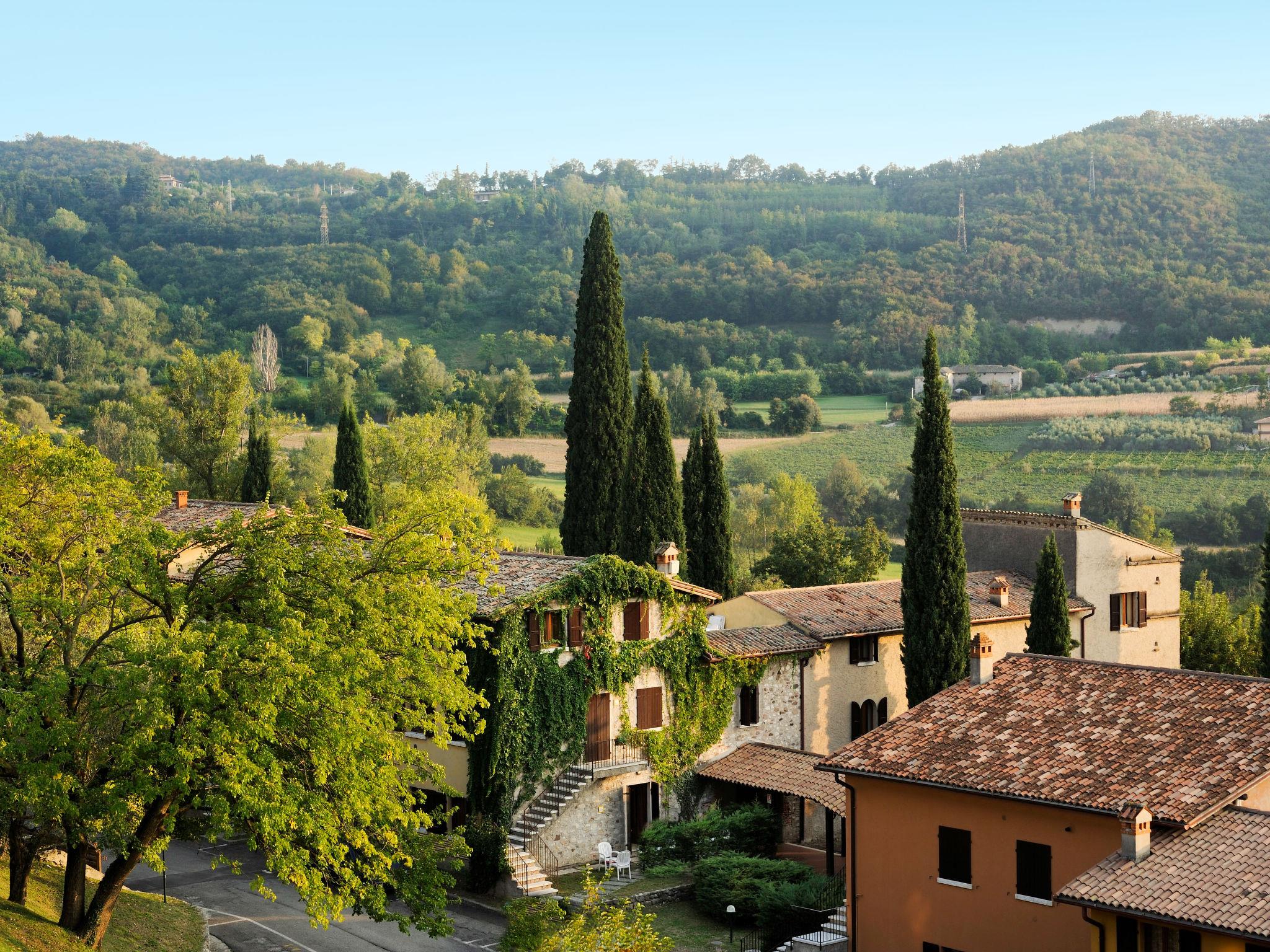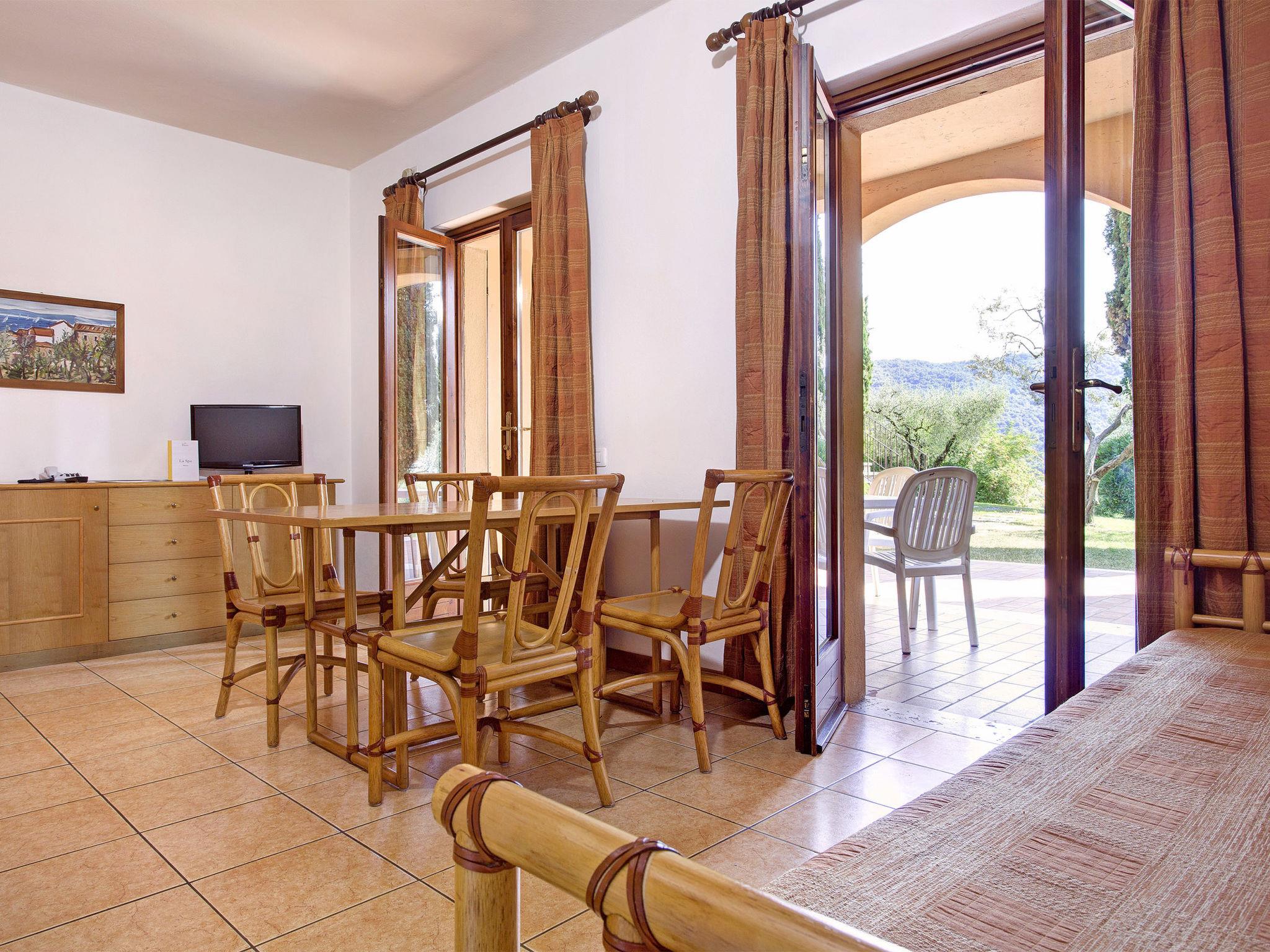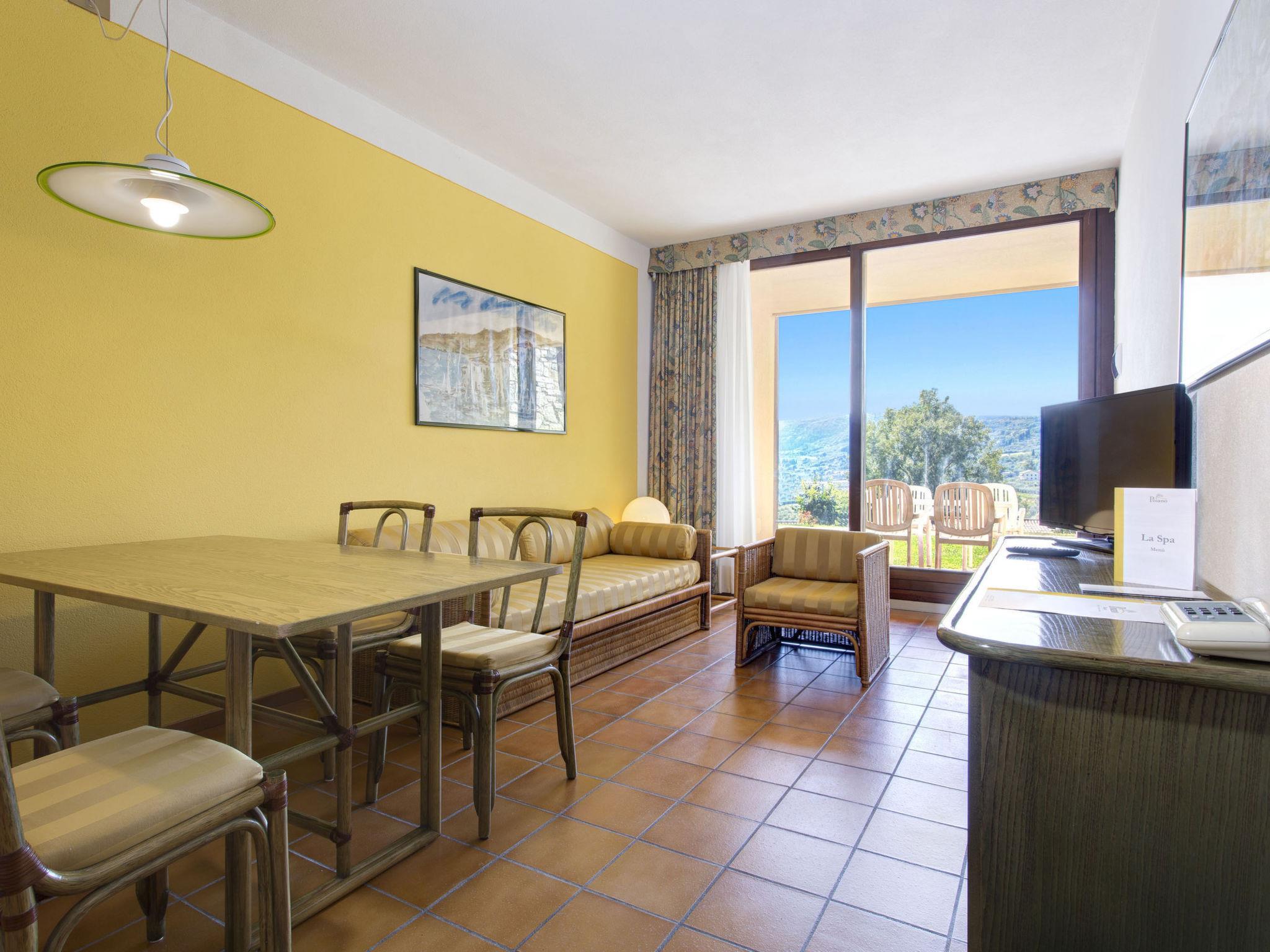 Very large resort "Poiano Resort Appartamenti", 2 storeys. 160 apartments in the residence. Above Garda, on the outskirts, 3 km from the centre of Garda, in an elevated position on top of a hill, 3 km from the lake. For shared use: property 60 ha, terraced garden with lawn and trees, swimming pool (50 x 25 m, depth 140 cm, seasonal availability: 15.Mar. - 15.Nov.). WC in the pool area, children's pool, outdoor shower, tennis (4 x clay court), floodlit (extra), table tennis, volleyball court, beach volleyball, children's playground. In the complex: reception, restaurant, bar, breakfast room, WiFi, fitness room, spa area for shared use (extra), shopping facilities, central heating system, air conditioning, washing machine (extra), tumble dryer (extra), bicycle rental. Towel change weekly (suppl. charge extra). Room cleaning on request (extra). Breakfast and half board possible on request (extra). Parking on the premises. E-charging station. Bus stop "Free Shuttle Bus Poiano - Garda" 100 m, pebble beach 3 km. Golf course (2 hole) 50 m. Nearby attractions: Golf Club Ca' degli Ulivi (18 holes) 4 km, Peschiera del Garda 17 km, Verona 38 km. Please note: entertainment in the season. Suitable for families, suitable for seniors baby equipment on request (extra), in the season. Access to the Spa for adults only.
