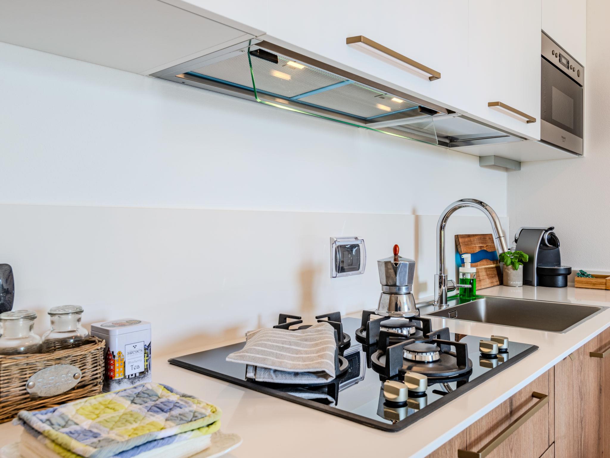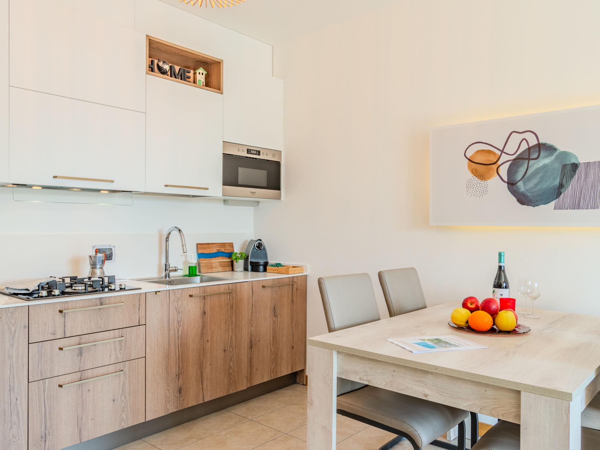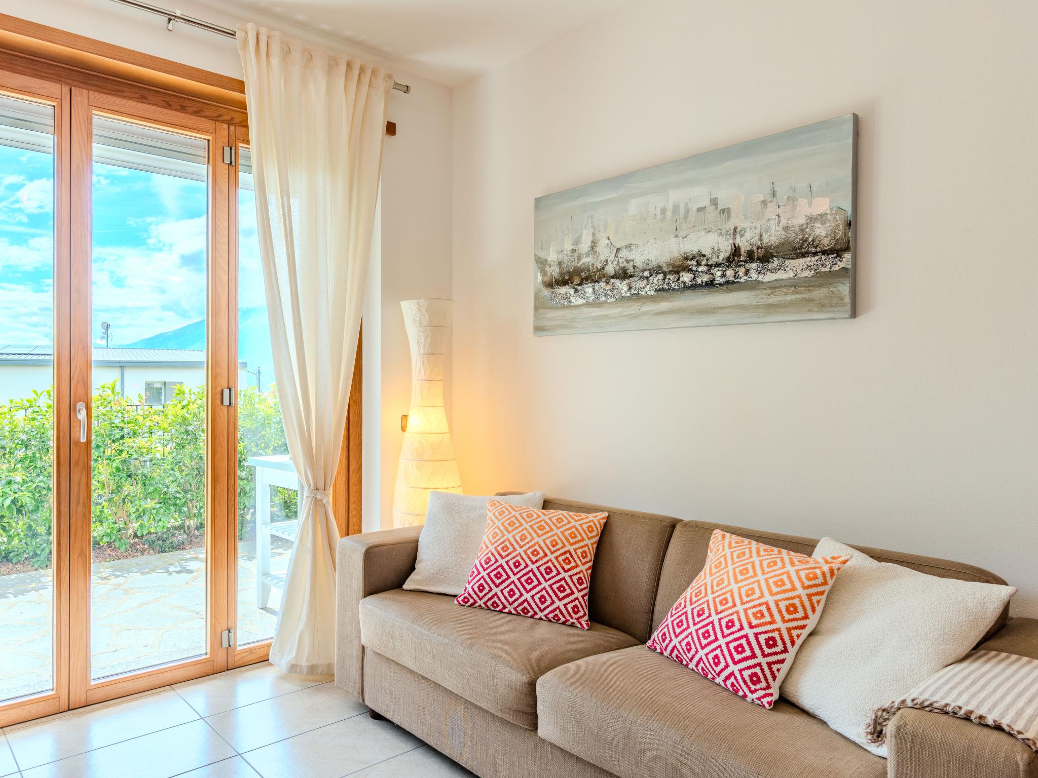 "Andrea", 2-room apartment 46 m2, on the ground floor, south-west facing position. Renovated in 2023, comfortable and cosy furnishings: living/sleeping room with panoramic window with 1 double sofabed, dining table and satellite TV. Exit to the terrace. 1 double bedroom. Open kitchen (dishwasher, 4 gas rings, toaster, kettle, freezer, electric coffee machine, combination microwave). Shower/WC. No heating option. Terrace partly roofed, south-west facing position. Terrace furniture, deck chairs (2). Marvellous view of the lake, the mountains and the swimming pool. Facilities: washing machine, hair dryer. Internet (WiFi, free). Garage (1 car). Please note: non-smokers only. Private entrance. IT013107C2H8C8CA7W
