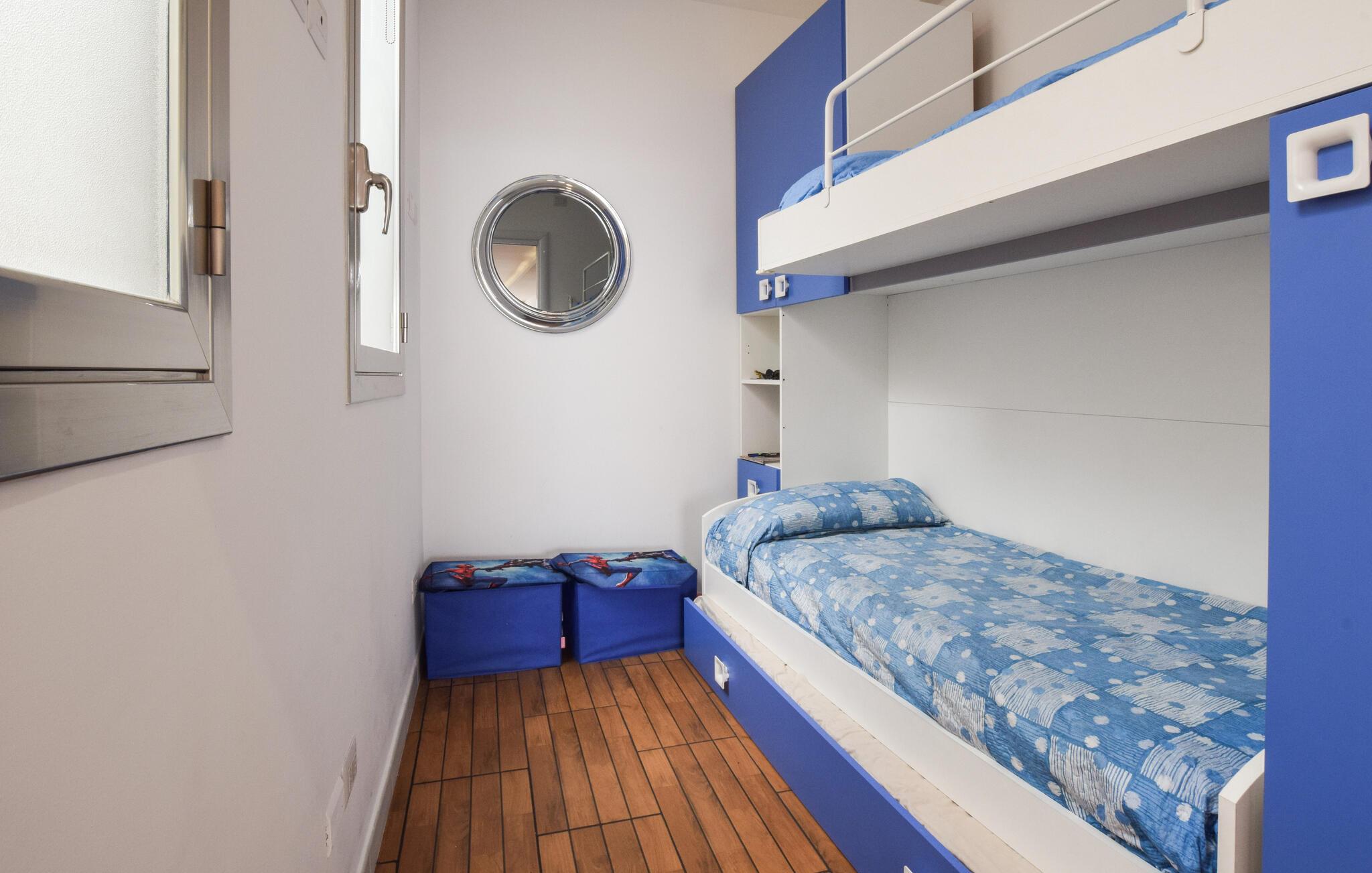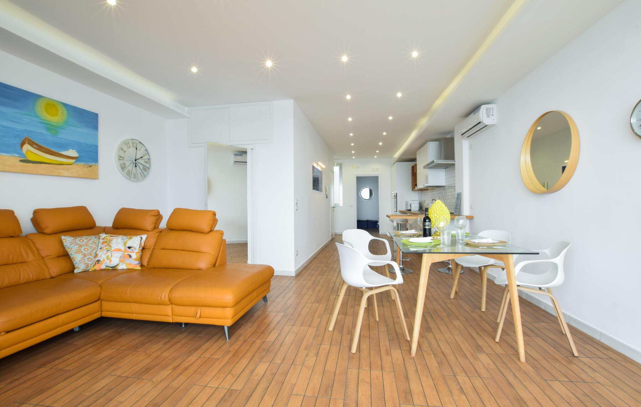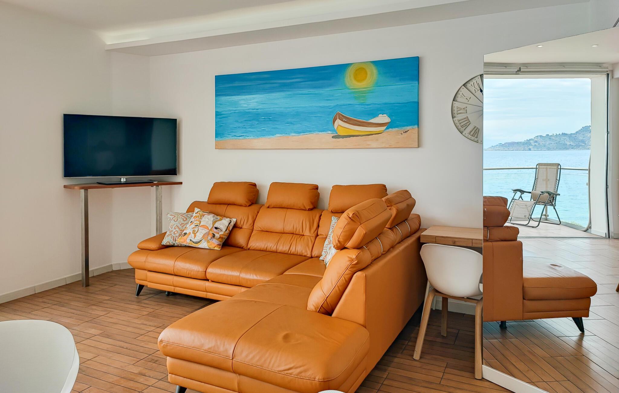 Hvis I er på udkig efter en feriebolig i første række til havet, og går I ikke af vejen for god komfort, er denne stilfulde lejlighed det helt rette valg for jer. Indretningen fremtræder flot og elegant med et moderne møblement og gode faciliteter, så I ikke skal bekymre jer om noget. Prikken over i'et er nu engang panoramaudsigten over vandet, der er allestedsnærværende og kan nydes ved spisebordet, i sofaen og særligt på altanen med et godt glas vin efter en herlig dag ved stranden.