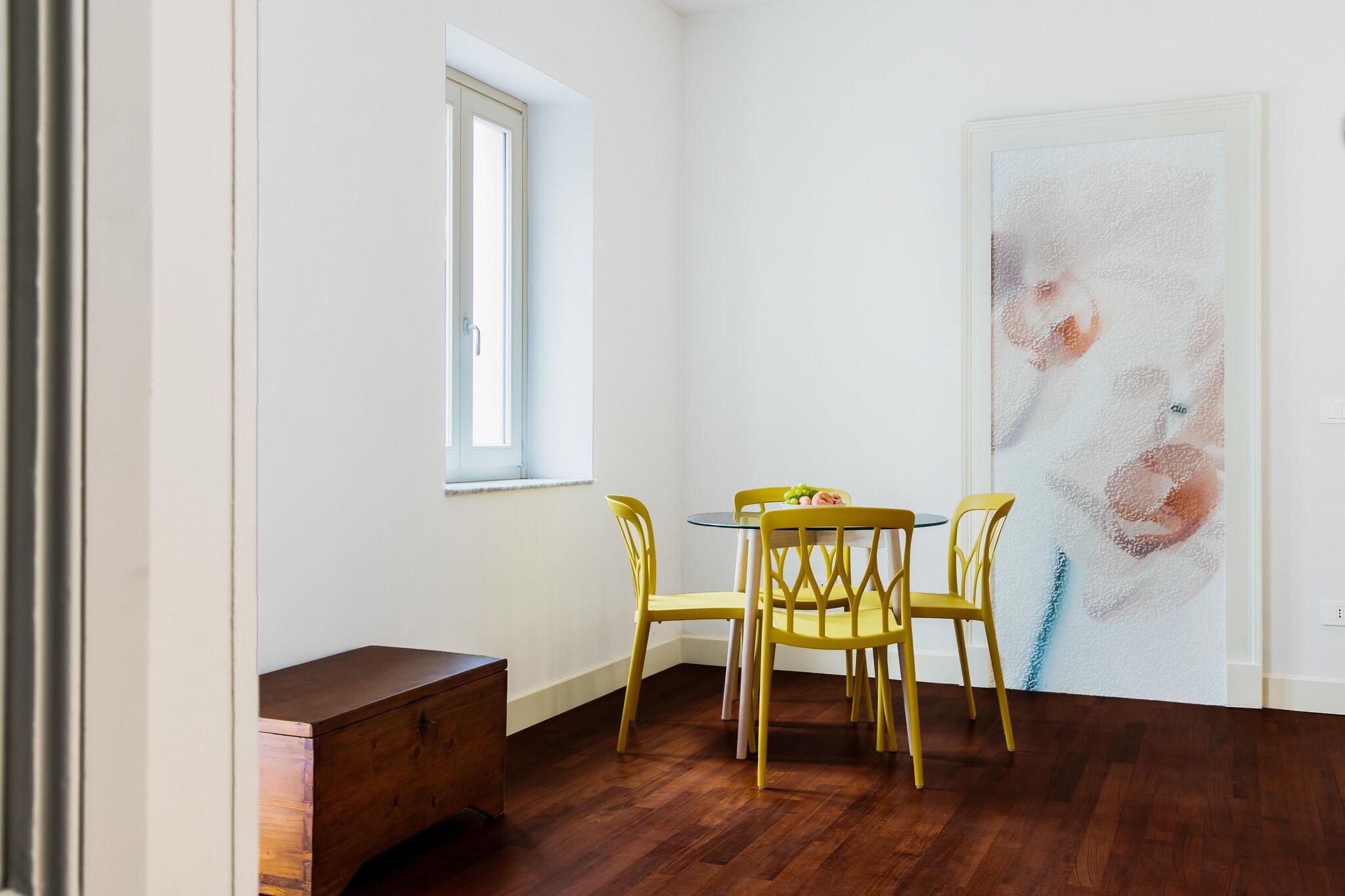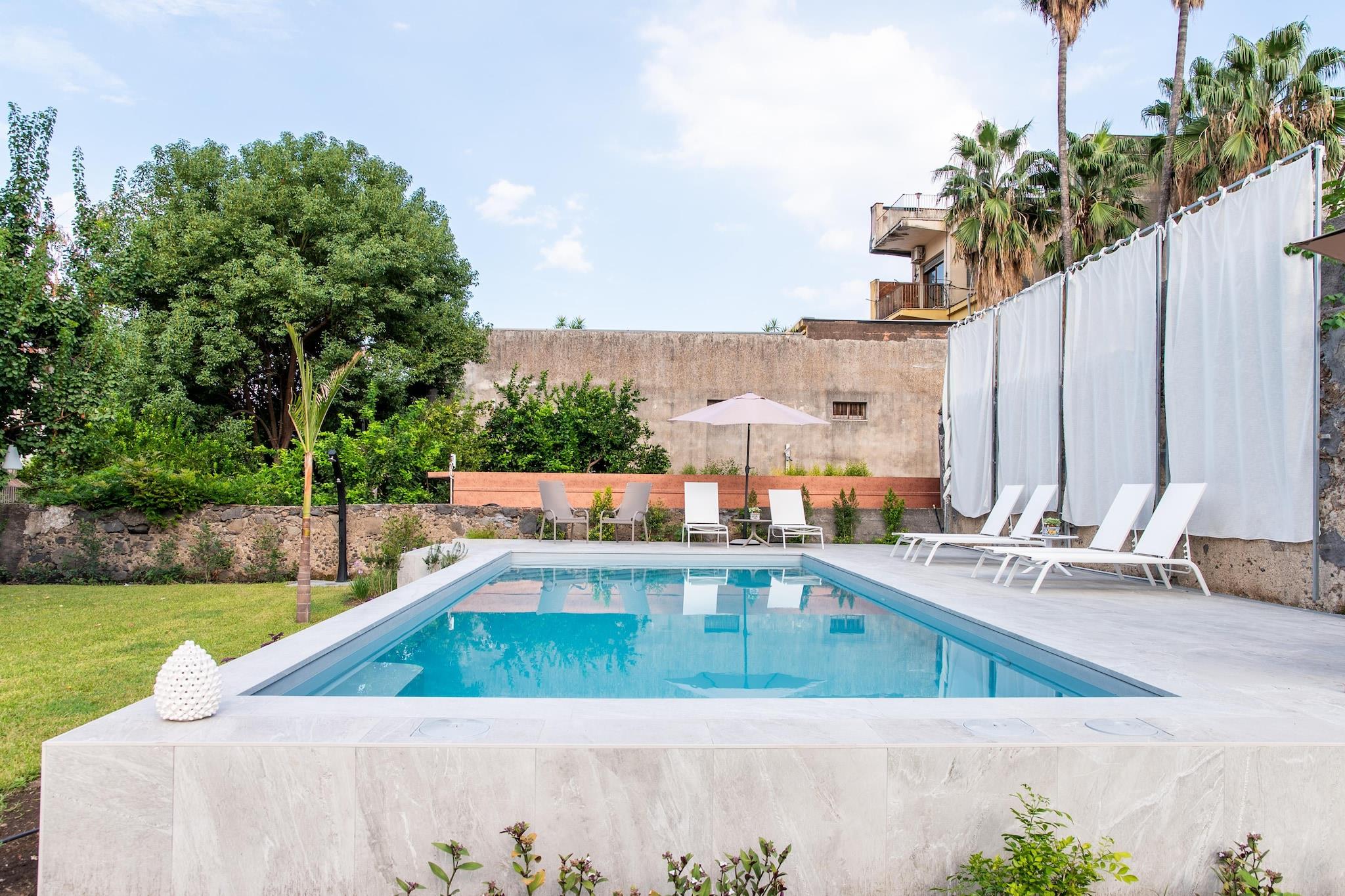 Denne luksuriøse historiske bolig, der dateres tilbage til 1700, er beliggende i hjertet af Giarre og er blevet elegant restaureret med fine materialer som marmor, lavasten og hvide sten. Første sal, der er tilgængelig via en stor trappe, rummer fire raffinerede boliger, hver dekoreret med træparketgulve og originale døre, smagfuldt møbleret for at skabe en sofistikeret atmosfære. Ejendommen har en ideel beliggenhed for at udforske det østlige Sicilien og ligger tæt på kulturelle og naturlige attraktioner såsom Taormina, Catania, Etna og den smukke kystlinje. Ejendommen tilbyder betalingsparkering på stedet, eller gæsterne kan drage fordel af gratis parkering i kort afstand. Lejligheden kan rumme op til 4 personer, og tilbyder et soveværelse med dobbeltseng og en komfortabel dobbelt sovesofa i stuen. Boligen er designet med fokus på bæredygtighed, ved at bruge solenergi til opvarmning og køling for at sikre maksimal komfort og samtidig minimere miljøpåvirkningen. Gæsterne kan slappe af i den smukke have, en rolig oase med swimmingpool, perfekt til solbadning og afslapning. Indkvarteringsfaciliteterne er af højeste standard og designet til at tilbyde gæsterne en maksimal komfortoplevelse. Gratis produkter såsom shampoo, shower gel, hjemmesko, kropscreme er inkluderet, sammen med praktisk tilbehør såsom hårtørrer, strygejern og strygebræt. Derudover leveres bløde håndklæder, badekåber, poolhåndklæder og et førstehjælpssæt for at sikre et bekymringsfrit ophold.