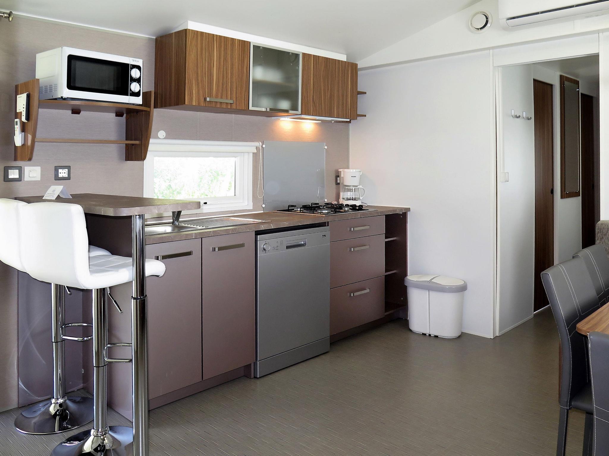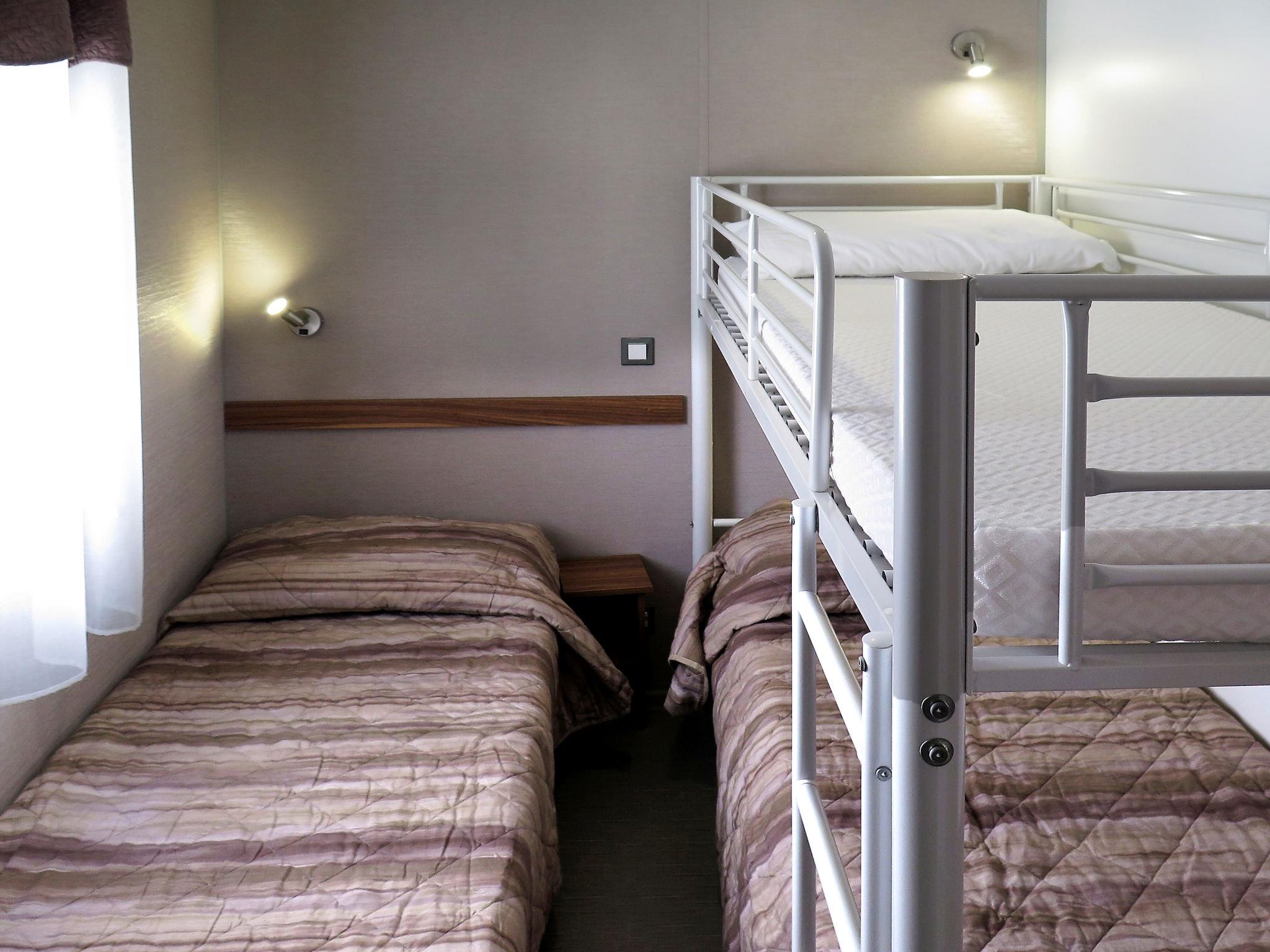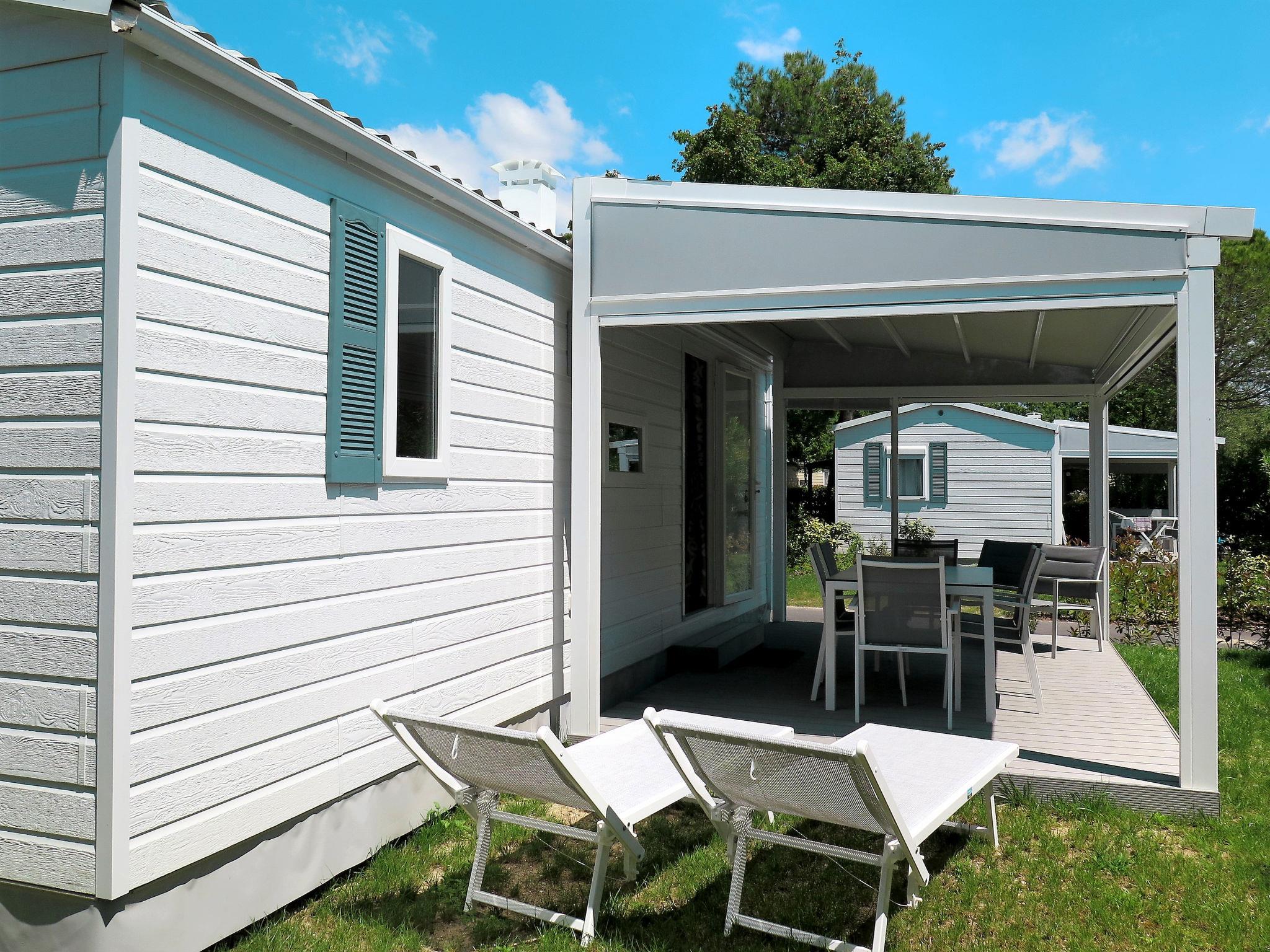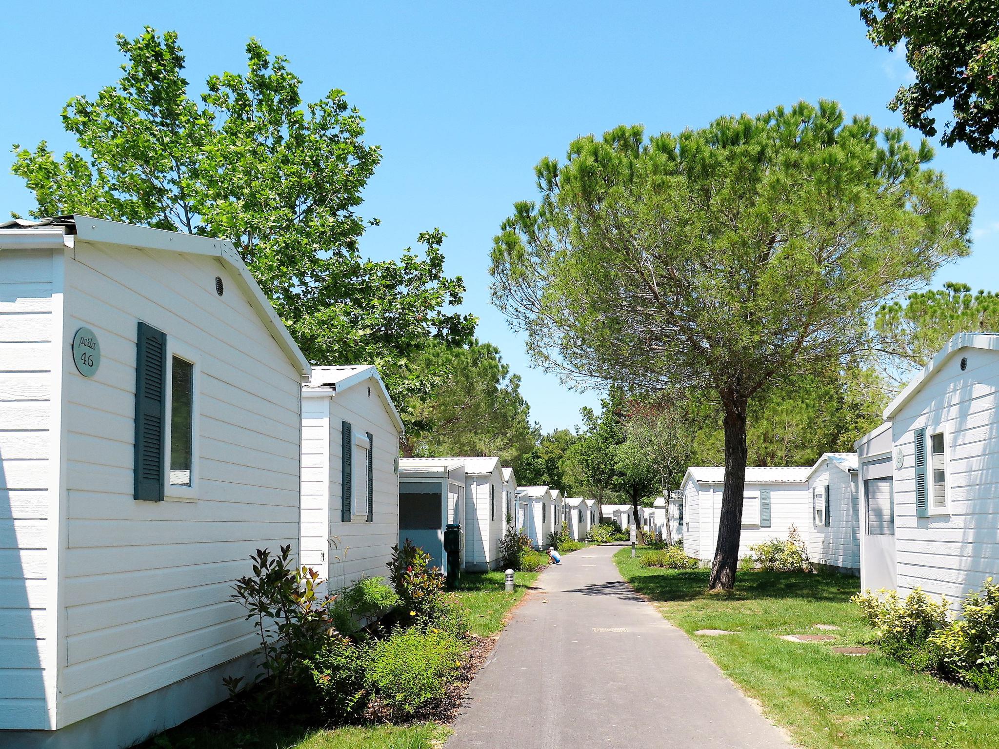 "Perla", 3-room mobile home 31 m2. Object suitable for 5 adults + 2 children. Modern furnishings: living/sleeping room with 1 double sofabed and dining table. Exit to the veranda. 1 double bedroom. 1 room with 1 bed and 1 x 2 bunk beds. Kitchenette (dishwasher, 4 gas rings, kettle, microwave, freezer, electric coffee machine). Shower/WC, sep. WC. Air-conditioning, forced-air heating. Terrace 15 m2, roofed. Terrace furniture, deck chairs (2). Facilities: safe, mosquito net, children's high chair, baby cot (extra). Parking (1 car). Please note: non-smoking house. Beach ca. 80-300 m. IT031009B28ZDV3E5N