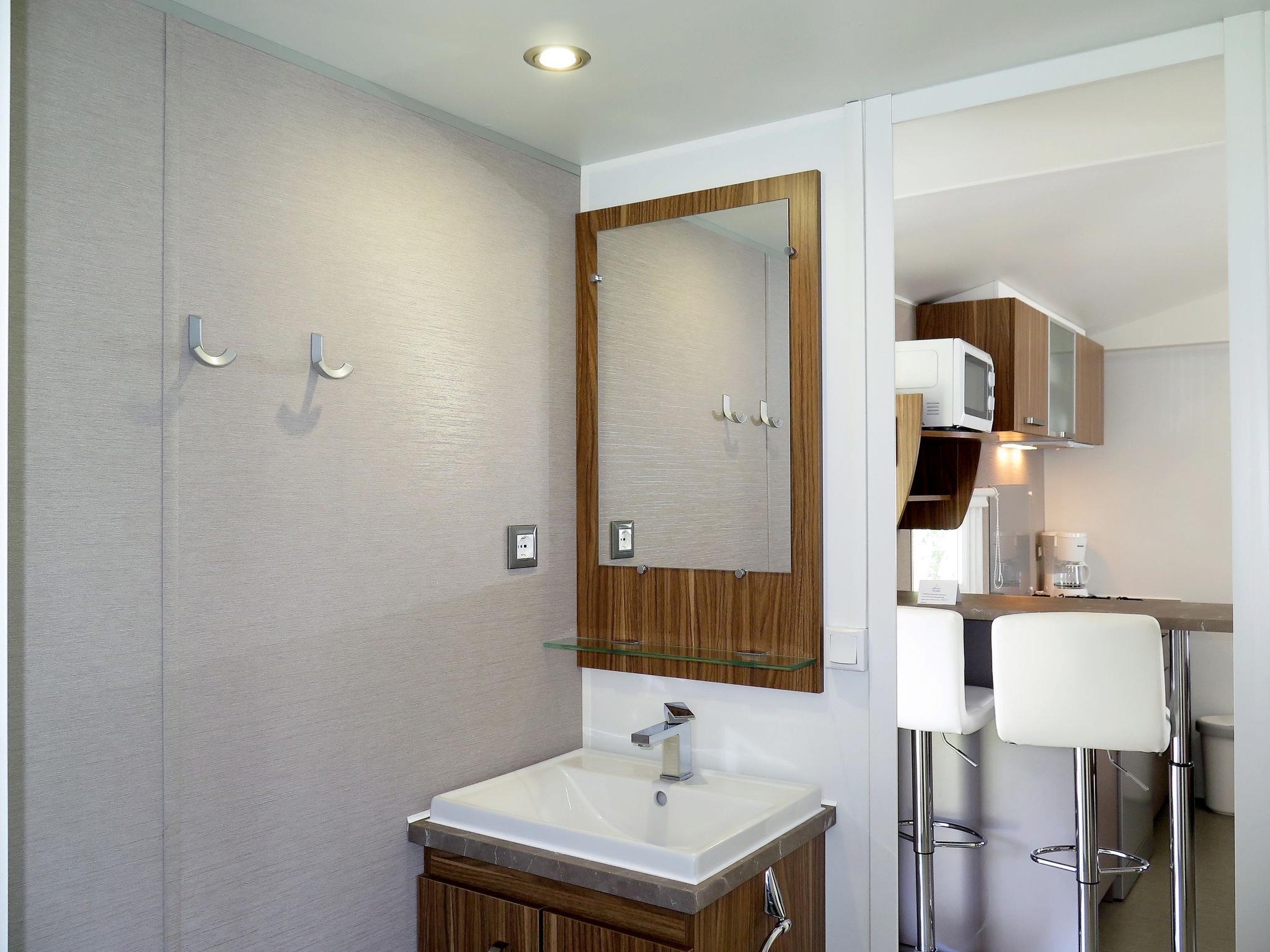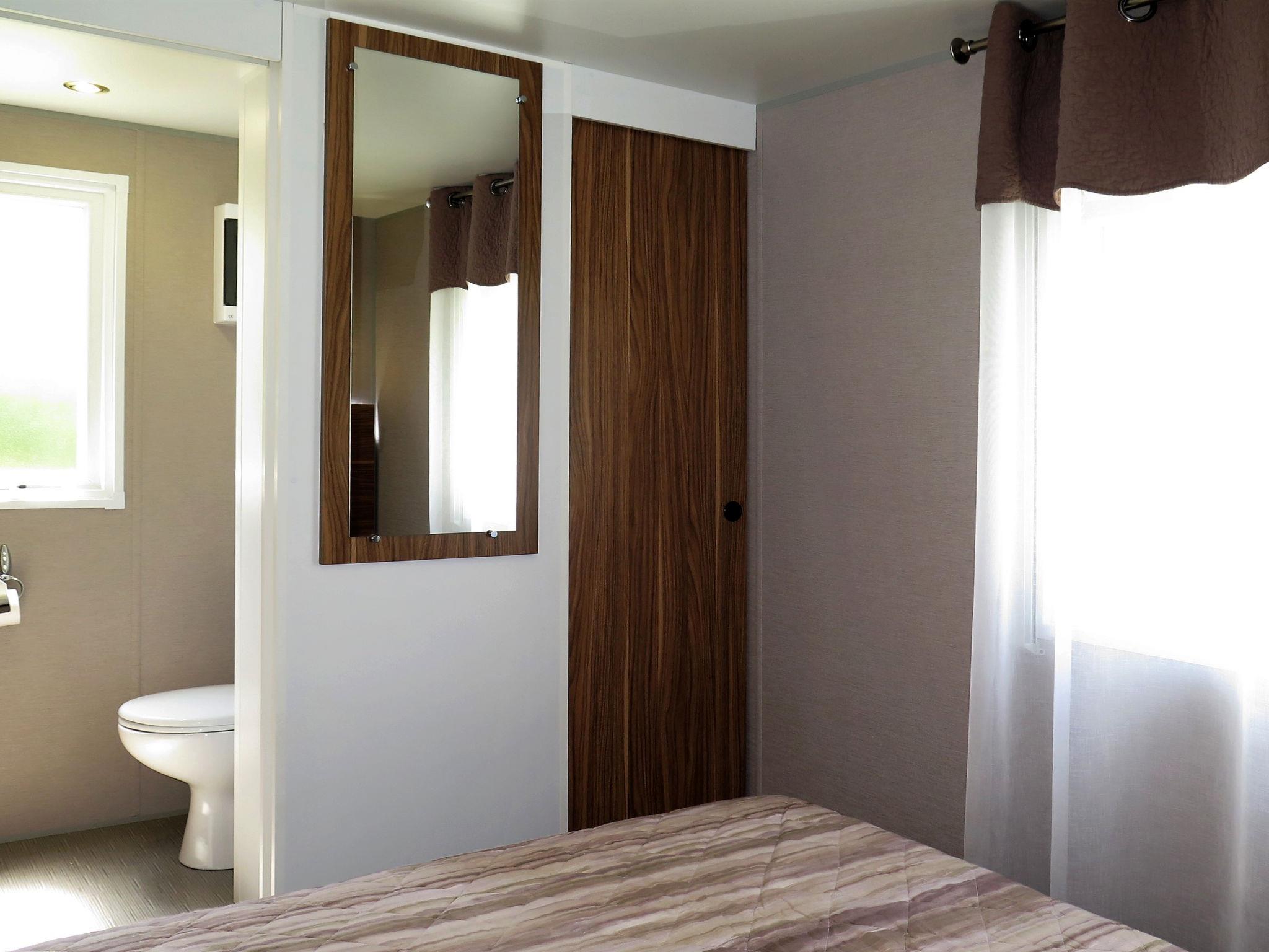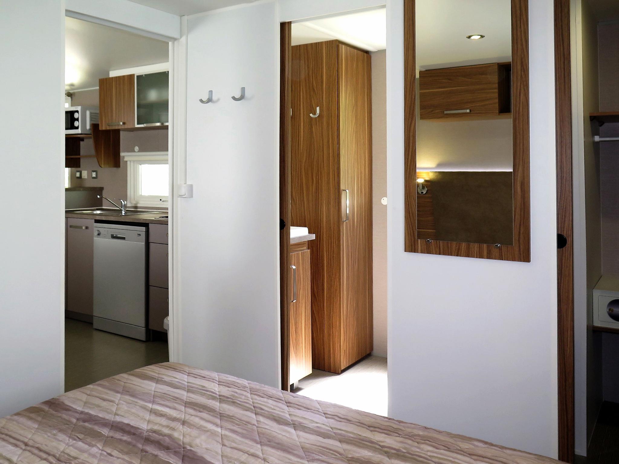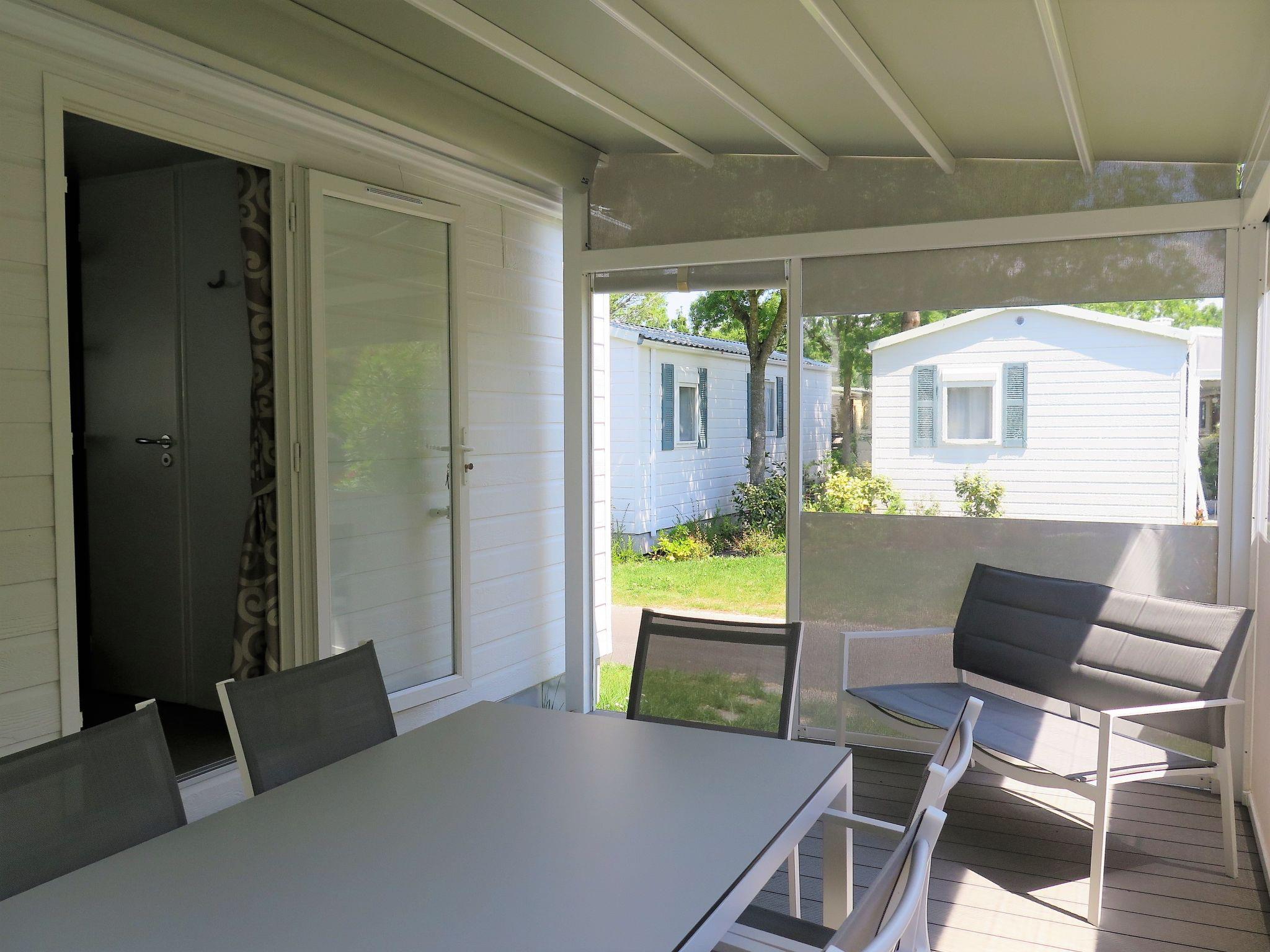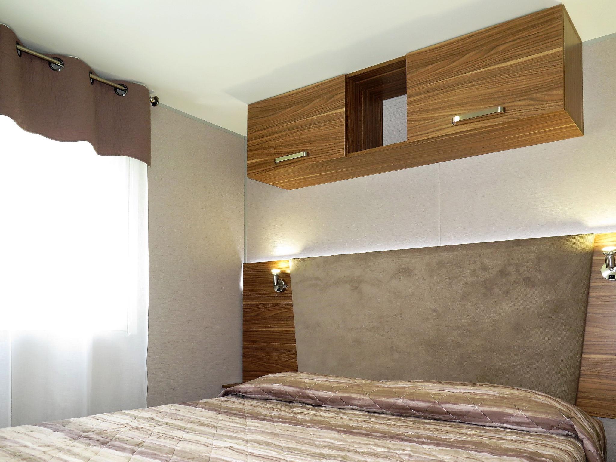 "Perla", 3-room mobile home 31 m2. Object suitable for 5 adults + 2 children. Modern furnishings: living/sleeping room with 1 double sofabed and dining table. Exit to the veranda. 1 double bedroom. 1 room with 1 bed and 1 x 2 bunk beds. Kitchenette (dishwasher, 4 gas rings, kettle, microwave, freezer, electric coffee machine). Shower/WC, sep. WC. Air-conditioning, forced-air heating. Terrace 15 m2, roofed. Terrace furniture, deck chairs (2). Facilities: safe, mosquito net, children's high chair, baby cot (extra). Parking (1 car). Please note: non-smoking house. Beach ca. 80-300 m. IT031009B28ZDV3E5N