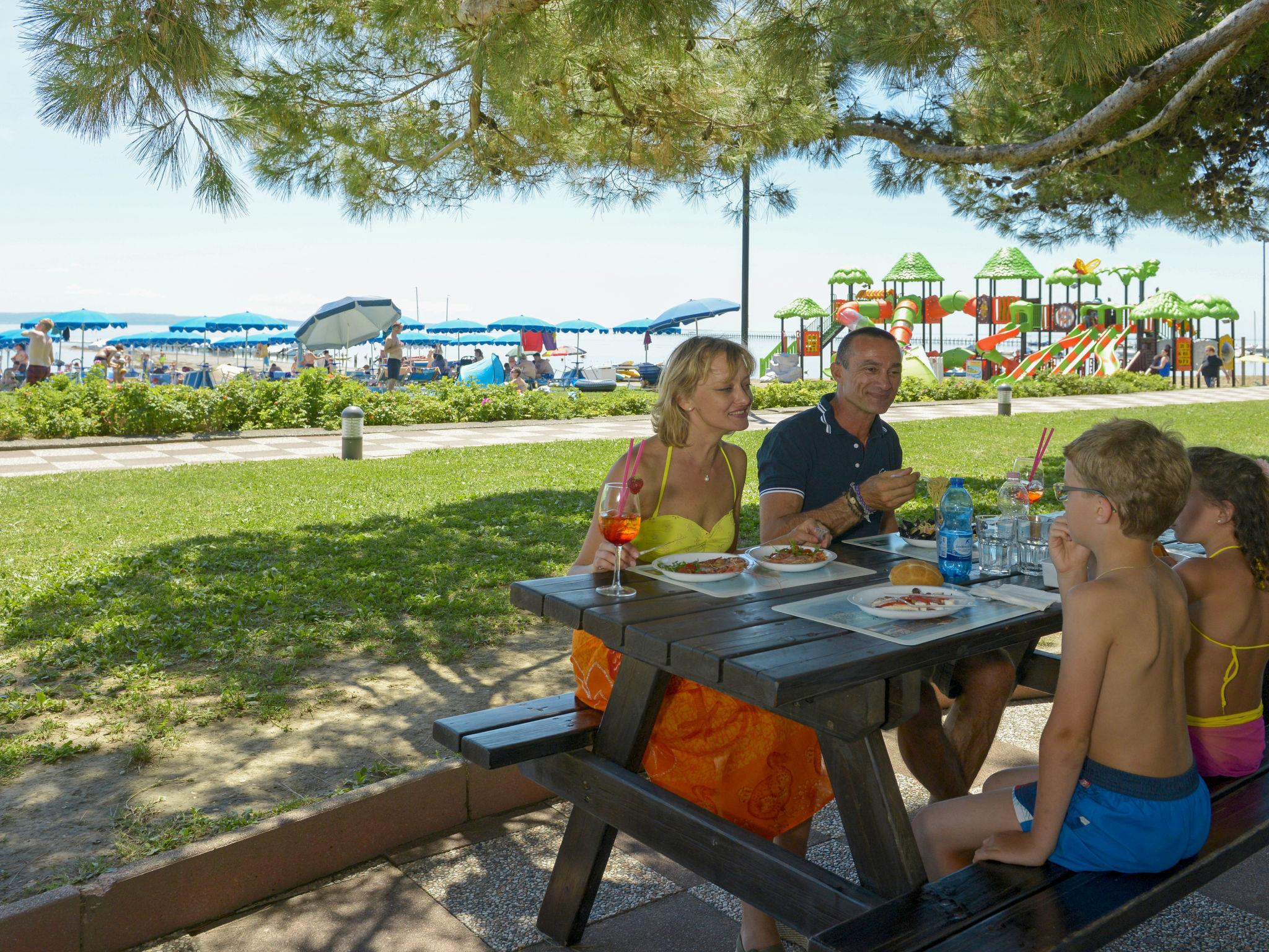 Grado: Very large, child friendly holiday village "Camping Europa 4*". 5 km from the centre of Grado, 50 km from the centre of Trieste, 130 km from the centre of Venezia, 20 m from the sea, direct access to the beach. For shared use: property 22 ha (fenced) with plants and trees, swimming pool (1'500 m2, seasonal availability: 23.Apr. - 27.Sep.). WC in the pool area, children's pool, slide, outdoor shower, tennis (1 x hard court), floodlit (extra), table tennis, beach volleyball, children's playground. In the complex: restaurant, bar, bistro, internet access, WiFi, shopping facilities, kiosk, washing machine, tumble dryer (for shared use, extra). Bus stop 500 m, railway station "Airport Station Trieste" 20 km. Nearby attractions: Castello di Duino 25 km, Riserva Naturale della Foce dell'Isonzo 14 km, Aquileia 16 km, Castello Miramare 40 km, Redipuglia 20 km, Collio 35 km. Please note: entertainment. Suitable for families. The electronic watch (included in the rental price) is the resort's exclusive means of payment and can be loaded online or in cash/by credit card during checkout hours. Beach service included (1 umbrella + 2 sunbeds per unit, for the whole season). Animation (whole season).