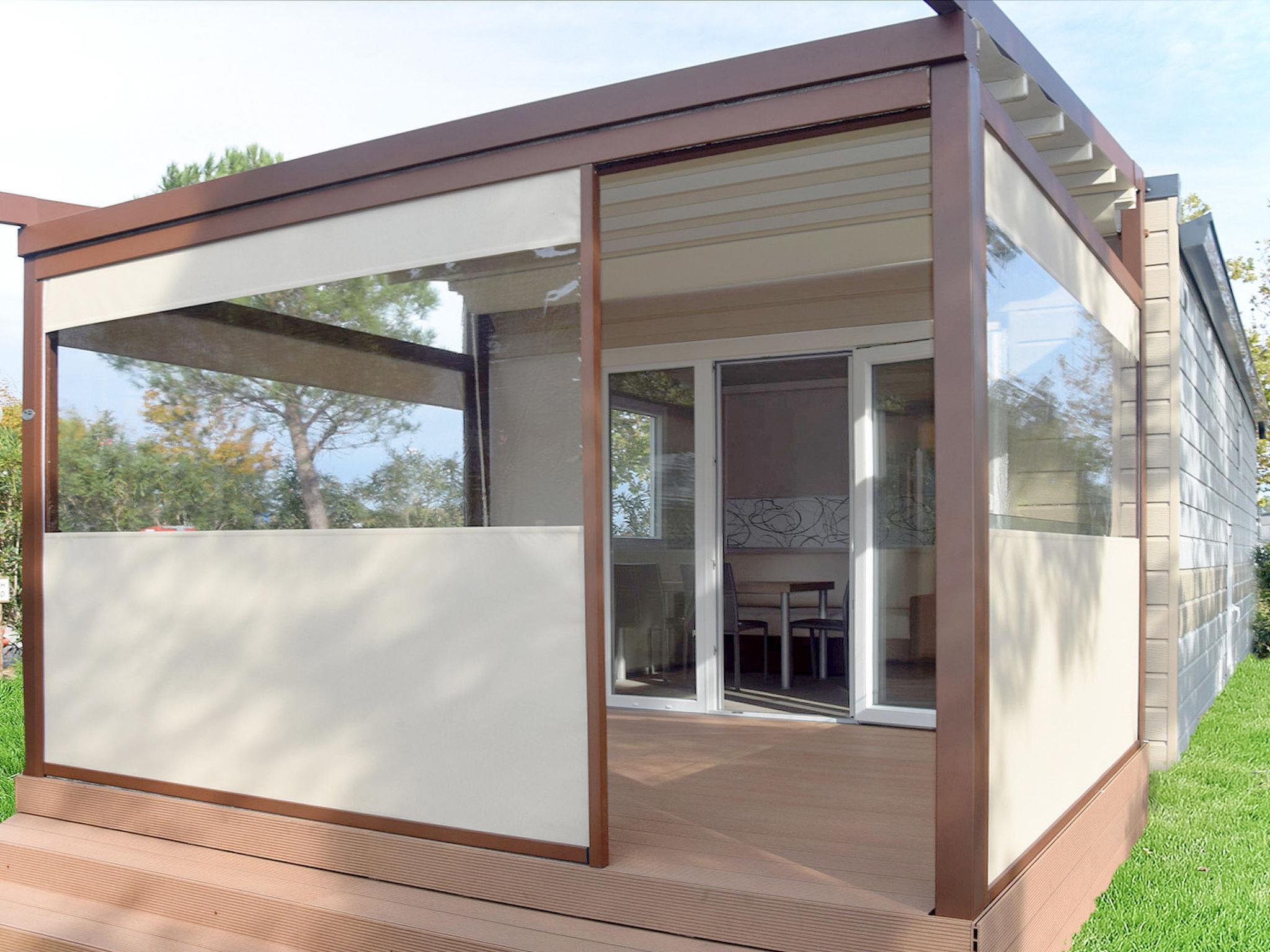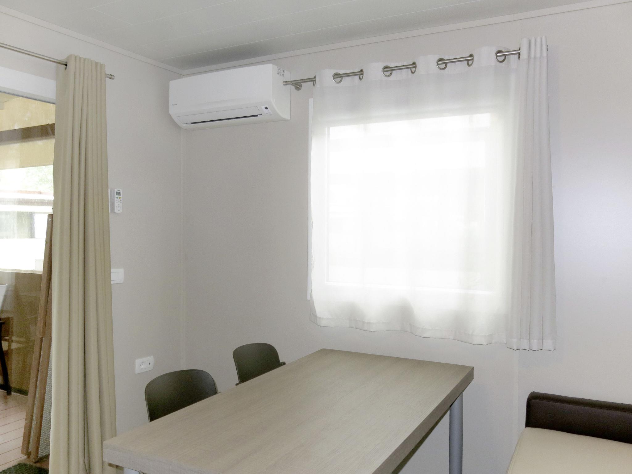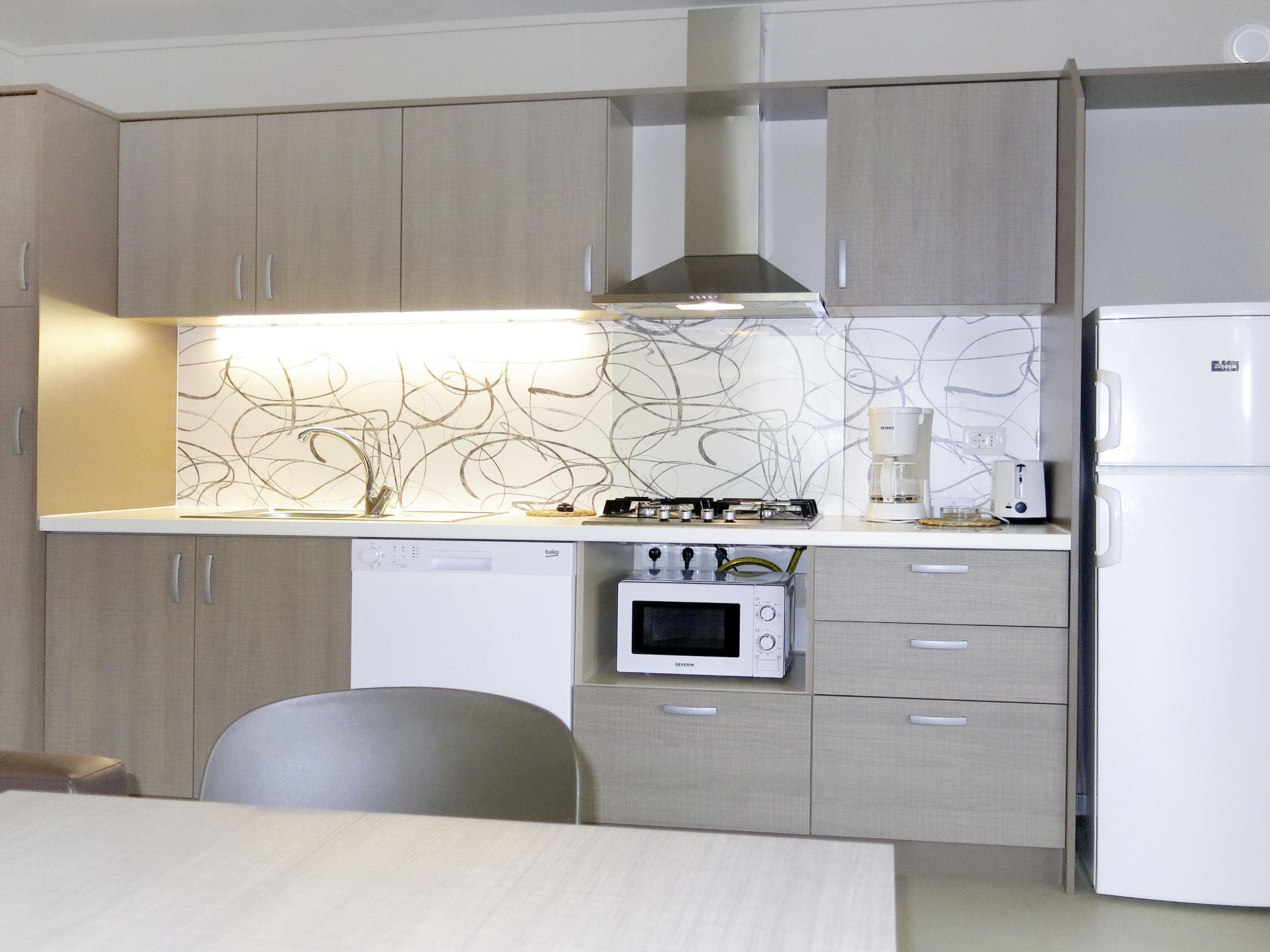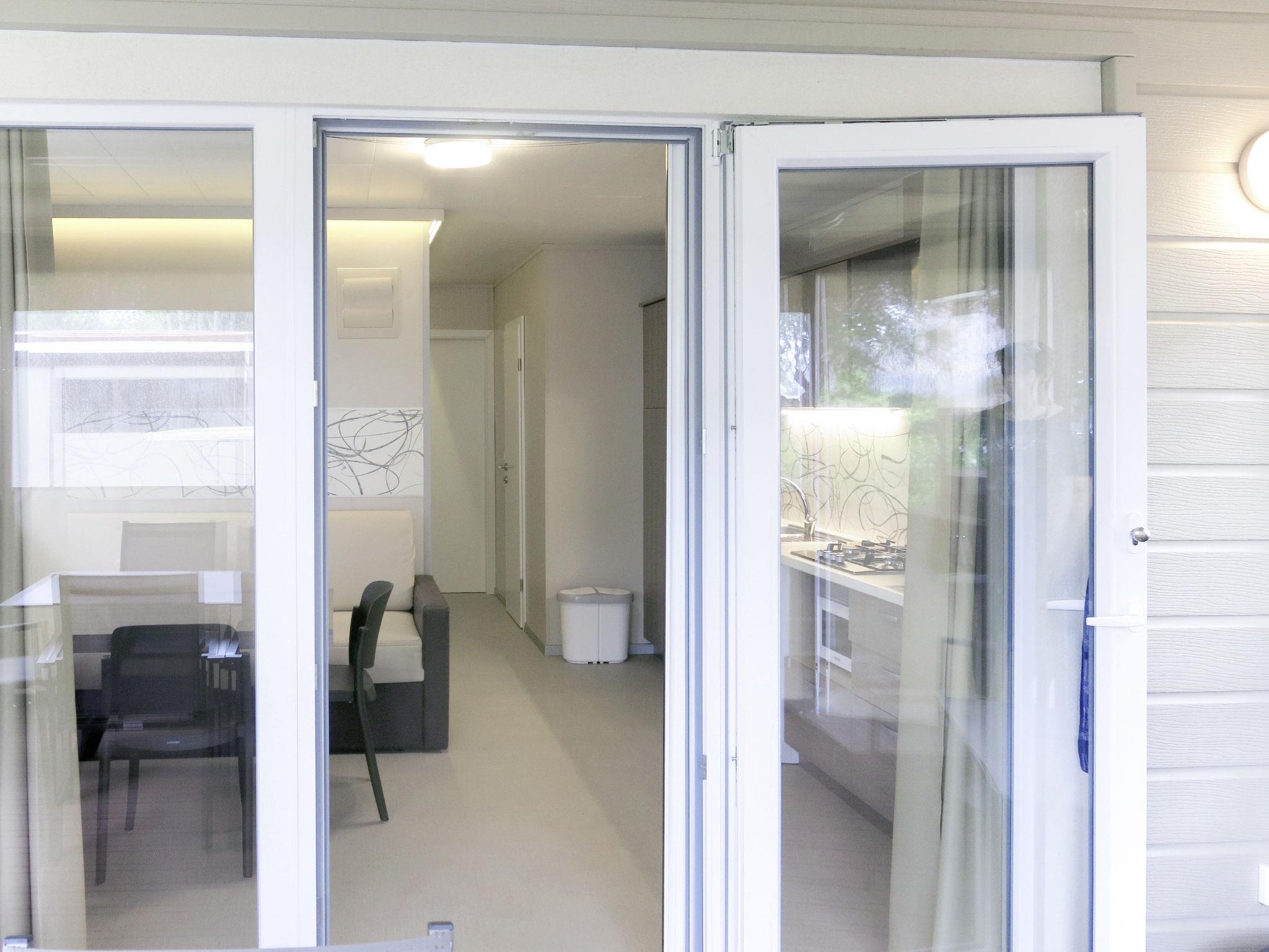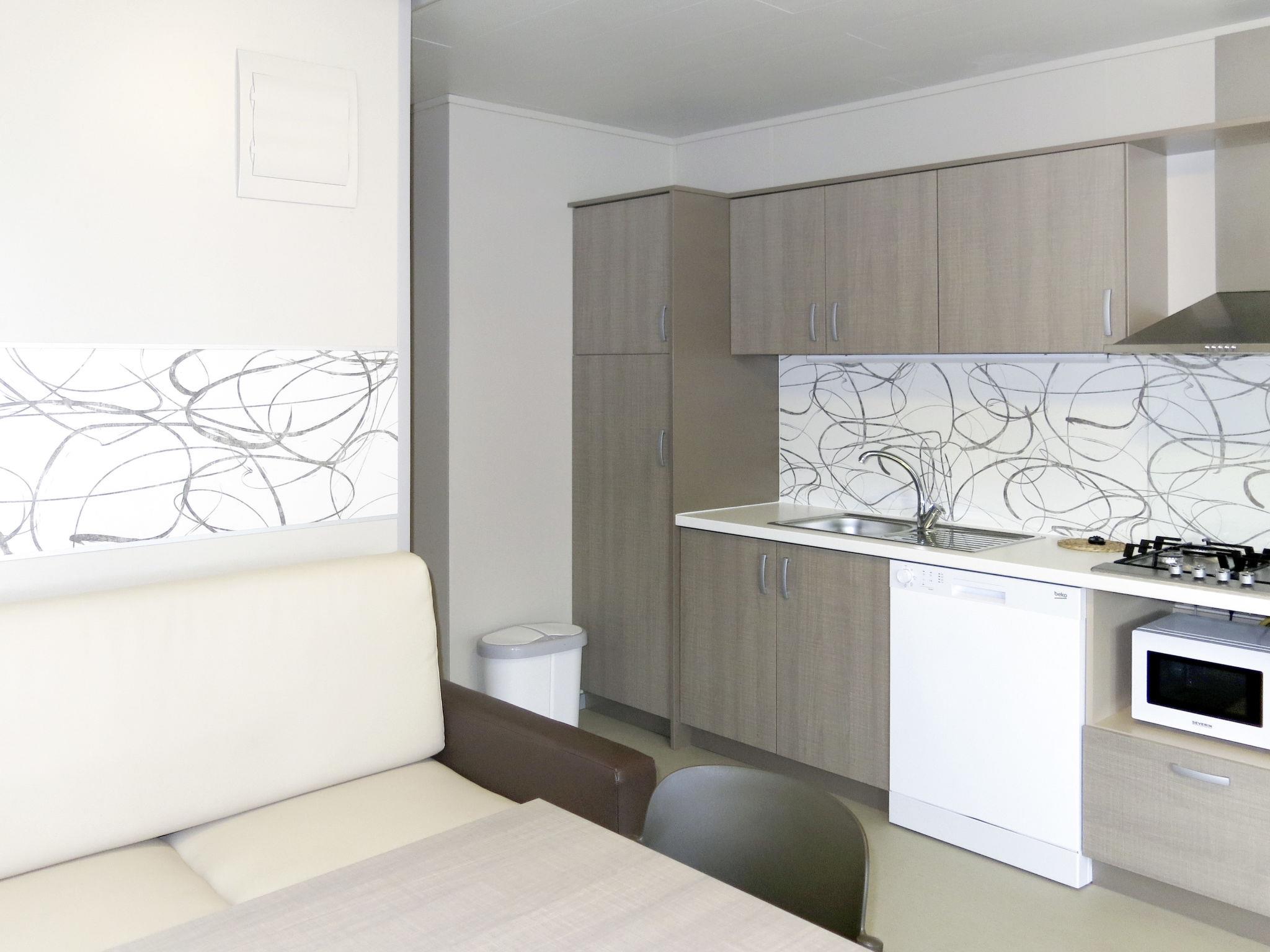 "Sand", 3-room mobile home 40 m2. Modern furnishings: living/dining room with dining table. Exit to the veranda. 1 double bedroom. 1 room with 2 beds and 1 x 1 bunk beds (length 170 cm). Open kitchen (dishwasher, 4 gas rings, toaster, kettle, microwave, freezer, electric coffee machine). Shower/WC. Air-conditioning, forced-air heating. Terrace 12 m2, roofed, small garden. Terrace furniture, deck chairs (2). Facilities: safe, mosquito net, children's high chair, baby cot (extra), hair dryer. Parking (1 car). Please note: non-smoking house. Beach ca. 100-300 m. IT031009B28ZDV3E5N