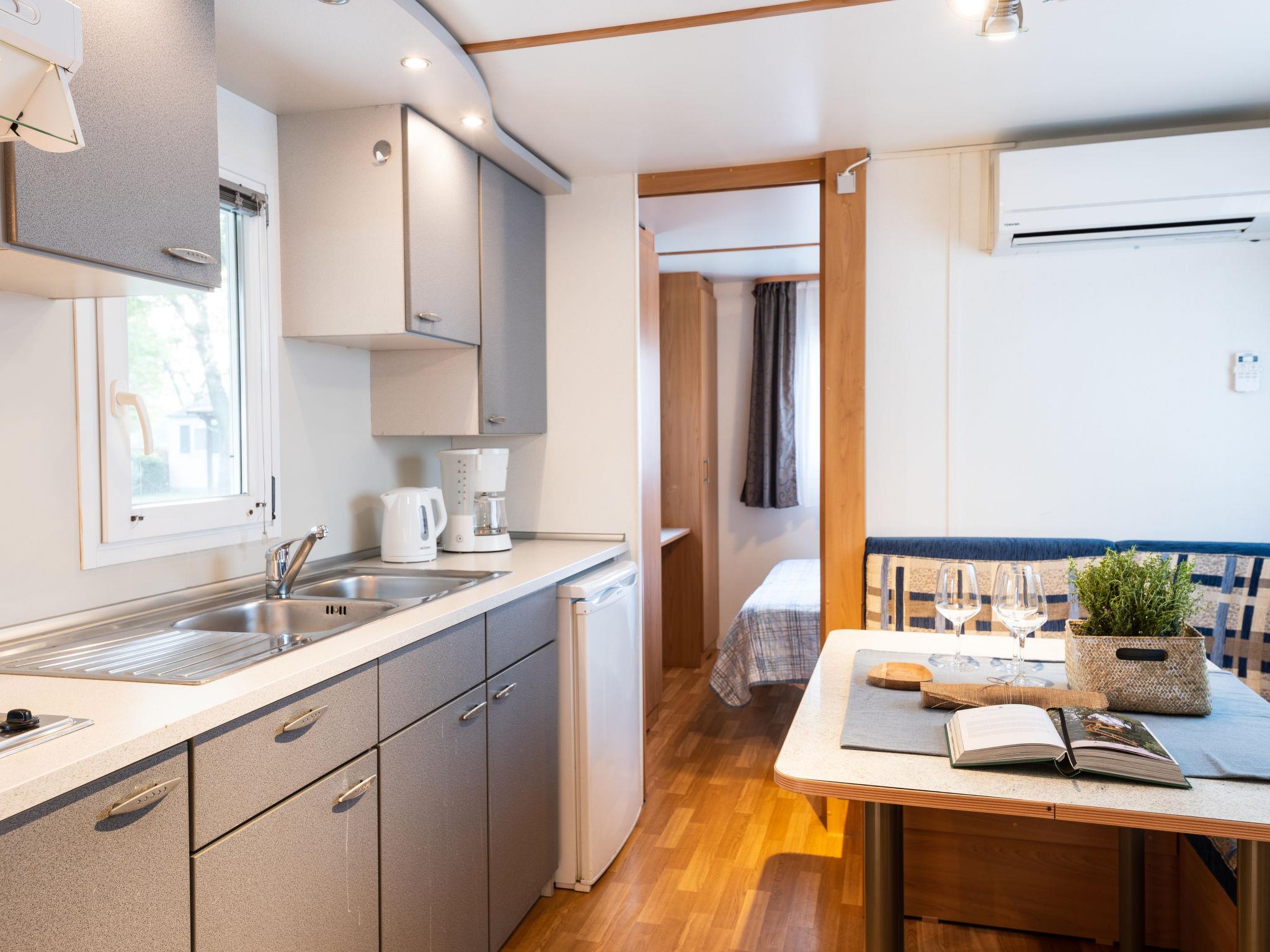 "Garden", 3-room mobile home 24 m2. Practical furnishings: living/sleeping room with 1 double sofabed (140 cm, length 190 cm), dining table. Exit to the terrace. 1 room with 1 french bed. 1 room with 2 beds (65 cm, length 190 cm). Kitchenette (2 hot plates, kettle, microwave, electric coffee machine). Shower/WC. Air-conditioning, forced-air heating. Terrace roofed. Terrace furniture, deck chairs (2). Facilities: safe, mosquito net, children's high chair, baby cot (extra). Parking (1 car). Please note: non-smoking house. Beach ca. 300-400 m. IT031009B28ZDV3E5N