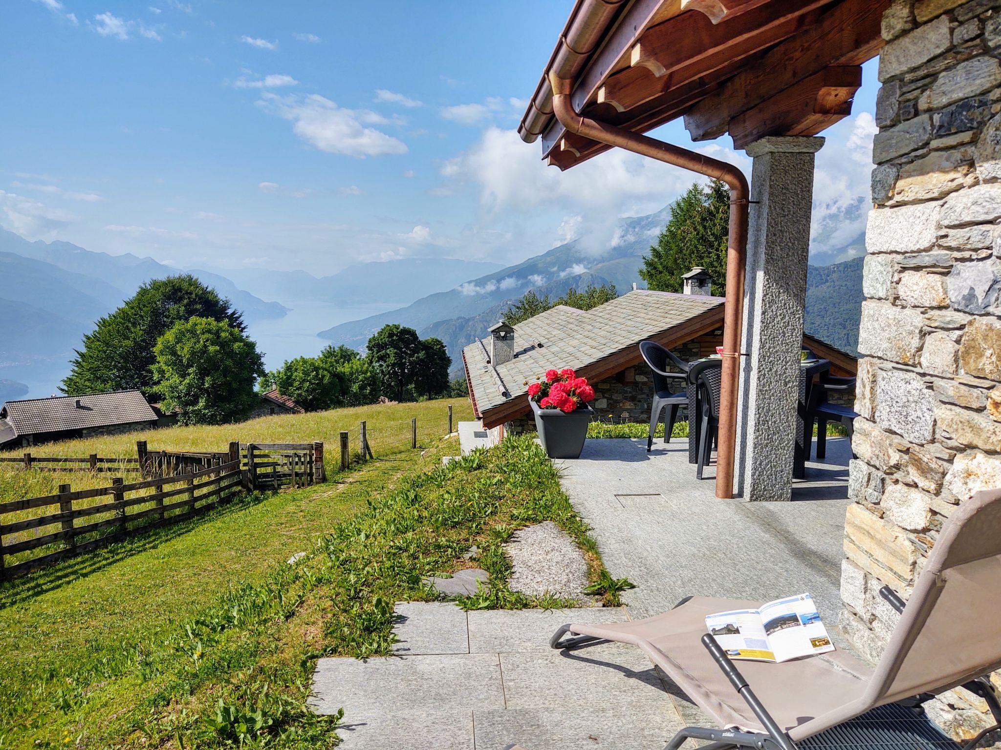 Beautiful "rustico" cottage "Il Nido d'Aquila", 1'150 m a.s.l., built in 2013, surrounded by meadows. In the hamlet Bodone 12 km from the centre of Gravedona, 60 km from the centre of Como, 64 km from the centre of Lugano, in an elevated position on a slope, 12 km from the lake, south facing position. Private: property 500 m2 (fenced), terraced garden with lawn. 5 km long steep, narrow motor access to 30 m from the house (mountain road). 30 m footpath to the house. Parking at the house. Grocery 6 km, supermarket 13 km, restaurant 6 km, bus stop 5.5 km, railway station "Como" 60 km, pebble beach "Gravedona" 12 km, outdoor swimming pool 12 km. Marina 12 km, golf course (18 hole) 39 km, sailing school 12 km. Nearby attractions: Agriturismo Zertin. Hiking paths: Monte La Motta. Please note: car recommended.