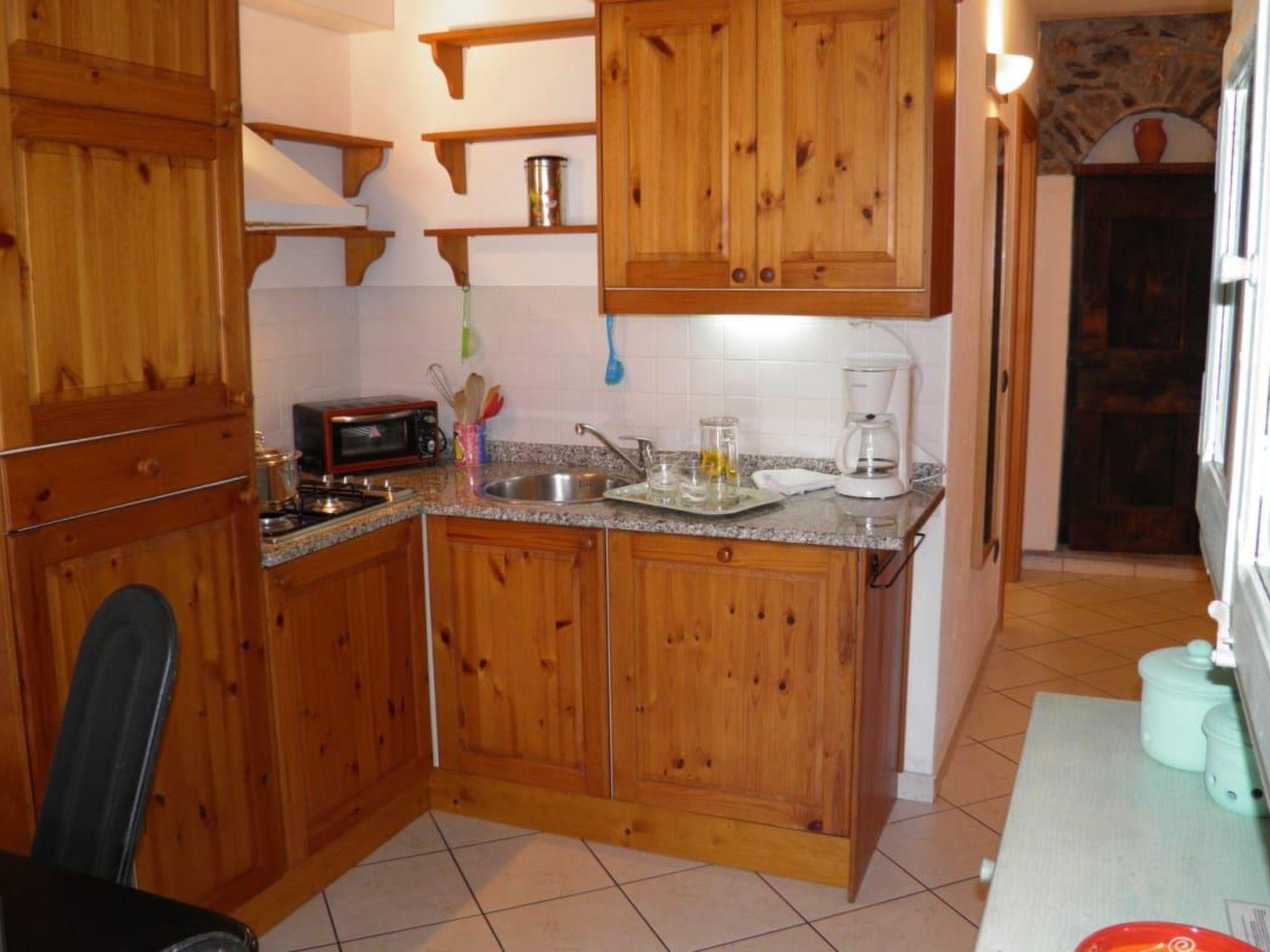 Inside, you will find a lovingly designed living room with a rustic stove, a sofa bed for flexible sleeping arrangements and an open-plan, integrated kitchen. There is also a double bedroom and a small, cool grotto, ideal for storing drinks. The living room leads directly into a small bedroom with a bunk bed. The bathroom completes the well-designed interior of the flat.