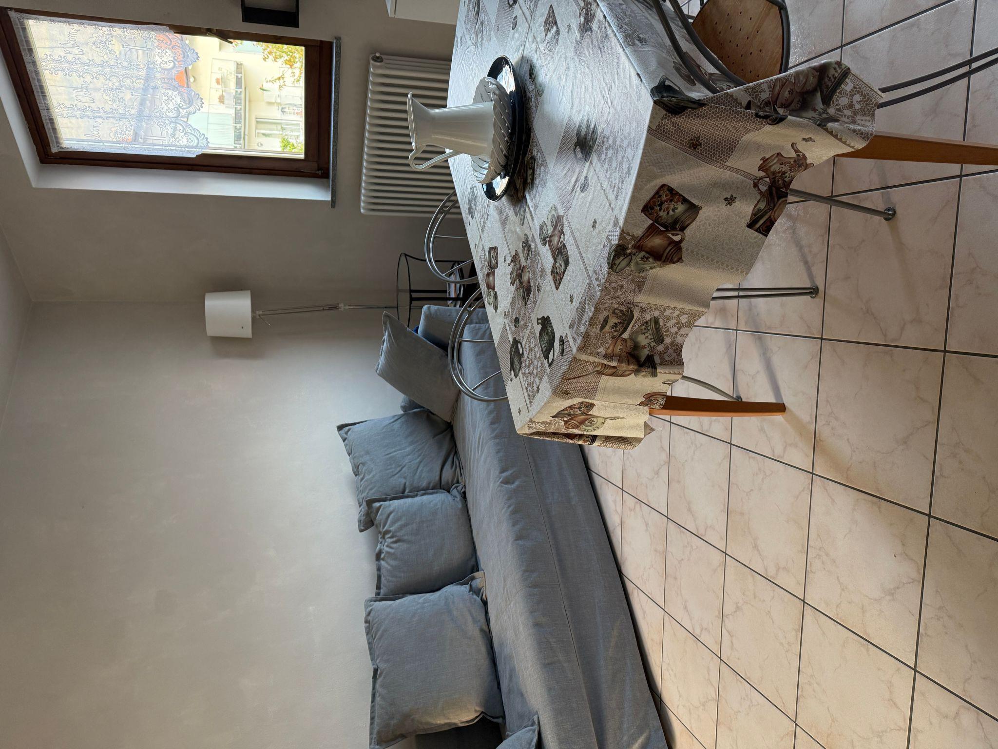 Inside, the flat boasts a cosy living room equipped with a comfortable sofa bed, an armchair and a TV, perfect for relaxing evenings. The kitchenette is fully equipped with a fridge, freezer, electric oven, gas cooker and dishwasher, ideal for preparing meals as if you were at home. The bathroom, although windowless, is complete with all necessities, including washbasin, shower, bidet, toilet and washing machine. A wooden staircase leads to the bright and cosy attic, where two bedrooms with wooden floors, large wardrobes and sliding doors for total privacy and comfort await.
