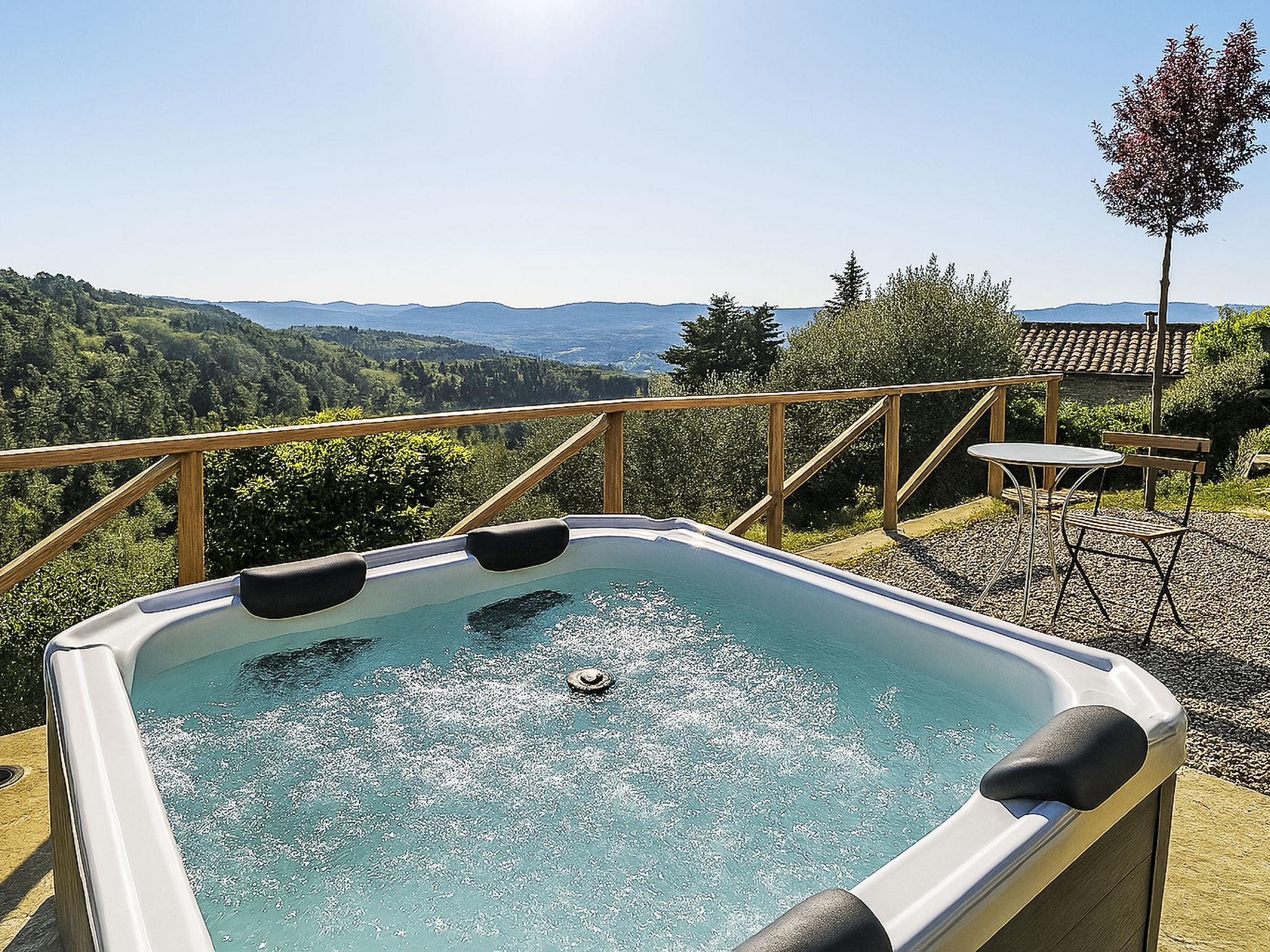 Greve in Chianti: Very old, historical 2-family house "Il canto dei merli", 500 m a.s.l., 2 storeys, from the 15th century, renovated, surrounded by trees and vineyards. 2 apartments in the property. In the hamlet Le Corti with 10 houses 5 km from the centre of Greve in Chianti, in a quiet, sunny position on top of a hill, 100 m from the edge of the forest, 110 km from the sea, in the countryside. For shared use: natural state property (fenced), terraced garden. Private: swimming pool (above ground) (2 x 2 m, seasonal availability: 01.Apr. - 31.Oct.). Hot tub, terrace, garden furniture, barbecue, pool maintenance by the owner/gardener. In the house: air conditioning, washing machine, heating available only from 15.Oct. - 15.Apr.. 2.2 km long bumpy motor access to the house. In Winter: please take snow chains. Parking (for 2 cars) at the house. Shop 5 km, grocery 5 km, supermarket 5 km, restaurant 3 km, bicycle rental 5 km, bus stop "Chisntigiana" 4 km, railway station "Firenze" 39 km, sandy beach "Cecina Mare" 113 km, outdoor swimming pool 7 km, thermal baths "Rapolano Terme" 60 km. Golf course (18 hole) 23 km, tennis 7 km, indoor tennis centre 7 km, walking paths from the house 100 m. Nearby attractions: Firenze 39 km, Siena 50 km, SAn Gimignano 50 km, Gaiole in Chianti 23 km. Please note: car recommended. Baby equipment (included). Owner lives in separate semi-detached house. The owner has a dog.