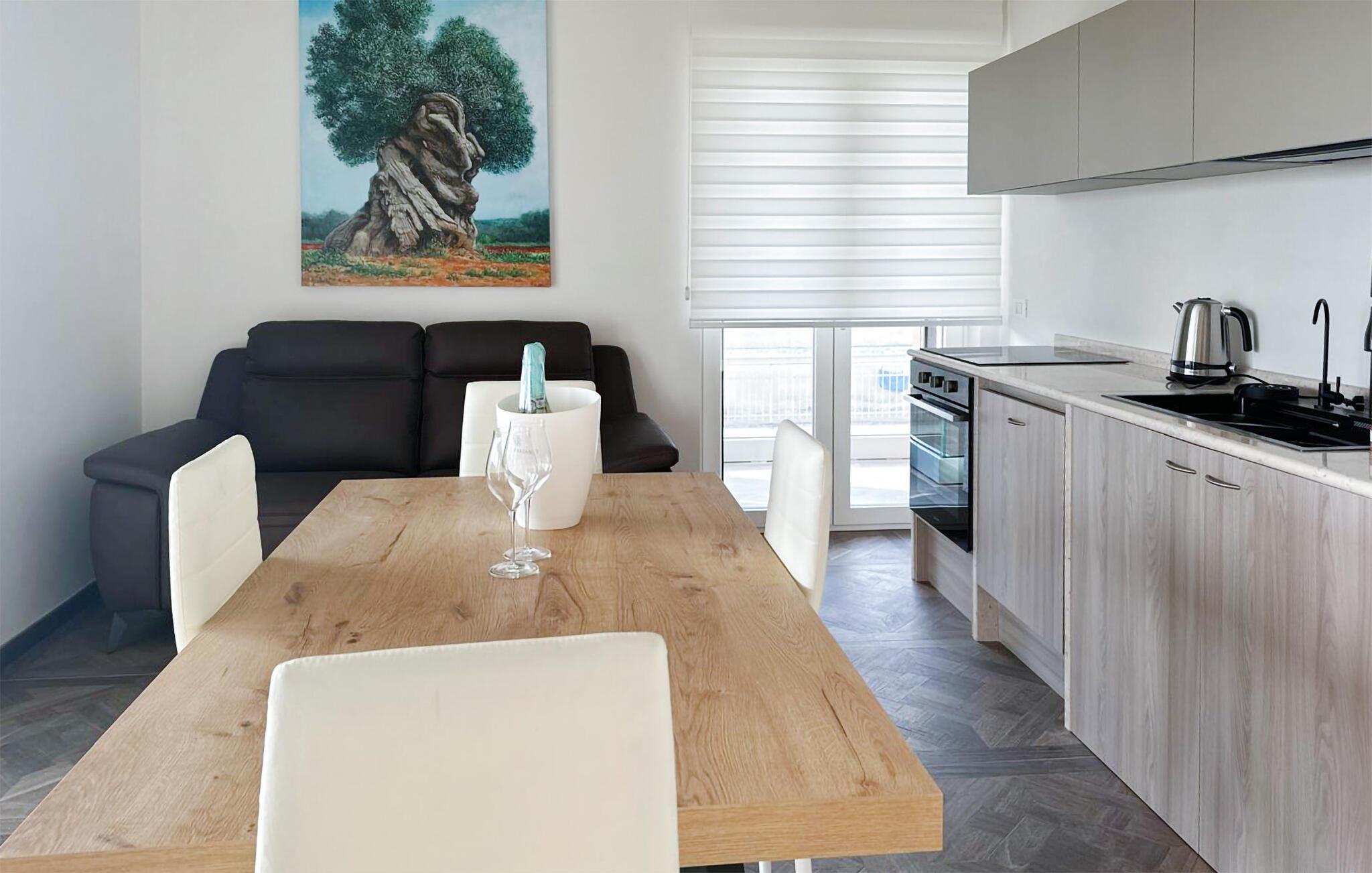 Forkæl jer selv med en ferie fuld af komfort og afslapning og nyd jeres ophold i denne højkvalitets ferielejlighed med familien eller familien. Det lyse design med udvalgt indretning skaber en elegant stemning for jer, hvor I kan føle jer godt. Find jer godt til rette i sofaen eller lav mad sammen i det veludstyrede køkken.
