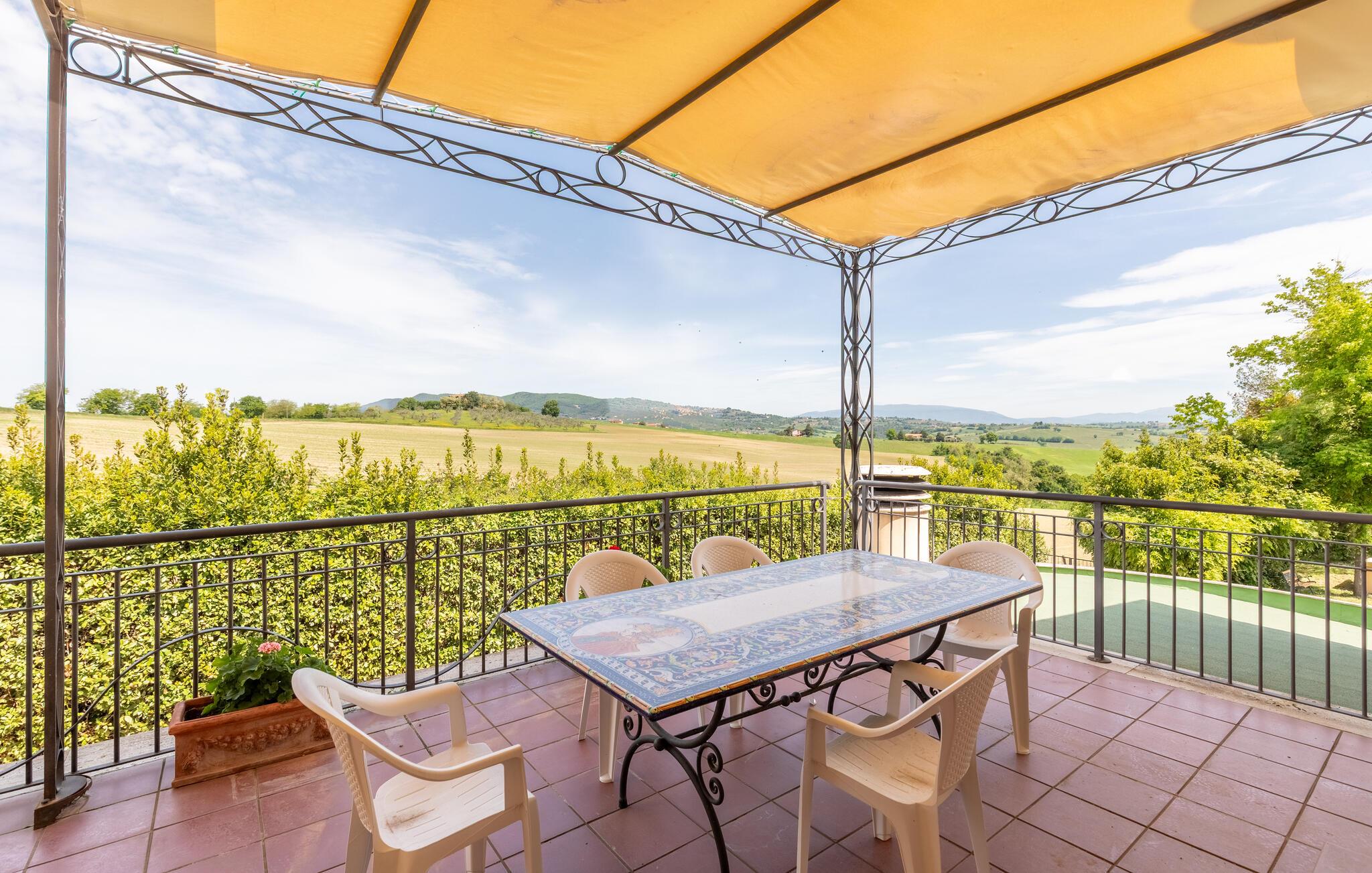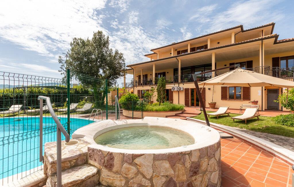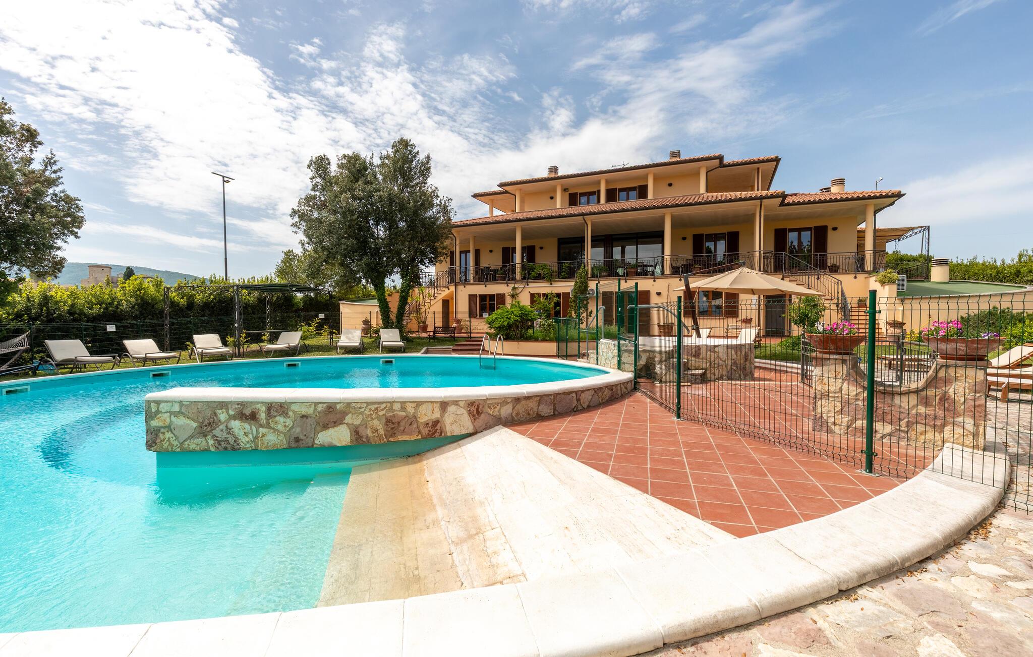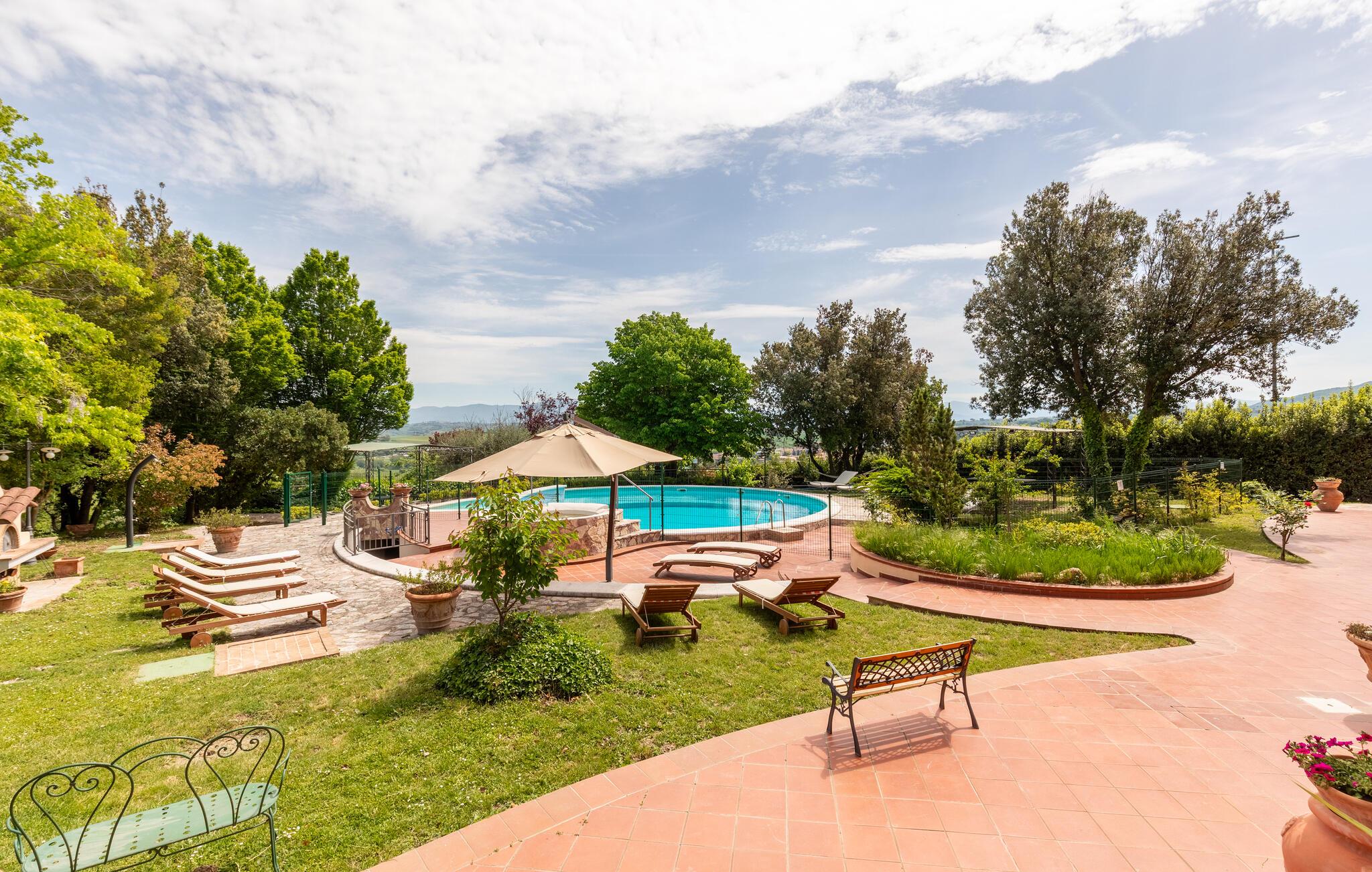 Denne rummelige ejendom i Gualdo Cattaneo tilbyder masser af plads til en stor familie eller vennefamilier. De komfortable og indbydende møbler skaber en varm atmosfære, hvor I kan tilbringe afslappende timer med at lave mad, spise og lege sammen. Verandaen og balkonen lægger op til at tilbringe stille stunder med udsigt over de grønne omgivelser, mens poolområdet i haven er det perfekte sted til forfriskende timer under den italienske sol. Oplev den rummelige have, smukke terrasser og bagning og grill i haven.