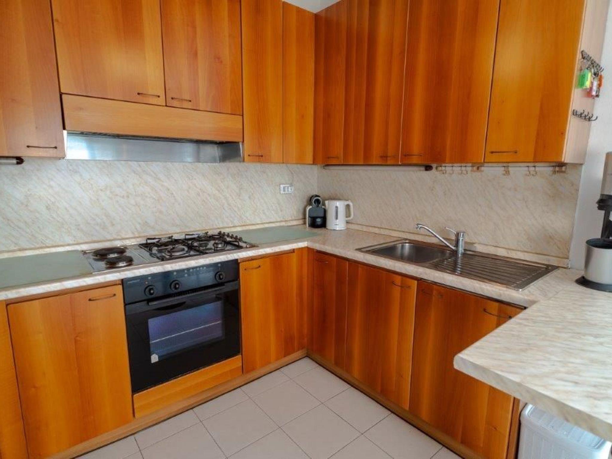 • Küche mit einer kleinen Theke, gut ausgestattet mit Backofen, Mikrowelle, Kaffeemaschine, Spülmaschine und einem Kühlschrank mit Gefrierfach