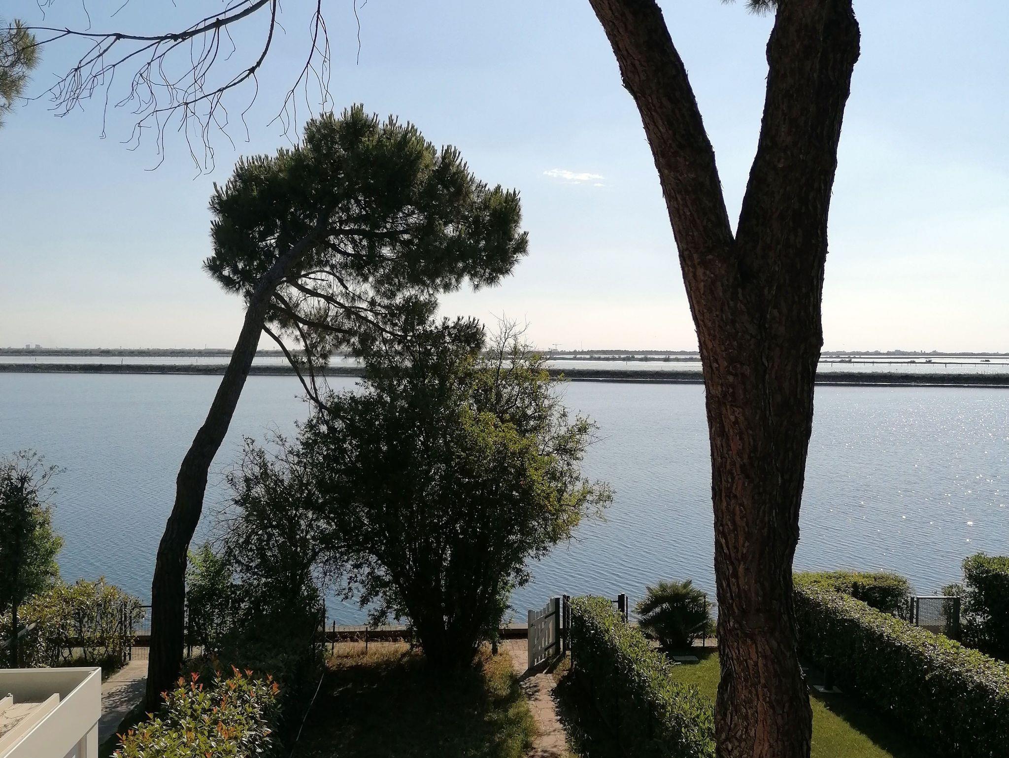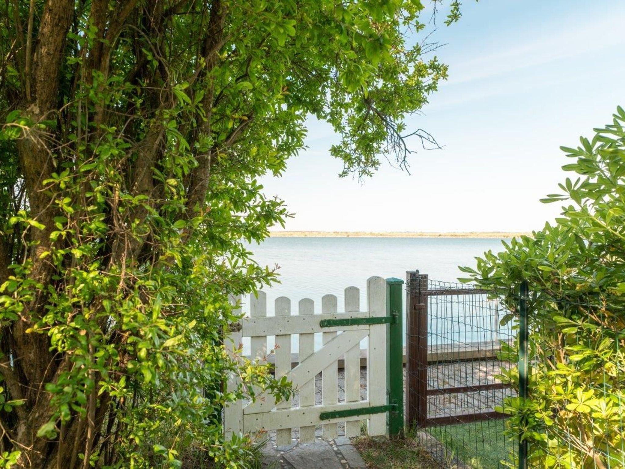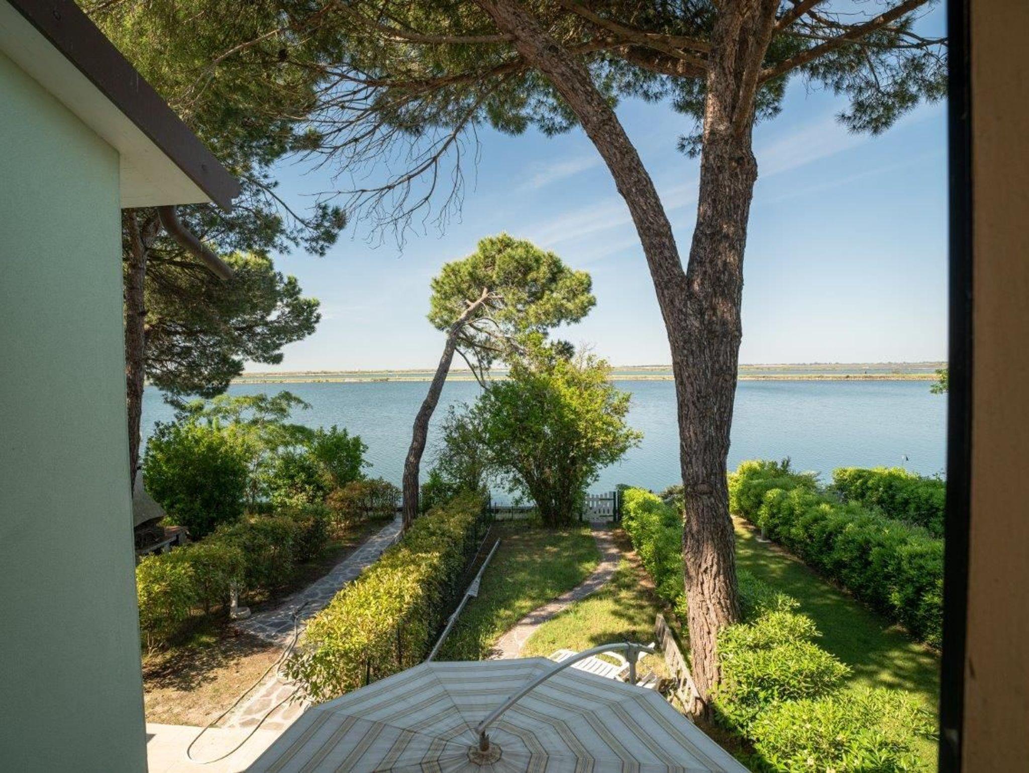 Eingezäunter Garten mit Gartenmöbeln und Sonnenliegen, Sonnenschirm und Zugang zur Lagune über einen privaten Steg mit Treppe