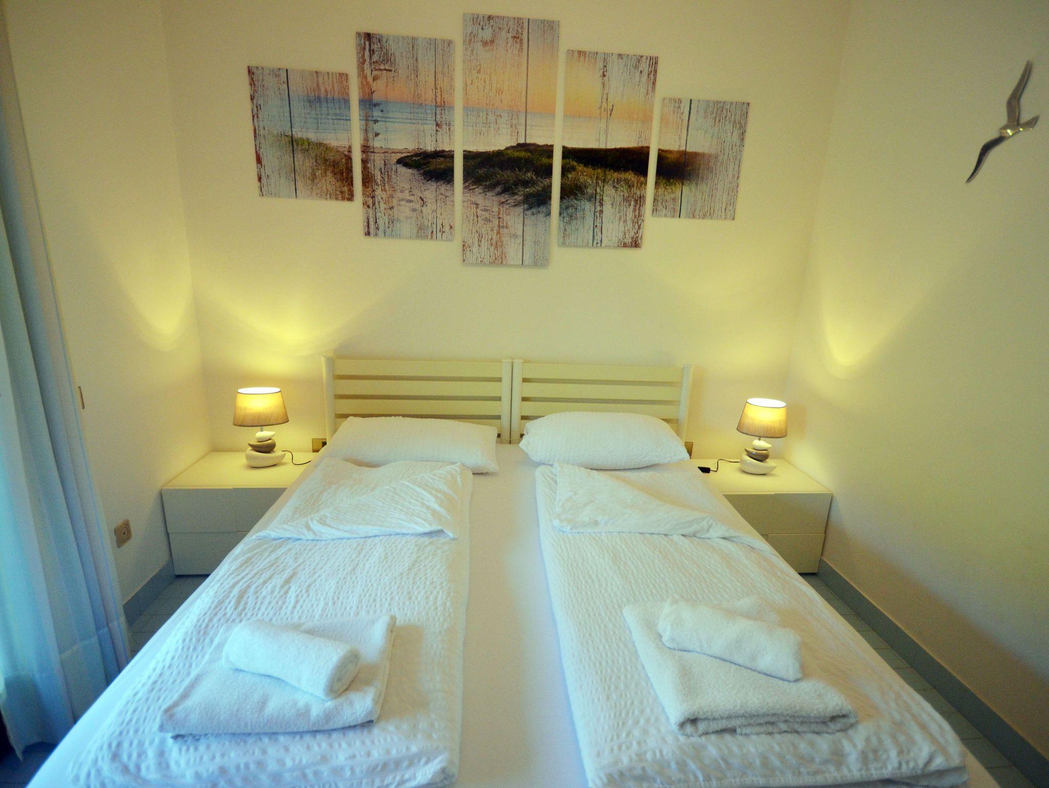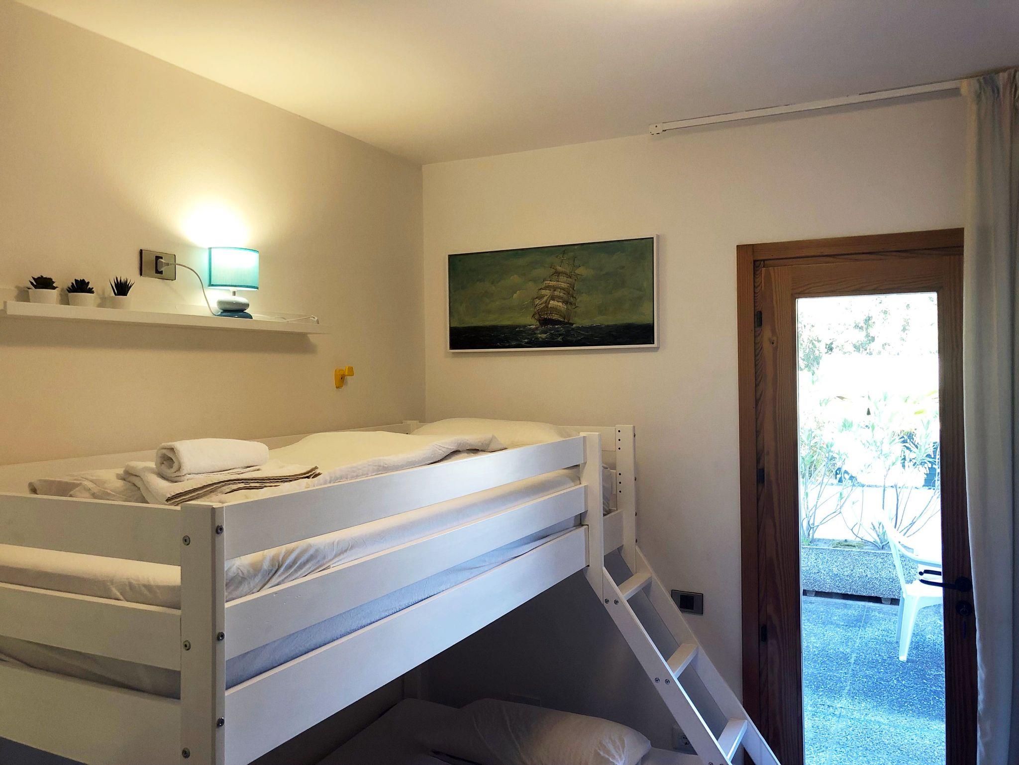 • Zwei Schlafzimmer je mit Tür zu Nord-Terrasse, Doppelbett / Kajütenbett