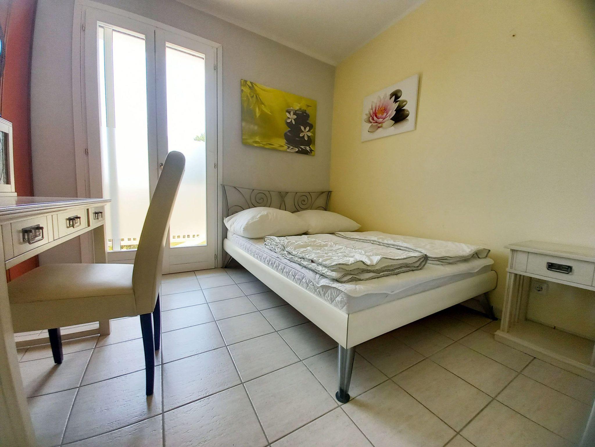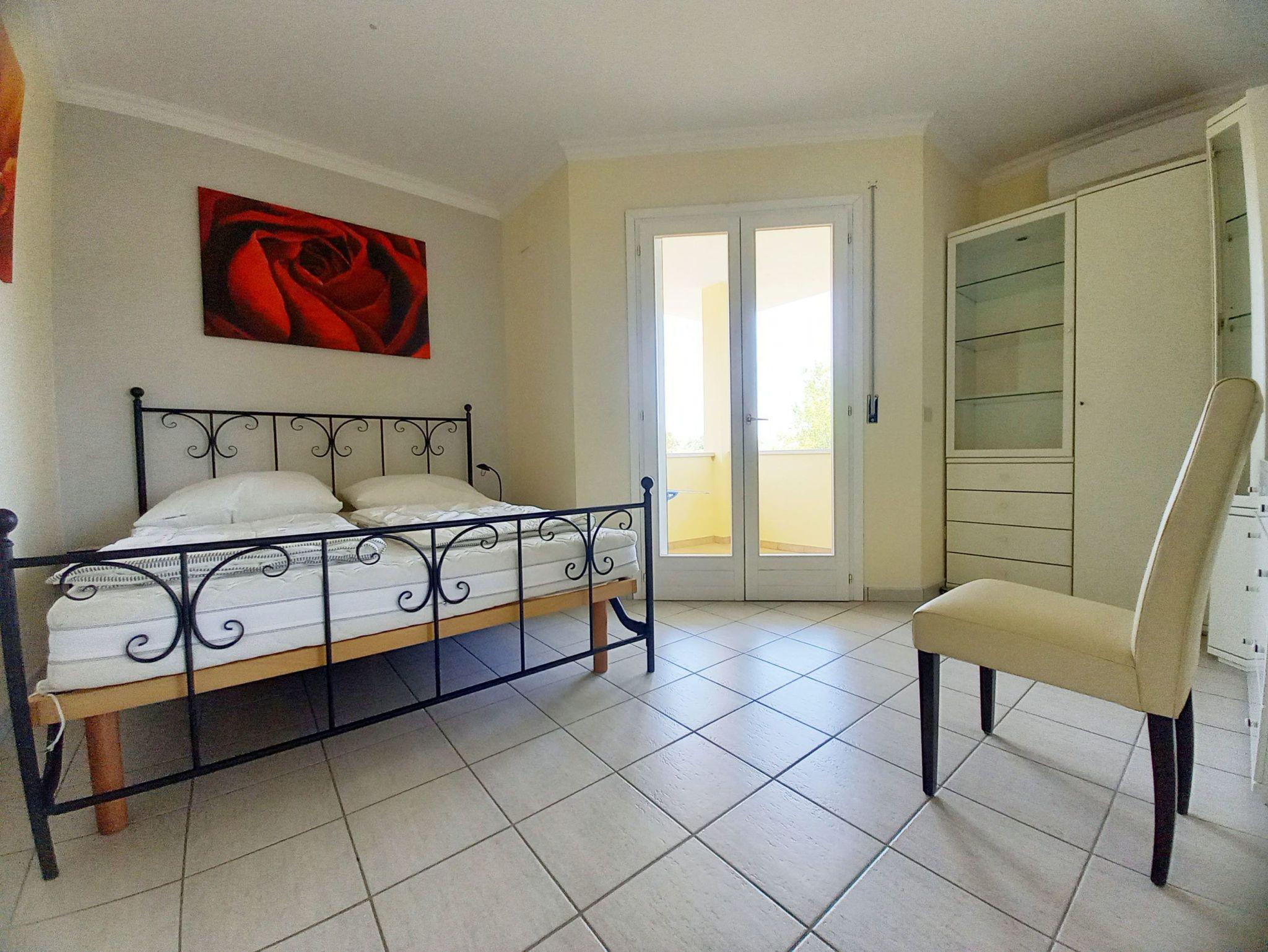 • Ein Schlafzimmer mit großem Schrank Doppelbett, Klimaanlage und Türe zur Terrasse Richtung Wasser