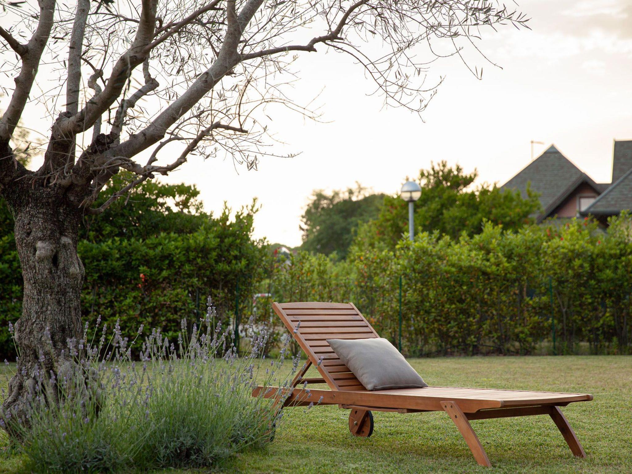 • Sonnenliegen und großer Sonnenschirm aus Holz