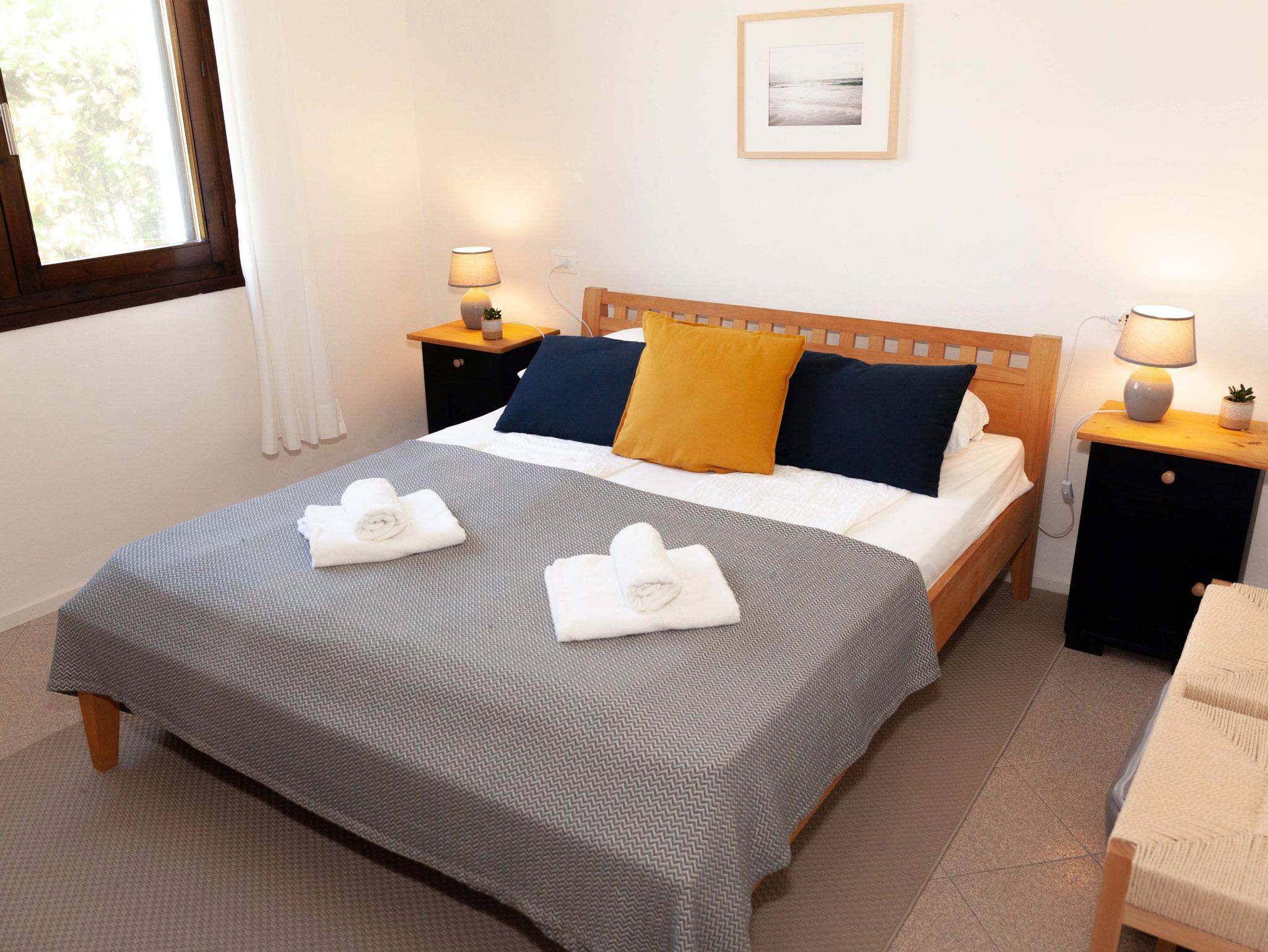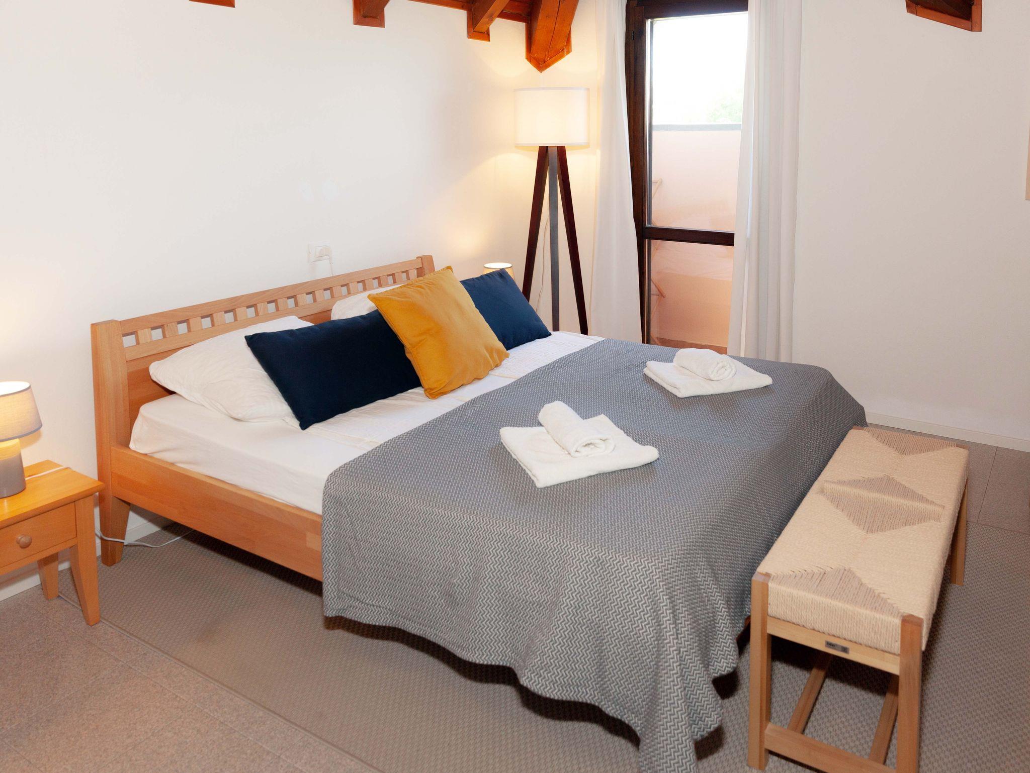 • Ein Schlafzimmer mit Doppelbett, Klimaanlage, Blick in den Garten und eigenem Bad (Dusche, WC und Bidet)
