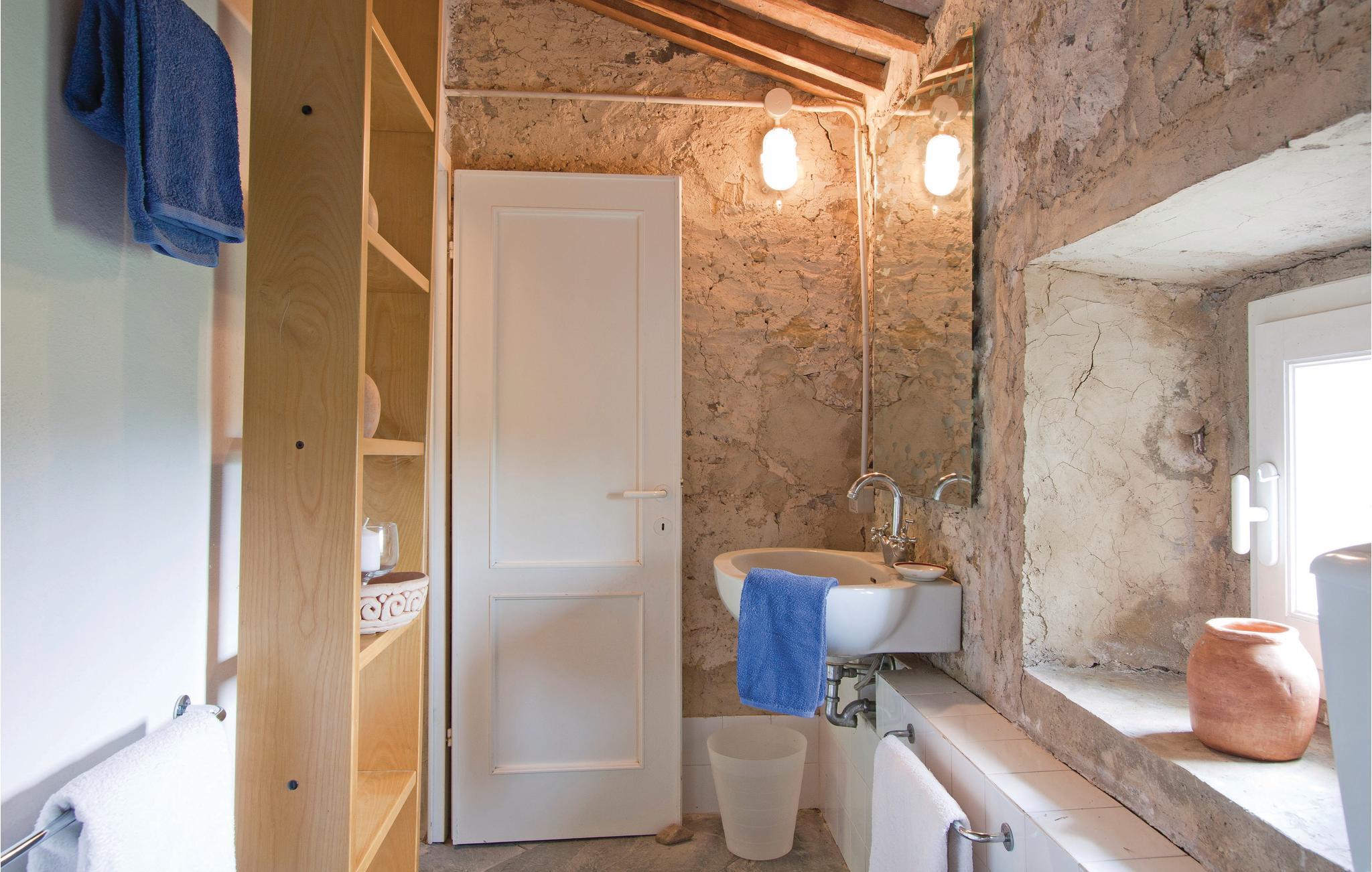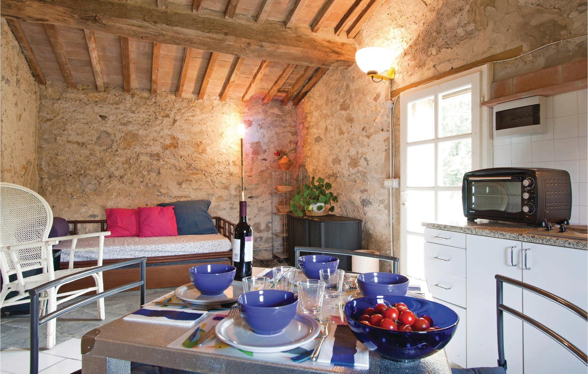 Hvis I søger en pause fra en travl hverdag, tilbyder dette charmerende landhus en enkel, men autentisk bolig omgivet af natur. Nyd roen, og brug omgivelserne til lange gåture. Huset er funktionelt indrettet med et opholdsområde og et åbent køkken. De rustikke stenmure og synlige træbjælker giver rummet en særlig atmosfære. Spisebordet indbyder til hyggelige måltider, og det lille køkken har de mest nødvendige faciliteter til at tilberede enkle retter. Om aftenen kan I slappe af på sofaen eller nyde en god bog i naturligt lys.