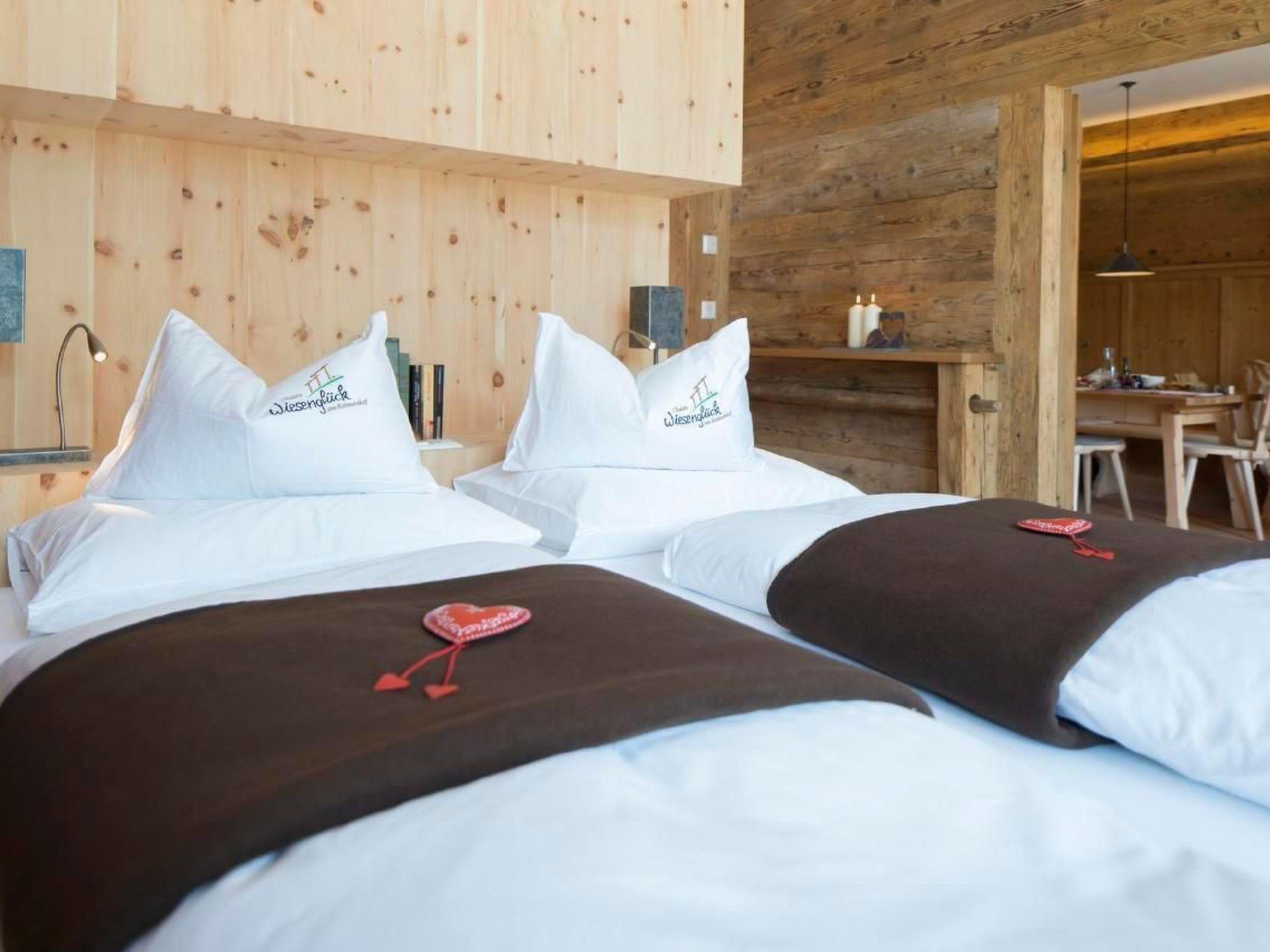 The chalet is situated at an altitude of 1,500 metres in a fantastic secluded location with an impressive view of the Casies mountains and the Dolomites. It consists of 5 enchanting lodges spread over 2 levels, each with a living space of 90 sq m. Each lodge is designed for 2-5 people and has its own sauna with infrared heat, a private terrace of over 100 sq m with heated hot tub, a free-standing bathtub with a view of the open fireplace, a rock shower, 2 cosy bedrooms, a kitchen, large living room and 2 bathrooms. What you will find in your lodge:-Welcome snack on arrival -Daily natural balanced mountain breakfast brought directly to your lodge -Own Finnish sauna with infrared heat and local aromas of Swiss stone pine, orange and eucalyptus -Own hot tub on the over 100m² private terrace in the open air with a view of the mountains -Rock shower, which gives the body a fresh and stimulating effect-Perfectly stocked wood for the open fireplace -Guestpass/Holidaypass for free use of public transport in South Tyrol-Fully automatic coffee machine and tea bar-Fully equipped kitchen with salt, pepper, vinegar, oil and sugar, pepper, vinegar, oil and sugar -Wine cabinet with selected South Tyrolean wines and beers, as well as local schnapps (for a fee) -Cosy bathrobes, hot water bottle and slippers -Towel change and linen change on request -Daily cleaning -Safe -Free WiFiIn summer, put on your hiking boots and set off to explore the surrounding alpine pastures without having to take the car.In winter, the entrance to the cross-country ski trail is 200 metres from the chalet. Walk directly from the chalet into the white winter splendour, there are many alpine pastures to discover and then a fun toboggan ride awaits you directly back to the chalet.1 kilometre away is the nearest ski slope, a small ski slope with ski school and ski hire for beginners. 25 kilometres away is the Kronplatz, the No. 1 ski area with 119 kilometres of pistes. In the evening after an eventful day we also serve typical South Tyrolean Pfandl dishes such as dumplings, Schlutzkrapfen, pasta, entrecôte, Wiesenglück burgers and much more in our own Wiesen-Lodge. Andrea and her team look forward to your visitShort descriptionOther : Non-smoking houseShort description 1Number of kitchens : 1SurroundingsSports facilities in the surrounding area : Mountaineering, Golf course, Hunting, Climbing, Mountain biking, Paragliding, Cycling, Indoor riding centre, Riding arena / riding possibilities, Tobogganing, Cross-country skiing, Alpine skiing, Tennis Garden and outdoor facilitiesRecreational facilities at the property : Steam bath, Sauna, Playground, Table tennis, WhirlpoolGarden equipment : Garden furniture available, Barbecue, Playground equipment Services Services (may apply) chargeable) : Breakfast, Drinks service, Cleaning service during your stay, Transfer service (airport etc.), Maid service Other services : -Welcome snack on arrival-Daily natural, balanced mountain breakfast, which is brought directly to your lodge -Own Finnish sauna with infrared heat and local flavours of Swiss stone pine, orange and eucalyptus -Own hot tub on the 100m² private terrace in the open air with a view of the mountains -Rock shower, which gives the body a fresh and stimulating effect -Perfectly stocked wood for the open fireplace -Guestpass/Holidaypass for free use of public transport in South Tyrol -Fully automatic coffee machine and tea bar -Fully equipped kitchen with salt, pepper, vinegar, oil and sugar, Fully equipped kitchen with salt, pepper, vinegar, oil and sugar -Wine cabinet with selected South Tyrolean wines and beers, as well as local schnapps (for a fee) -Cosy bathrobes, hot water bottle and slippers -Towel change and linen change on request -Daily cleaning until 12.30 am -Safe-Free WiFiEach lodge has its own small wellness area: -Finnish sauna with infrared back radiator and essential oils -Own hot-pot (sole use) on your own 100m² terrace -A freestanding bathtub with bath salts -An invigorating rock shower -Bathrobes, hot water bottle and slippers -High-quality Luis Trenker care products.