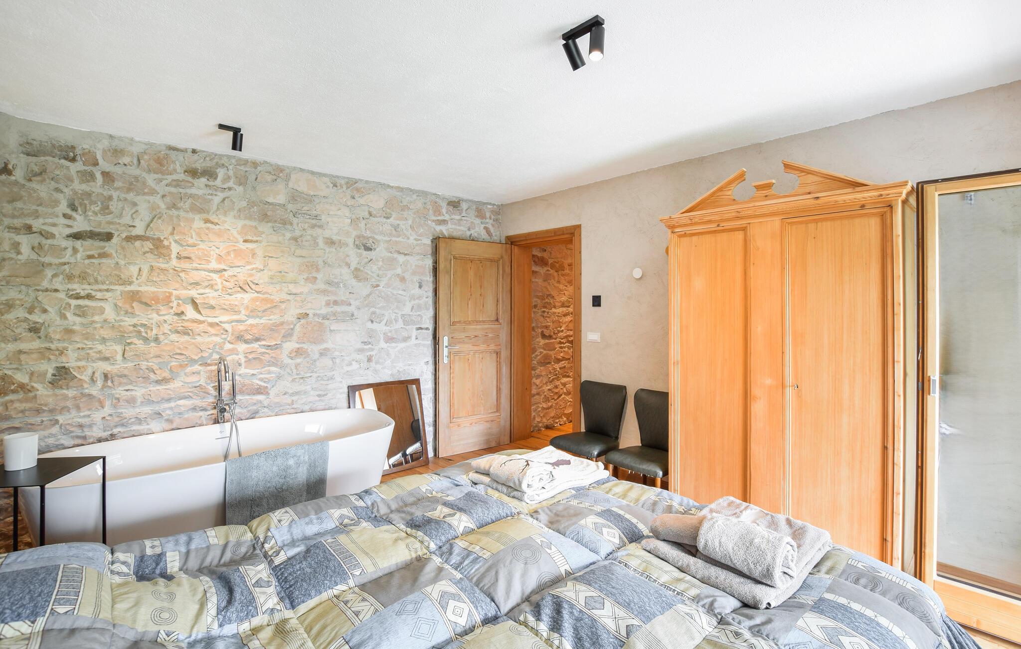 Hold den perfekte ferie i dette feriehus, som kombinerer luksus og komfort på to etager. Den stilfulde kombination af smagfulde stenvægge, klassiske træmøbler og moderne løsninger skaber en unik stemning. Glæd jer til afslappende stunder i det fritstående badekar, som understreger det elegante design.