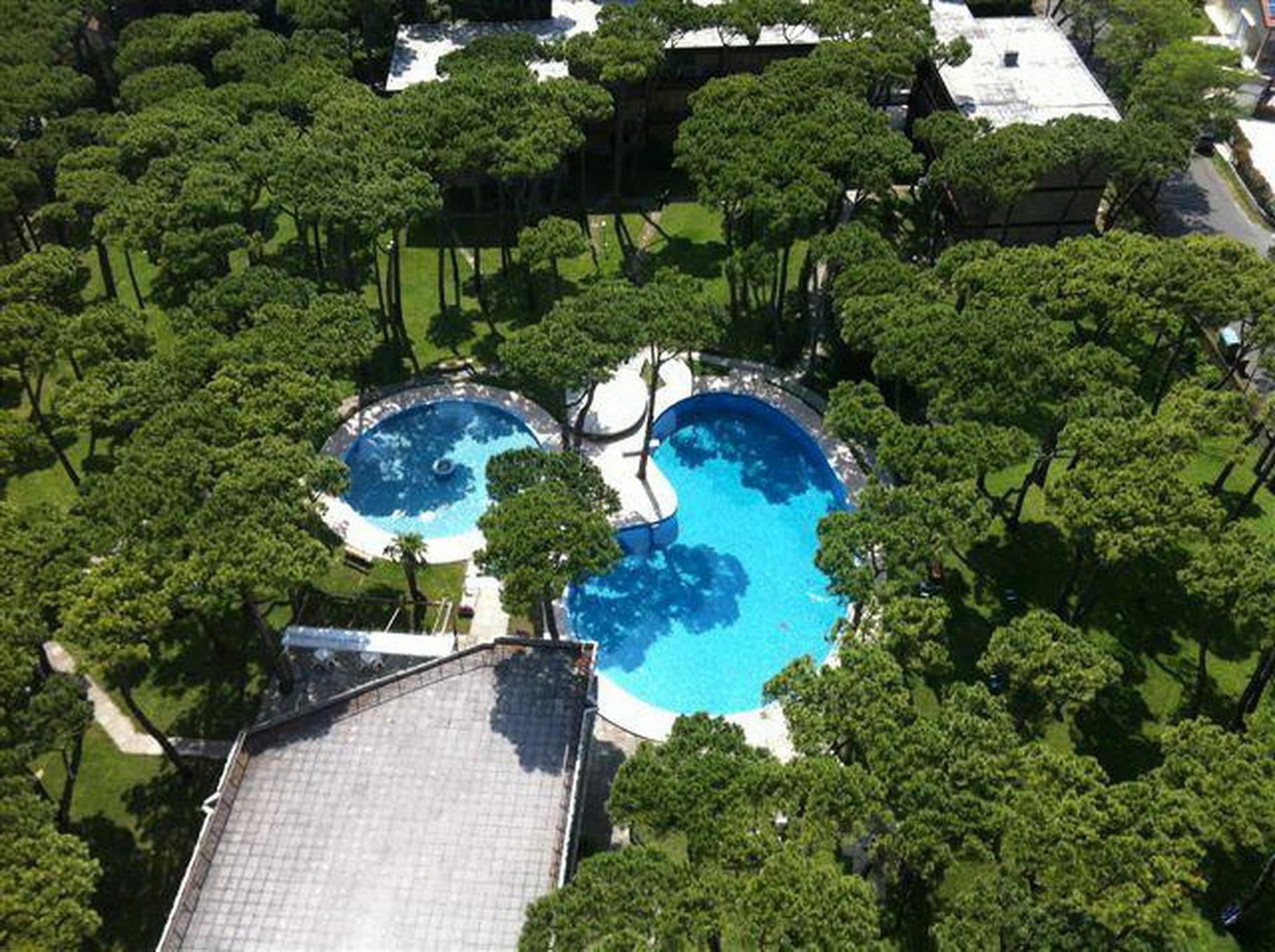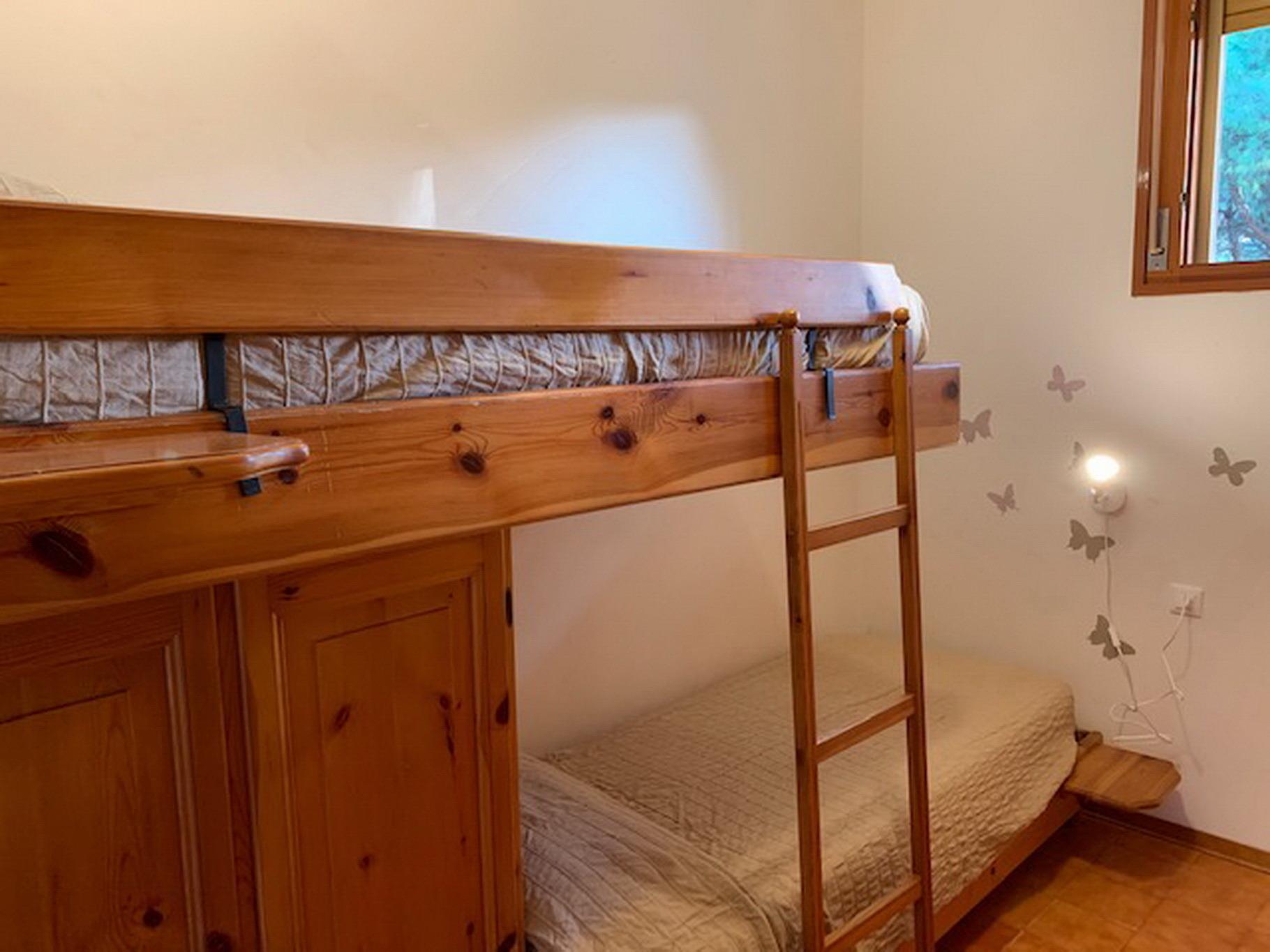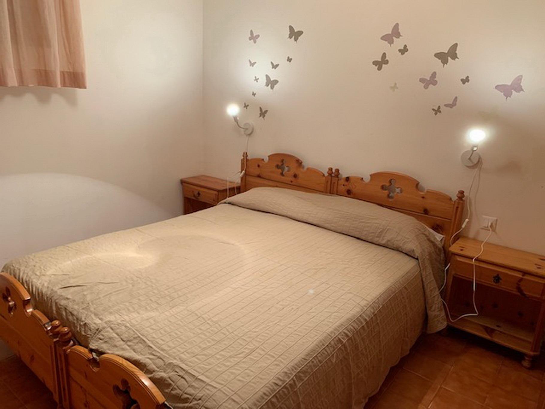 Die angebotene Wohnung ist eine Dreizimmerwohnung und befindet sich im zweiten Stock eines Gebäudes ohne Aufzug. Sie liegt in einer sogenannten Dependance, also einem separaten Teil der Wohnanlage, und bietet einen Blick auf den Swimmingpool. Die Wohnung besteht aus einem Wohnzimmer, einer separaten Kochnische, einem Badezimmer, einem Schlafzimmer mit Etagenbett und einem weiteren Schlafzimmer mit Doppelbett. Zusätzlich gibt es auch eine Doppelschlafcouch im Wohnzimmer. Die Wohnung ist mit einem Fernseher, einer Klimaanlage und einer Waschmaschine ausgestattet.