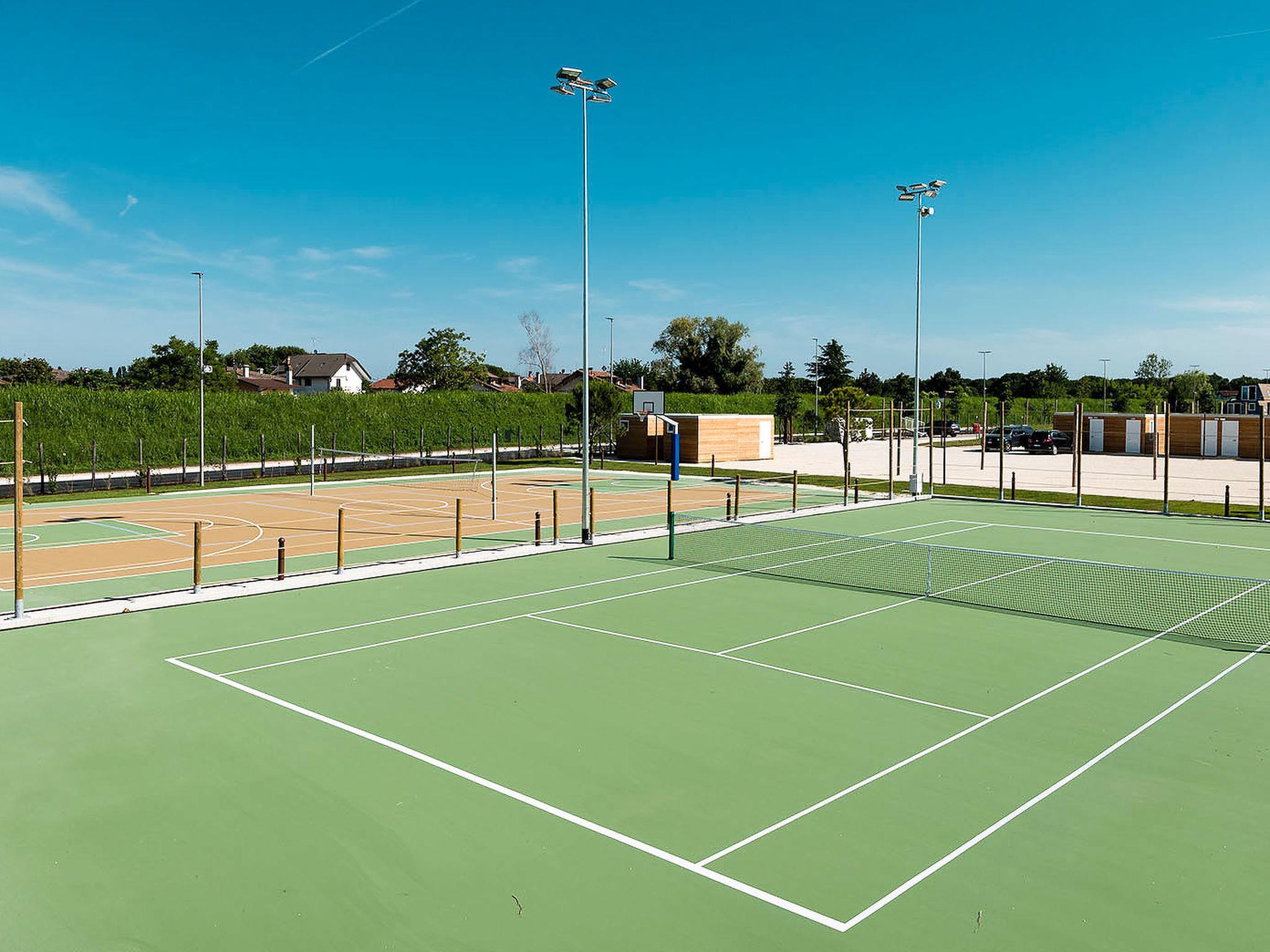 Beautiful resort "Marina Azzurra Resort". 89 houses in the resort. In the district of Riviera 3 km from the centre of Lignano-Riviera, 6 km from the centre of Bibione, 95 km from the centre of Trieste, 3.5 km from the sea, directly by the river. For shared use: property 12 ha (fenced), large, well-kept garden with lawn and trees, swimming pool (450 m2, seasonal availability: 01.May. - 29.Sep.). Unconventional pool shape. Children's pool, hot tub, tennis, boccia, beach volleyball, barbecue, children's playground. In the complex: restaurant, bar, washing machine, tumble dryer (for shared use, extra), bicycle rental. Linen change weekly. Towel change 2 times per week. Room cleaning 2 times per week. Breakfast and half board possible (extra). Central parking spaces. E-charging station. Supermarket 5 km, bus stop 600 m, railway station "Latisana (Venezia-Trieste)" 18 km, sandy beach 3.5 km. Golf course (18 hole) 2 km, cycle lane 100 m. Nearby attractions: Pool-bar plus minimarket, Oasi Naturalistica Val Grande 8 km, Venezia 95 km, Golf Club Lignano: 20 % reduction on, green fee. Please note: car-free holiday complex. Beach service: From approx. beginning of May to approx. middle of September, 2 sun loungers and 1 parasol per flat are included in the rental price.