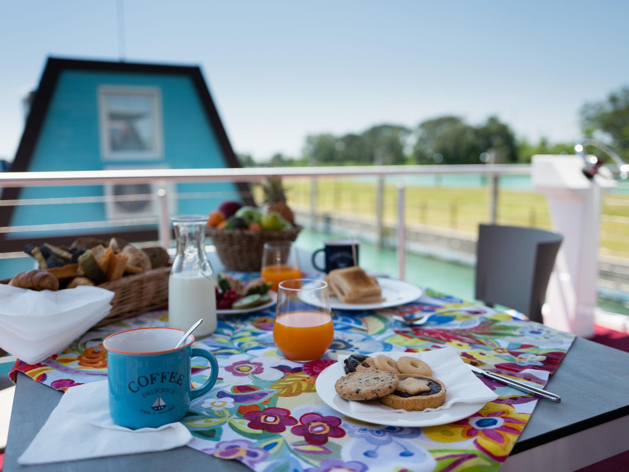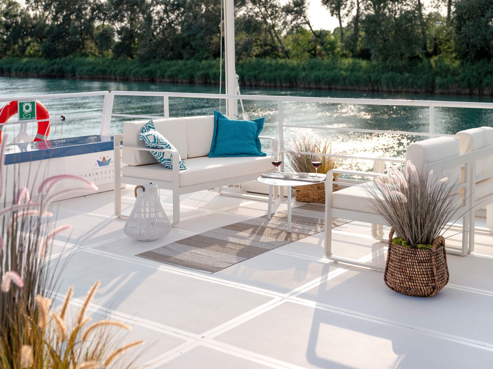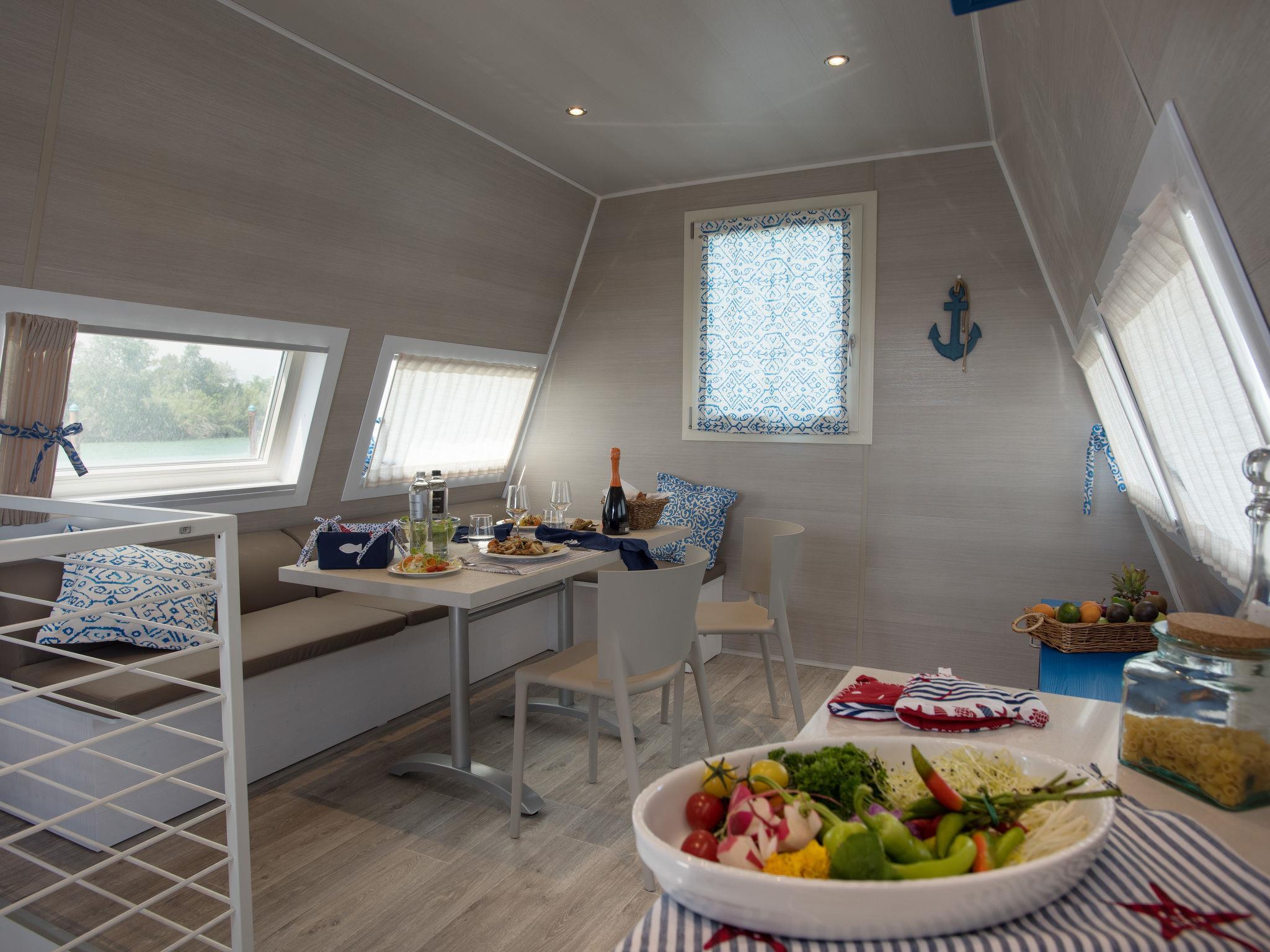 "Houseboat River", 4-room house 65 m2 on 2 levels. Very beautiful and stylish furnishings: living/sleeping room with 1 double sofabed, dining table and satellite TV. Exit to the terrace. 1 double bedroom with Dressing room. 1 room with 2 beds. Shower/WC. Upper floor: dining room with kitchen corner. Exit to the terrace. Open kitchen (2 induction hot plates, microwave, electric coffee machine). Air-conditioning, forced-air heating. 2 terraces. Terrace furniture, box-room. Facilities: mosquito net. Internet (WiFi, free). Maximum 3 small pets/ dogs allowed. These houseboats are safely anchored along the Tagliamento River. IT030049B9DK9LFPRA