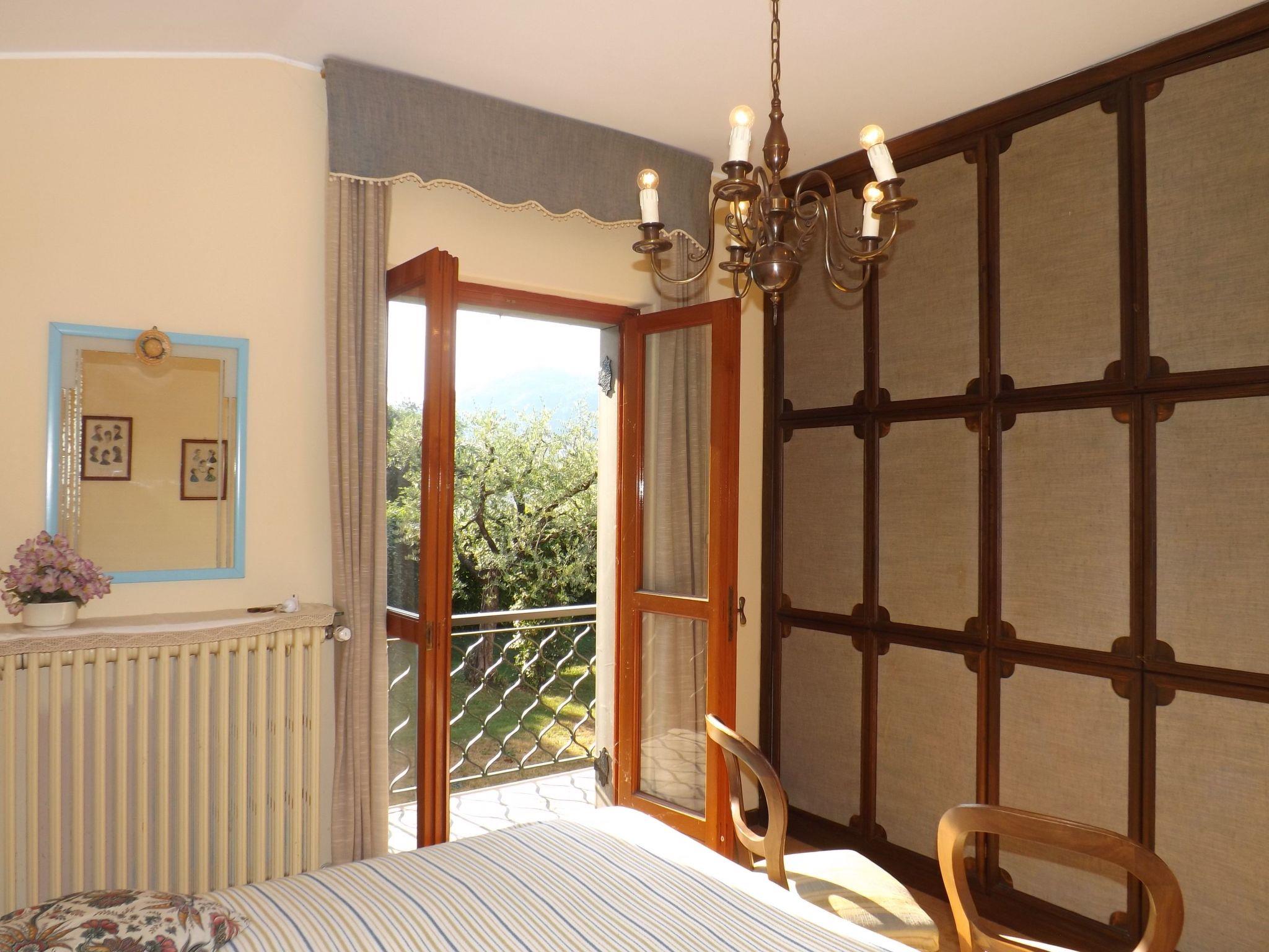 This charming private period villa is built on a plot of 1000 m². The garden is well maintained and boasts numerous flowers and olive trees. The property is completely fenced off. From the back garden, you enter the villa on the ground floor through an entrance hall that leads directly to a spacious living room with sofas and dining table. The living room is connected via a glass door to a large covered terrace with a beautiful view of the lake. It is equipped with a table for 8 persons and two sun loungers. The entrance also leads to the separate, fully equipped kitchen and the sleeping area, where there are two double bedrooms and one complete twin bedroom (with shower). All the rooms on this floor have glass doors opening onto the terrace. On the ground floor is a large room with an imperial table and fireplace, which can be used for dining and barbecues. Also on this floor are two further double bedrooms and another full bathroom (with tub). The ground floor also has a laundry room with washing machine.