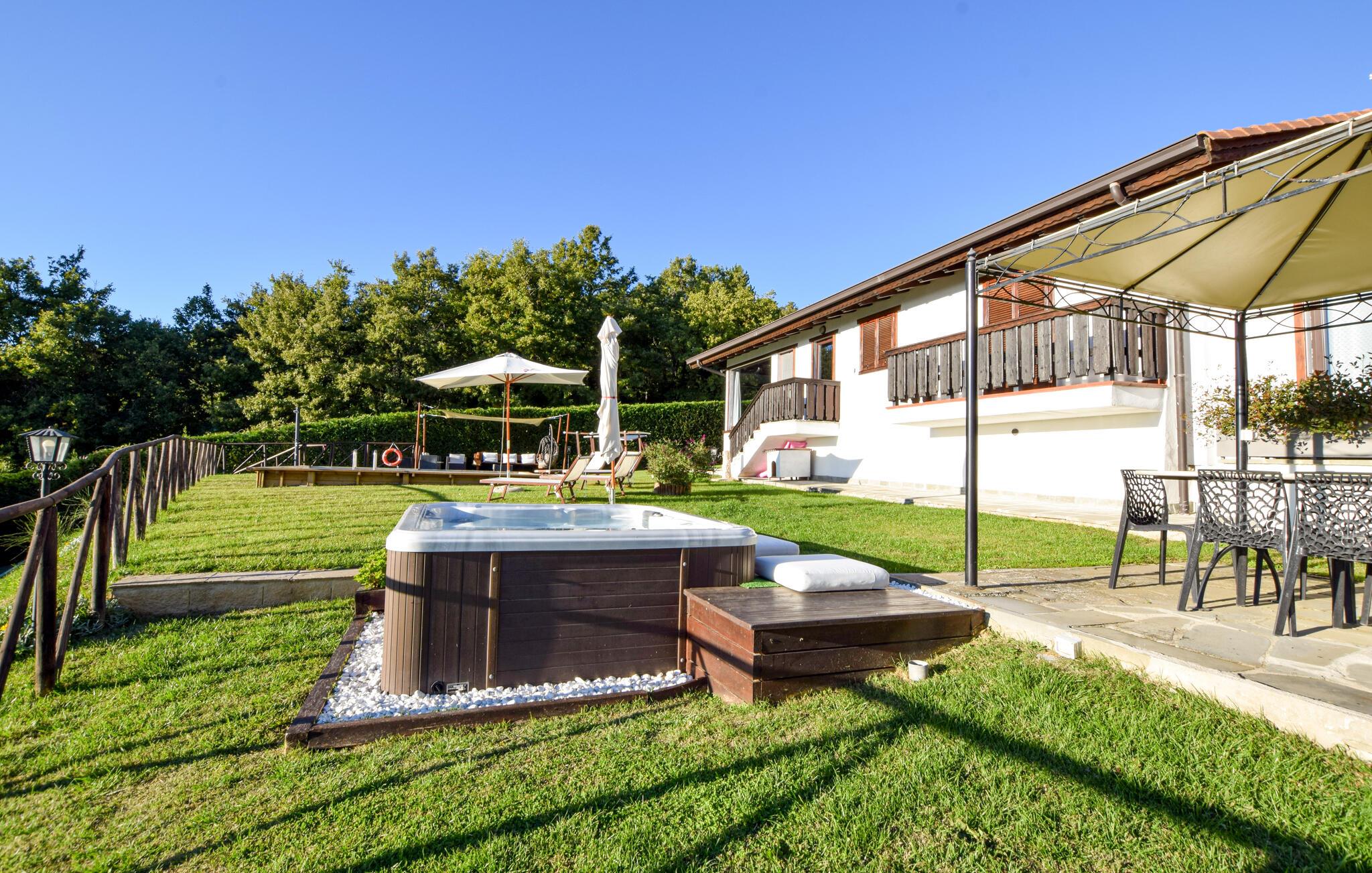 Dette rummelige hus i Lisciano Niccone har alt, hvad I skal bruge til en uforglemmelig ferie. Den smagfulde indretning med træpaneler skaber en varm og indbydende atmosfære. Talrige værelser og et wellness-område med sauna og boblebad lægger op til at slappe af. Den panoramiske spiseplads og balkon er perfekte til at dele måltider med en fantastisk udsigt. I haven med udendørs spabad og pool kan I nyde freden og forfriskningen og lade blikket vandre over det maleriske landskab.
