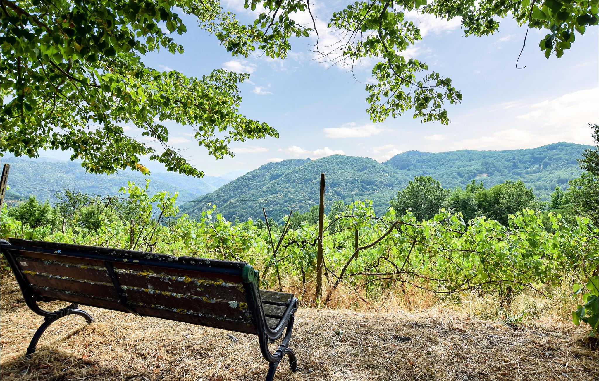 Klassisk italiensk stenhus med smuk naturterrasse og udsigt til bjerge og skove.