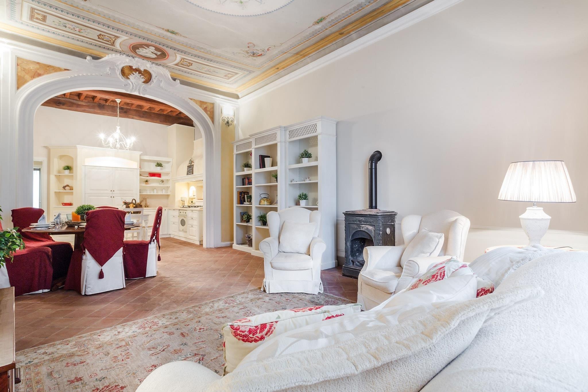 Træd ind i en smukt renoveret lejlighed, der legemliggør Luccas charme og historie. Kun få skridt fra den fantastiske katedral San Martino og lige rundt om hjørnet fra det ikoniske Guinigi-tårn, fungerer dette lyse og indbydende tilflugtssted som en ideel base for dine toscanske eventyr. Beliggende inden for Luccas gamle mure, tilbyder denne tidligere residens for en fremtrædende silkehandlerfamilie fra 1400-tallet en unik blanding af historie og modernitet, hvilket gør den perfekt for rejsende, der er ivrige efter at udforske byen og dens fortryllende landskab. Beliggende på anden sal, tilgængelig med elevator, kan denne lejlighed prale af en rolig beliggenhed i et malerisk, gåvenligt område. Kvarteret er fyldt med dejlige pizzeriaer, charmerende caféer til morgenmad, bagerier og lokale dagligvarebutikker, hvilket sikrer, at du har alt, hvad du behøver, lige ved hånden. Nyd den pulserende lokale kultur ved at besøge det nærliggende ugentlige marked eller slentre langs den ikoniske promenade oven på Luccas gamle mure, mens du nyder den betagende udsigt over byen. Når du træder indenfor, vil du blive mødt af en elegant og rummelig planløsning på 100 kvadratmeter, der byder på moderne bekvemmeligheder kombineret med tidløst design. Den store stue fremviser originale malede lofter fra 1700-tallet, hvilket skaber en betagende atmosfære, der komplementerer de elegante, nye møbler. Med to hyggelige soveværelser, et fuldt udstyret køkken med alle nødvendige apparater og et overdådigt badeværelse med en stor indbygget bruser, lover denne lejlighed et dejligt ophold fyldt med komfort og stil, hvilket gør den til det perfekte hjem væk fra hjemmet under din Lucca-ferie. Bemærk: Turistskat skal betales på ejendommen.