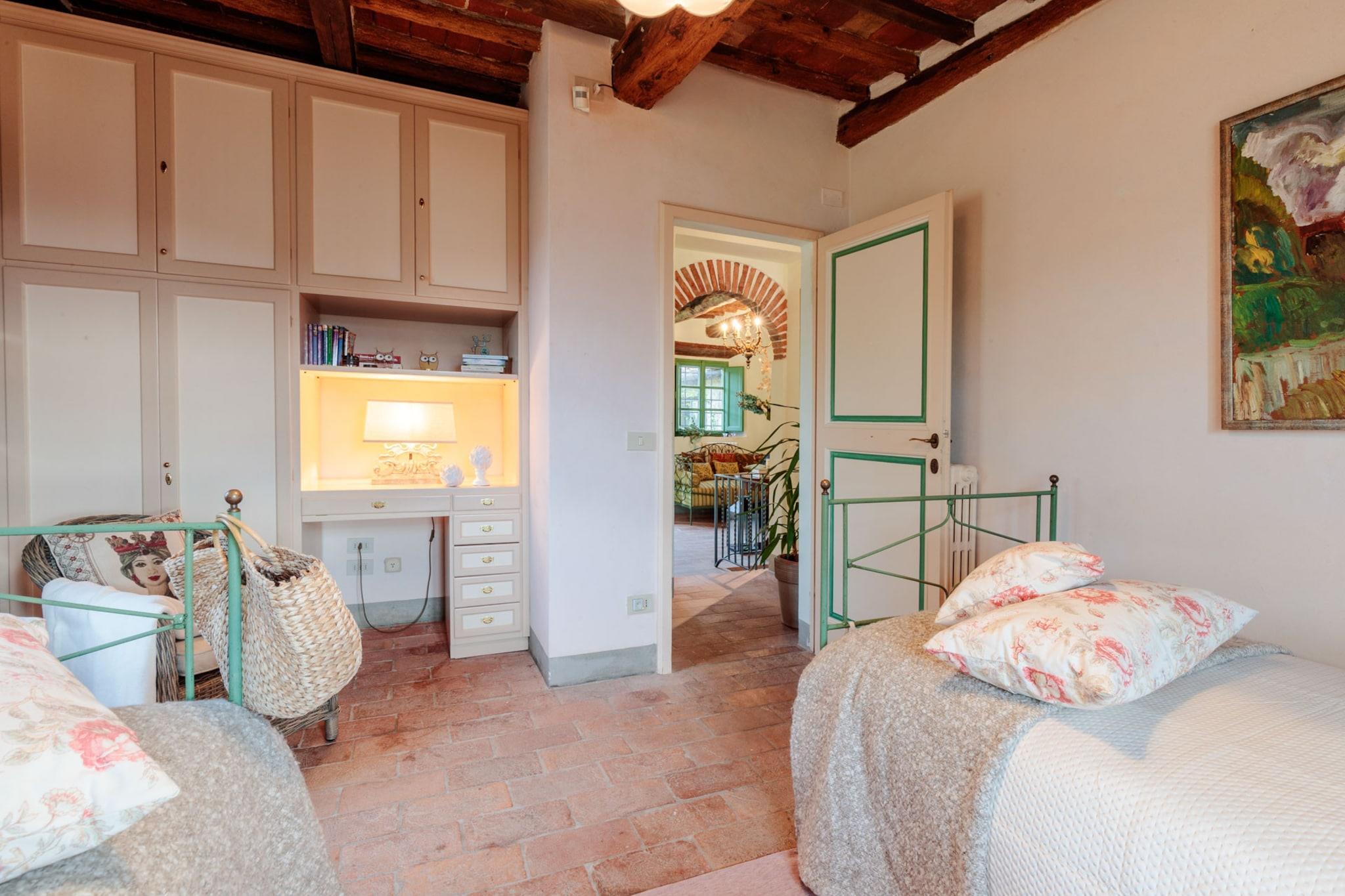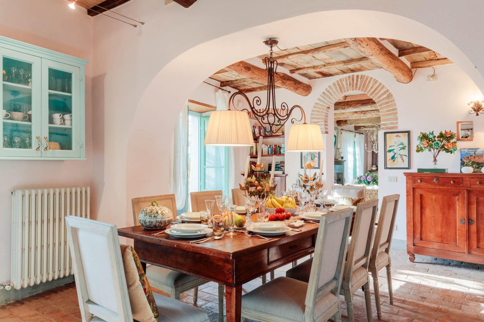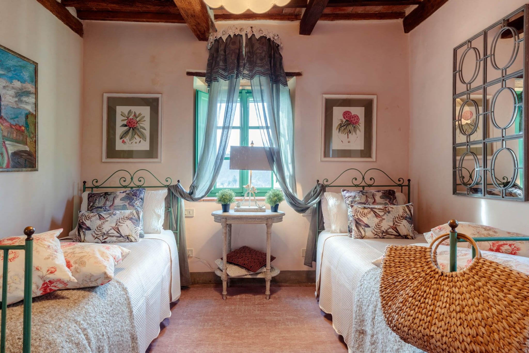 Beliggende mellem olivenlunde og bølgende bakker tilbyder dette rolige toscanske tilflugtssted en betagende udsigt over Luccas middelalderlige skyline og mod de fjerne bjerge ved havet. Ejendommen er omgivet af haver fyldt med urter, blomster og frugttræer og har en privat infinity-pool og tennisbane, mens naturskønne vandrestier starter lige uden for døren. Villaens traditionelle stukfacade og rustikke interiørdetaljer - hvælvede buer, trælofter og stengulve - skaber en varm, tidløs atmosfære, der smelter problemfrit sammen med de naturlige omgivelser. Villaen er perfekt til familier eller vennegrupper og strækker sig over tre etager og inkluderer fem smukt indrettede soveværelser, fire badeværelser og generøse fællesområder. Nyd at samles omkring det store køkkens antikke spisebord eller spise udendørs under den blåregnbeklædte veranda med udsigt over Freddana-dalen. De airconditionerede soveværelser i master-etagen og soveværelserne på øverste etage giver ekstra komfort, mens det udendørs marmorbord, lysthusloungen og siddepladserne ved poolen indbyder til lange, afslappende dage i solen. Kun 15 minutter fra Lucca og 25 fra strandene ved den versilianske riviera finder beliggenheden en perfekt balance mellem fredfyldt landlig atmosfære og adgang til kultur, vin og hav. Oplev charmerende middelalderlandsbyer, tag et madlavningskursus, nyd lokale vine, eller planlæg dagsture til Firenze, Pisa og Cinque Terre. En kort køretur ned ad bakken bringer dig til butikker, et bageri og restauranter. Bemærk venligst: Adgang via en typisk toscansk grusvej, og af sikkerhedsmæssige årsager er ejendommen ikke egnet til børn under seks år. Bemærk: Turistskat skal betales på ejendommen.