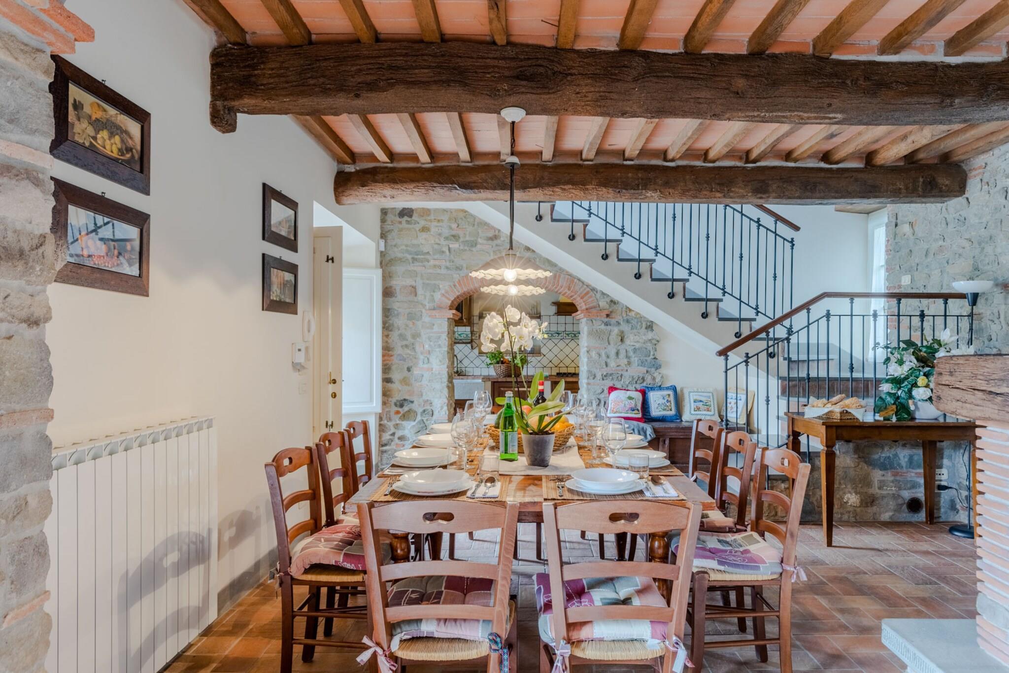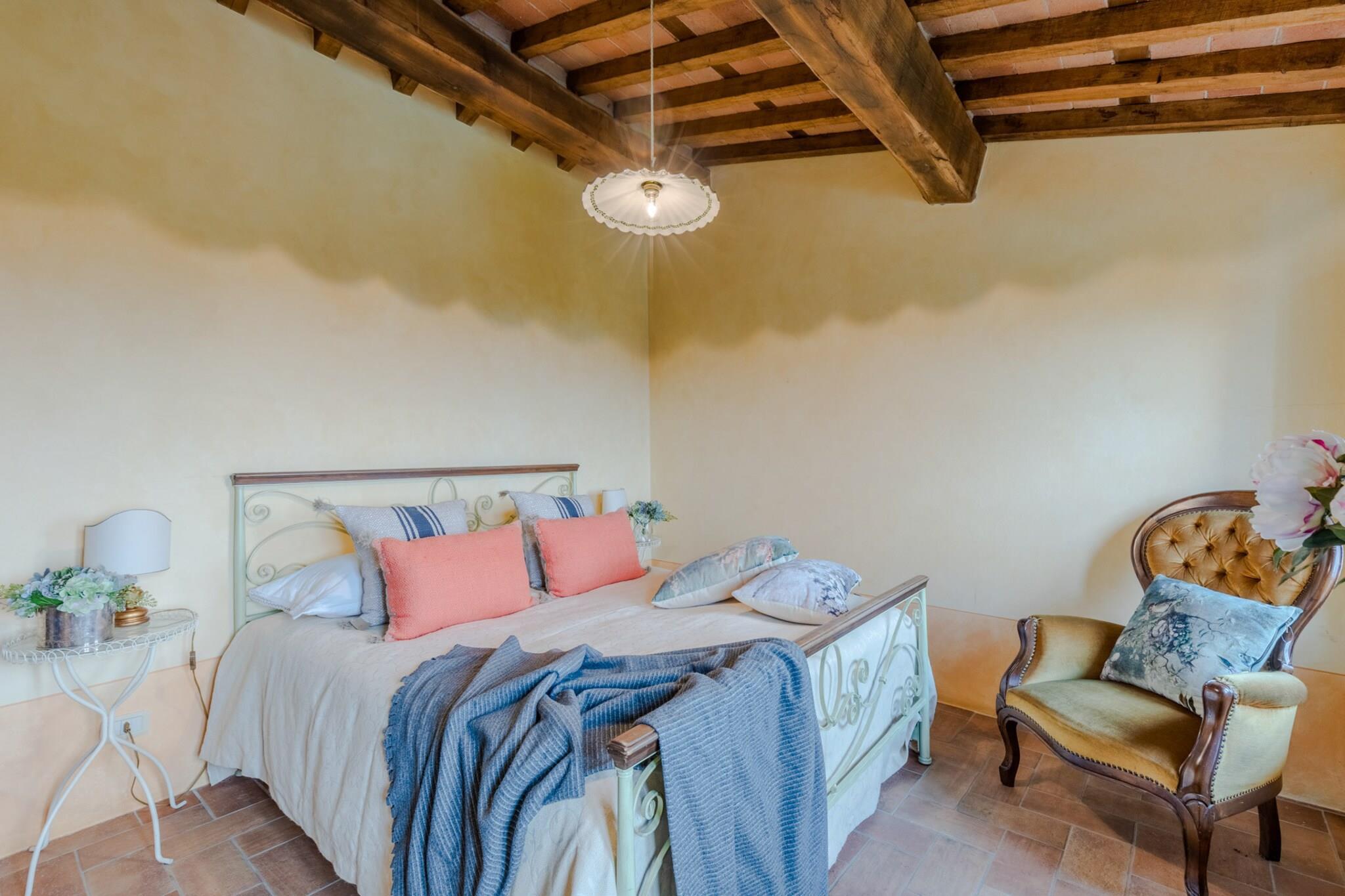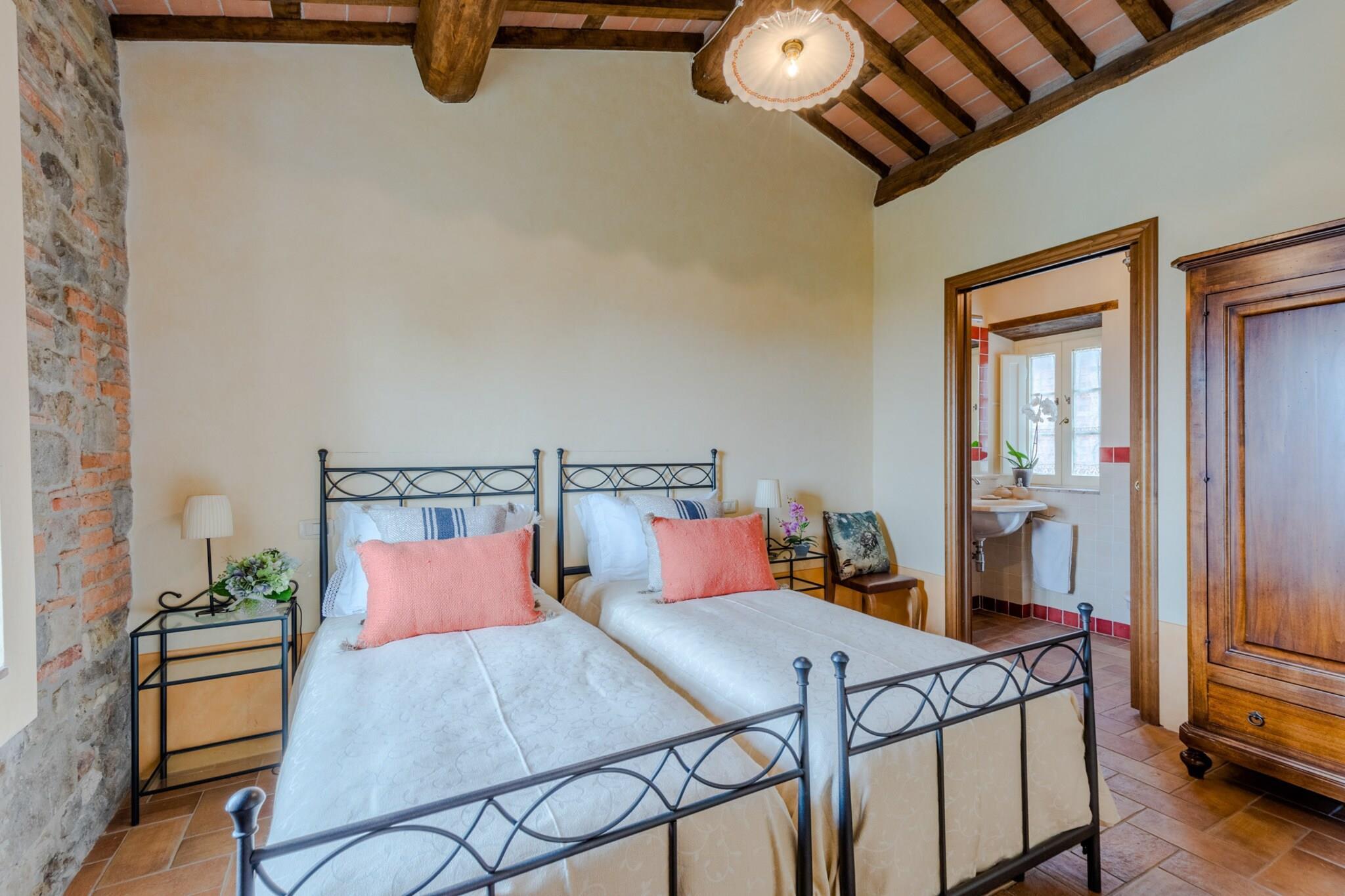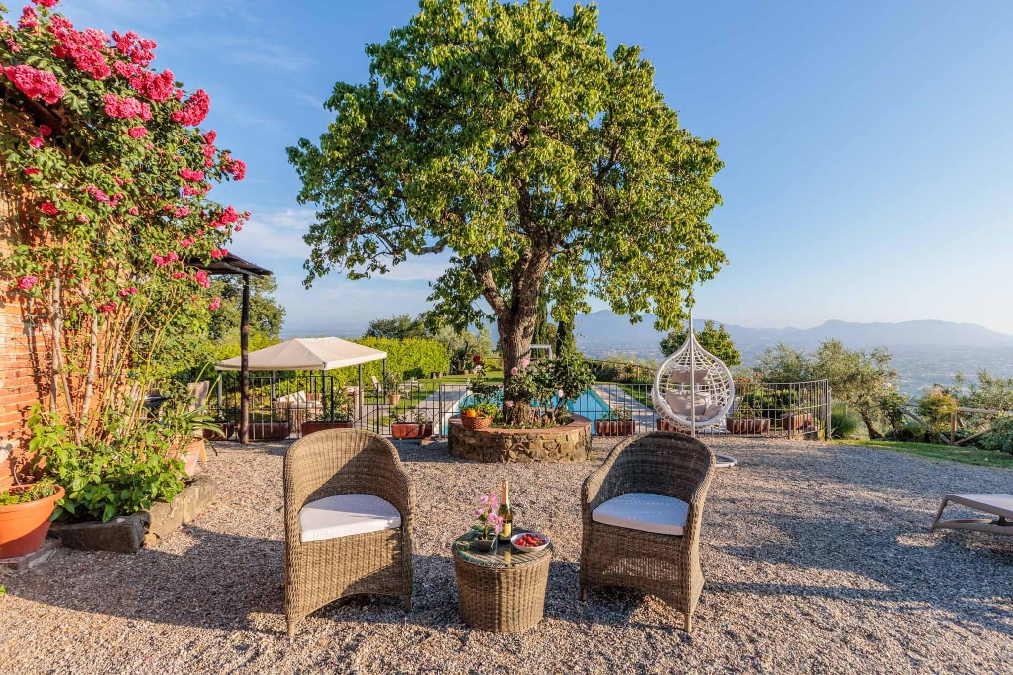 Beliggende blandt de bølgende bakker og berømte vinmarker i Valgiano, tilbyder dette smukt restaurerede stenbondehus en idyllisk flugt ind i hjertet af Toscana. Med en vidtstrakt udsigt over Luccas landskab blander dette tilflugtssted på en bakketop tidløs rustik charme med moderne komfort, hvilket gør det ideelt til en familiesammenkomst, en romantisk getaway eller en afslappende ferie med venner. Beliggende langs Toscanas berømte vinrute og omgivet af olivenlunde og lokale vingårde, er huset perfekt placeret til at udforske regionens kulturelle og naturlige skatte. Luccas historiske centrum ligger kun en kort køretur væk, mens populære dagsture som Firenze, Pisa, Cinque Terre, Volterra og sandstrandene i Viareggio og Forte dei Marmi alle er inden for rækkevidde. Både Pisa og Firenze lufthavne er bekvemt tilgængelige, hvilket gør ankomster stressfri. Villaens indbydende udendørsområder er designet til fritid og forbindelse: en glitrende swimmingpool med panoramaudsigt over dalen, liggestole til dovne eftermiddage og en overdækket spisepergola, ideel til udendørs måltider. Start dagen med en kop kaffe med udsigt over vinmarkerne, udforsk nærliggende markeder og vinmarker, og slap derefter af om aftenen med en aperitif under stjernerne. Indenfor er bondegården fordelt på tre etager og rummer komfortabelt større grupper. Fem omhyggeligt indrettede soveværelser, fire badeværelser, en hyggelig stue, et rummeligt køkken og en spisestue med rustikke bjælker og terrakottagulve bevarer charmen ved et traditionelt toscansk hjem, samtidig med at de tilbyder de faciliteter, der er nødvendige for et ubekymret ophold. Et vaskerum og højhastighedsinternet sikrer bekvemmelighed ved længere ophold. Bemærk: Turistskat skal betales på ejendommen.
