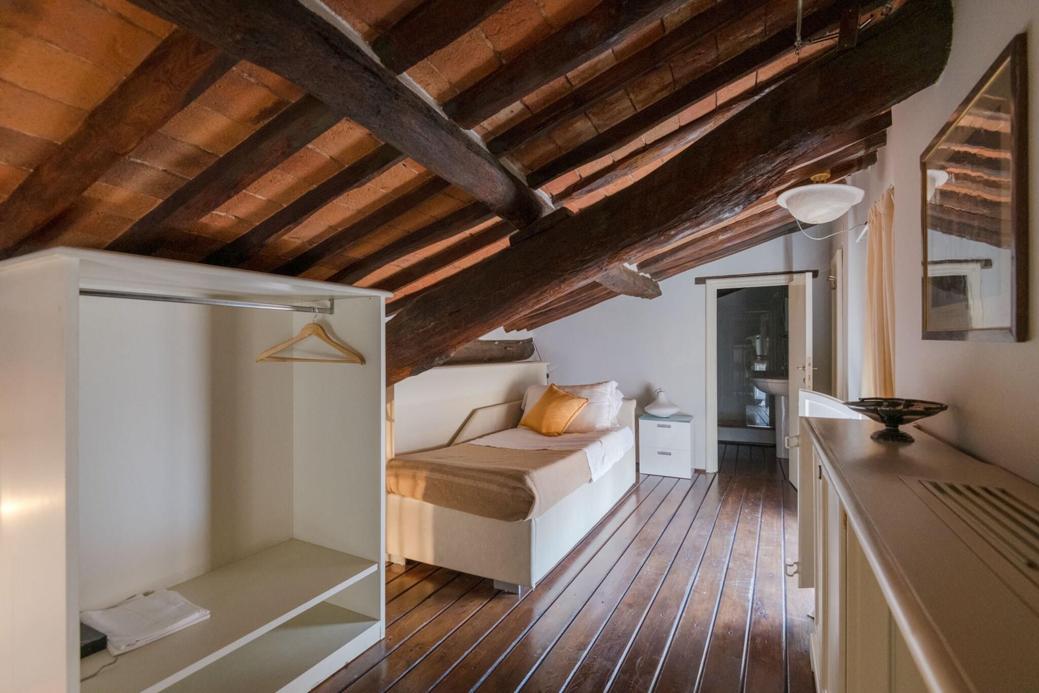 Træd ind i historien i denne charmerende lejlighed på Via del Gallo, beliggende i hjertet af Luccas kunst- og antikvitetsdistrikt. Huset på tredje sal blander historisk karakter med moderne komfort, omgivet af gallerier, boghandlere og kunsthåndværkerbutikker, der indfanger byens tidløse kreativitet. Lejligheden tilbyder et hyggeligt, men stilfuldt tilflugtssted. Soveværelset har en dobbeltseng og et lyst ensuite badeværelse med moderne inventar, hvilket skaber et roligt sted at slappe af. Den kompakte opholdsstue er perfekt til rolige aftener med en bog eller en kop kaffe. Det fuldt udstyrede køkken gør madlavning ubesværet med køleskab, ovn, mikrobølgeovn, opvaskemaskine, kaffemaskine, brødrister, elkedel og juicer, der er velegnet til alt fra hurtig morgenmad til gourmetmiddage. På trods af den centrale beliggenhed er bekvemmeligheden lige ved hånden: togstationen, busterminalen og nærliggende parkering ligger kun 10 minutters gang væk, hvilket giver nem adgang til at udforske byens mure. Yderligere bekvemmeligheder inkluderer aircondition, Wi-Fi, tv, strygejern og hårtørrer. En højstol og barneseng er tilgængelige efter anmodning. Denne lejlighed tilbyder ikke bare et ophold, men en oplevelse – en perfekt base for at udforske Luccas historiske gader, pulserende kultur og kunstneriske arv, mens man nyder privatlivet og charmen i et hjem i bymidten.