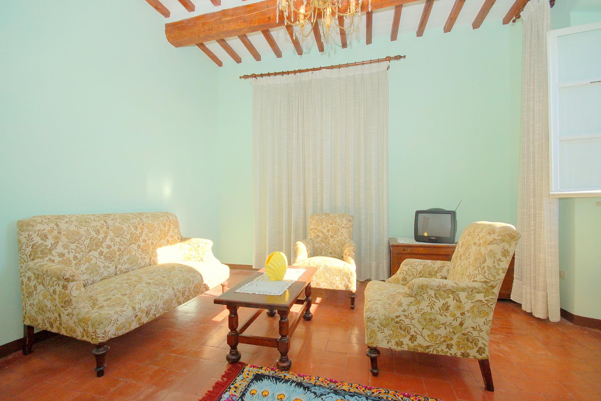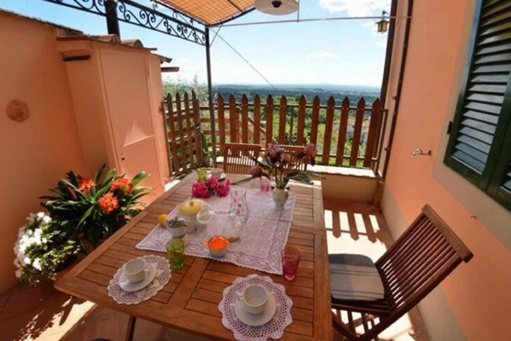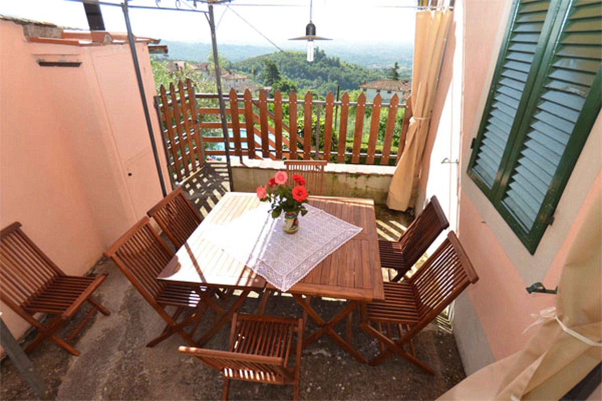 “Alla Collina del Sole” is a comfortable part of a house set in a sunny and scenic position on the hills north of Lucca within the small village of Ciciana. Situated within a lovely landscape cut into smooth hills, with vineyards and olive groves, the holiday home provides a pleasant and relaxing place to spend your holidays. An external area equipped with a table and chairs, a well cared terraced garden and a pool (above the ground, octagonal shape, made of wood 5x4 m, depth 1,40m) provide a further attraction for those who like to be outdoors and get the most out of long summer days. The surroundings of the house have a lot to offer to visitors who visit for the first time this region: quaint, little hamlets, historic villas with magnificent parks, delicious restaurants and the wine route which winds on the hills all around Montecarlo, the wine area of Lucca. Some of the most famous Tuscan towns such as nearby Lucca, Pisa and Florence are an ideal destination for a day trip. The coast with its famous seaside resorts such as Viareggio, Lido di Camaiore and Forte dei Marmi is likewise easy to reach by car. The house is for the sole use of the guests: the 1st floor is inhabited and remains closed whereas two rooms on the ground floor are for the use of the owners and therefore not accessible to the guests. The house is built on terraced grounds, the entrance is on the 1st floor. The interiors consist of: hallway, living room with 1 double sofa-bed, 2 armchairs, window with wonderful views onto the valley, 1 double bedroom (beds may be divided), 1 double bedroom, kitchen/dining room with stove/oven, dish washer, washing machine, microwave, iron and ironing board, dining table. A couple of steps lower: 1 bathroom with bathtub/shower, wc and bidet. The outside of the house consist of a patio equipped with a table and chairs for al fresco dining and a terraced garden. From the house level some steps lead to the terrace below where guests have at their disposal a swimming pool. Parking space at roughly 30 m from the house along the road. Upon arrival guests will received a welcome pack from the owners with basic items.
