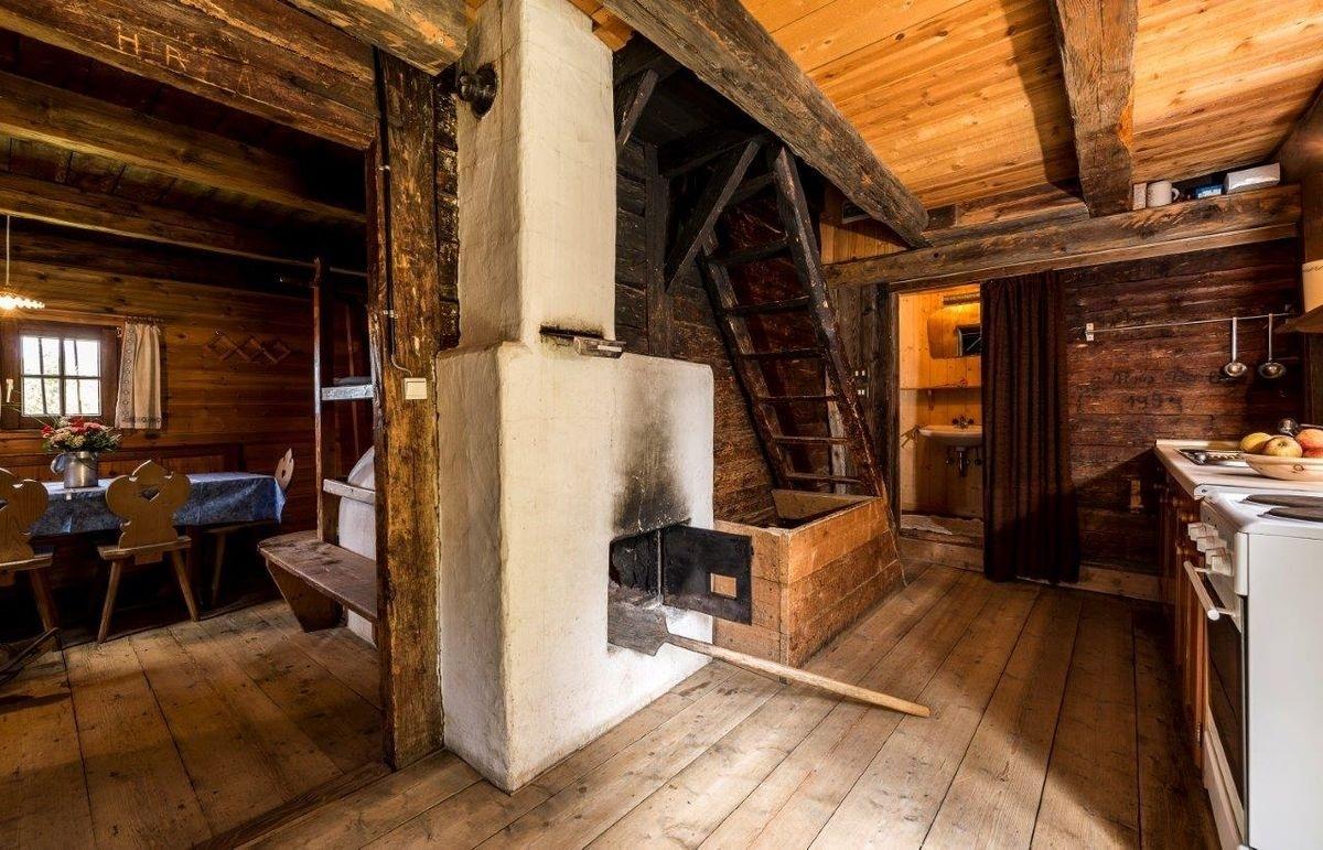 Herzstück der Hütte ist die Wohnstube mit Esstisch und Sitzbank sowie dem originalen Südtiroler Bauernofen, der für wohlige Wärme und echtes Hüttenfeeling sorgt. Beheizt wird die Hütte über diesen traditionellen Bauernofen sowie einen Pelletofen.