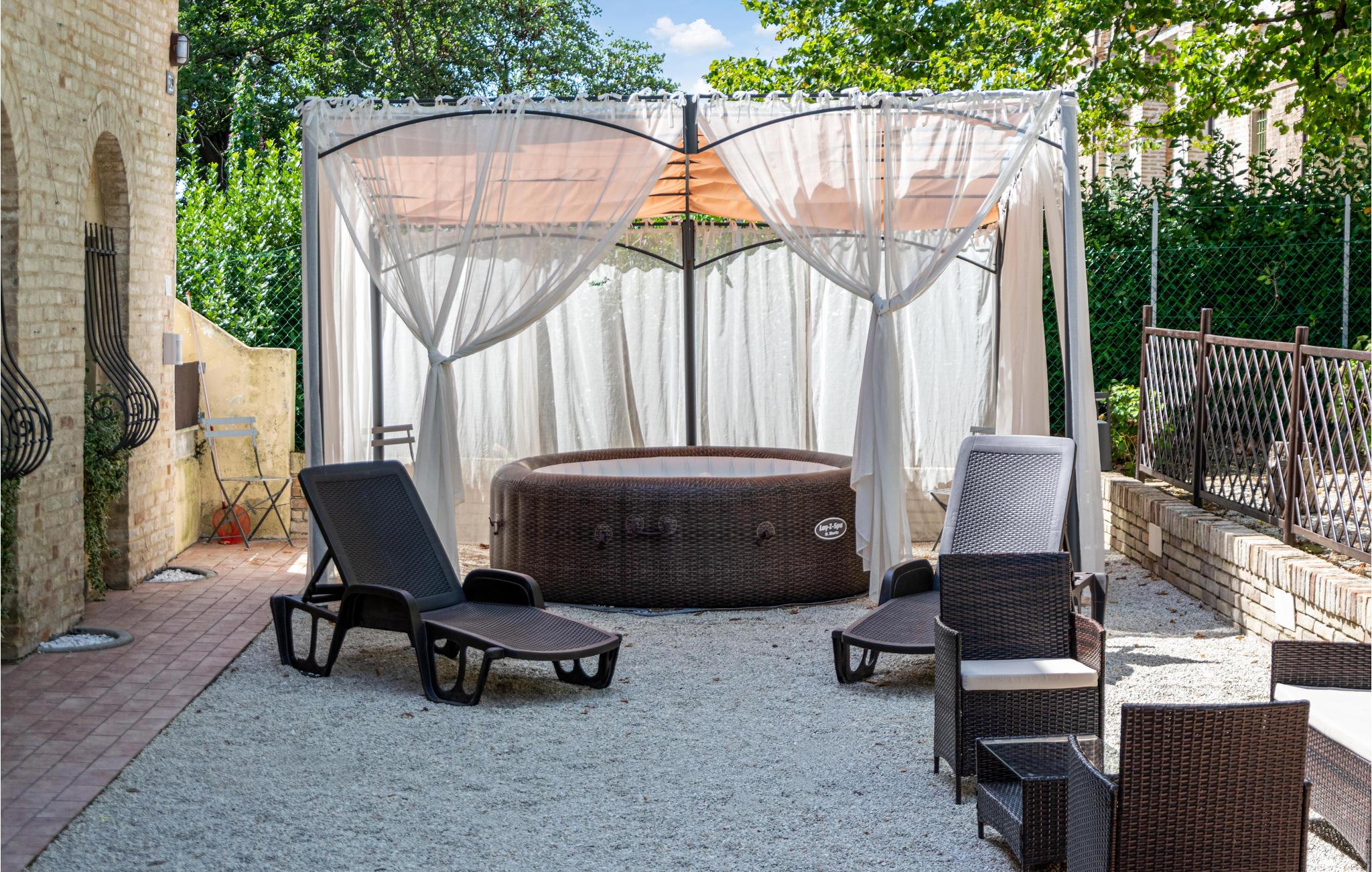 Nyd en afslappet morgenmad eller middag under åben himmel, omgivet af platantræernes blide skygge. Bagefter kan I slappe af i det varme spabad og mærke, hvordan havens ro fuldstændigt beroliger jer. Brug tid på at slappe af på liggestolene eller i pavillonerne og nyd blot den fredelige atmosfære under åben himmel.