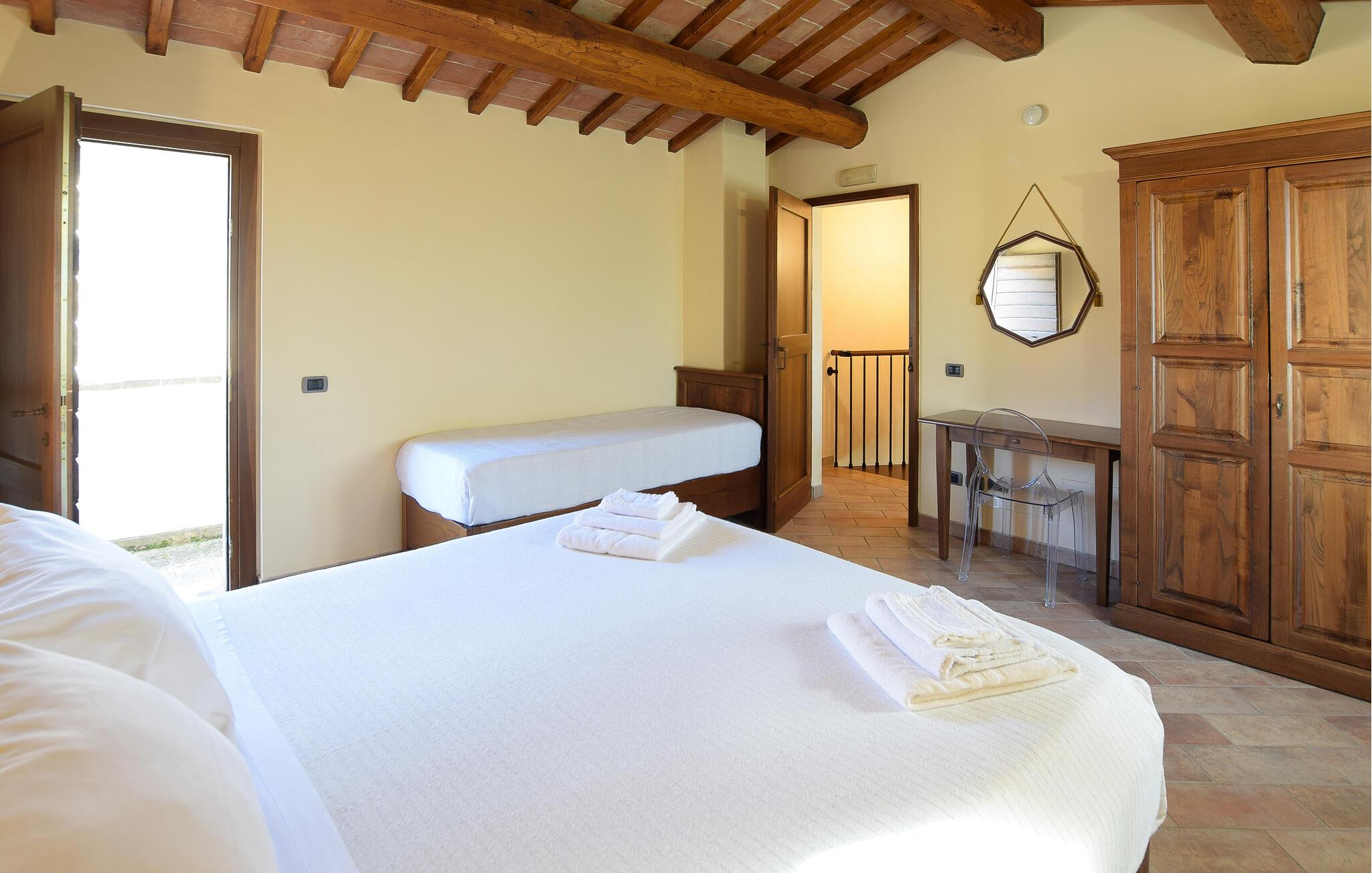 Denne flotte villa ligger smukt placeret i Italiens grønne hjerte, blot et par kilometer fra Trasimeno-søen. Boligen emmer af varme og en rustik atmosfære, hvor I ikke kan undgå at slappe og hygge jer med familien. I den åbne stue kan I nyde dagens måltider, og udendørs står den på rendyrket nydelse. Børnene kan boltre sig på deres private legeplads, mens I lægger jer godt til rette i liggestolene med udsigt over Umbriens frodige landskab. Når børnene har leget sig trætte, kan de køle sig ned og plaske rundt i den forfriskende pool.